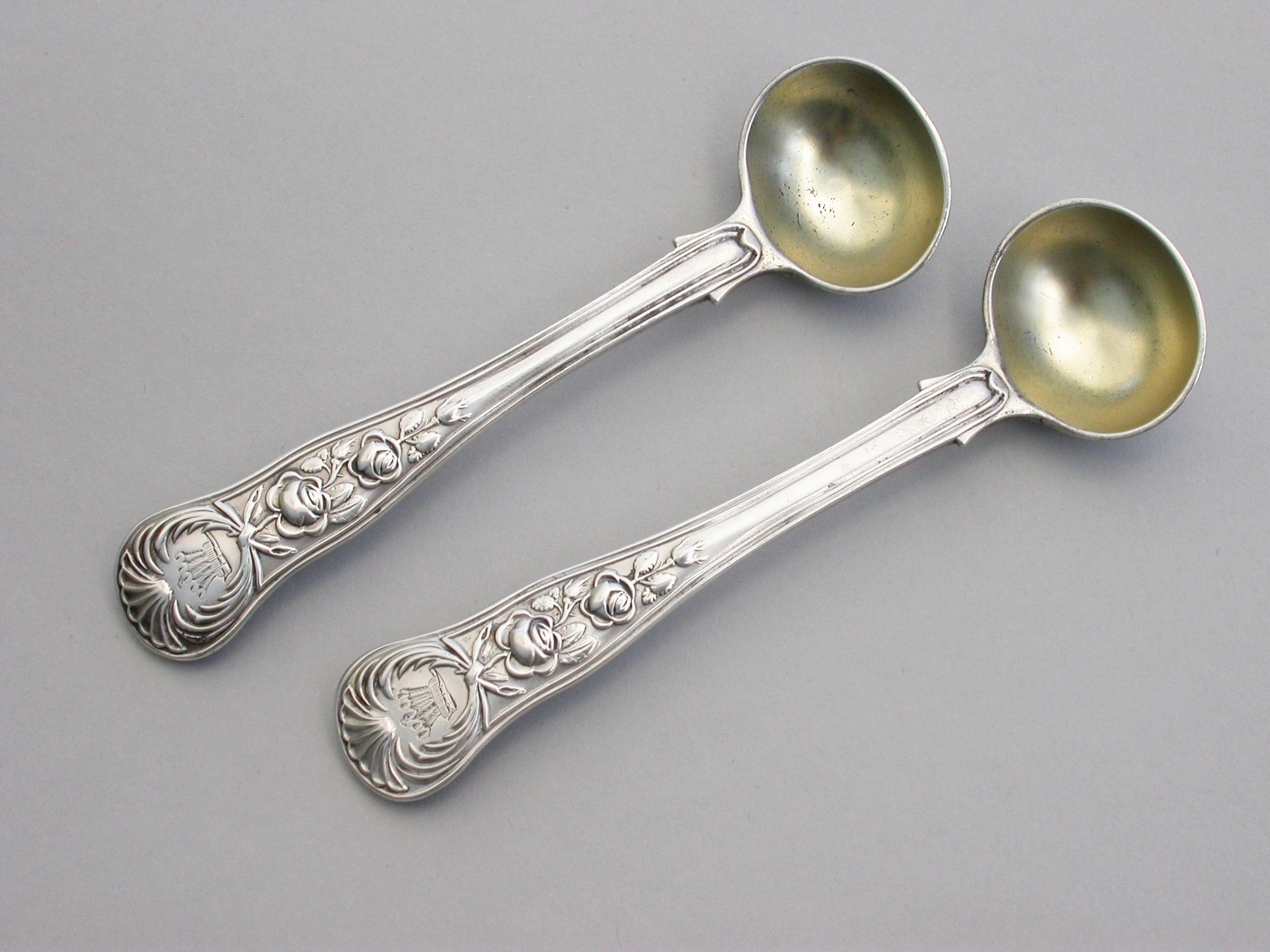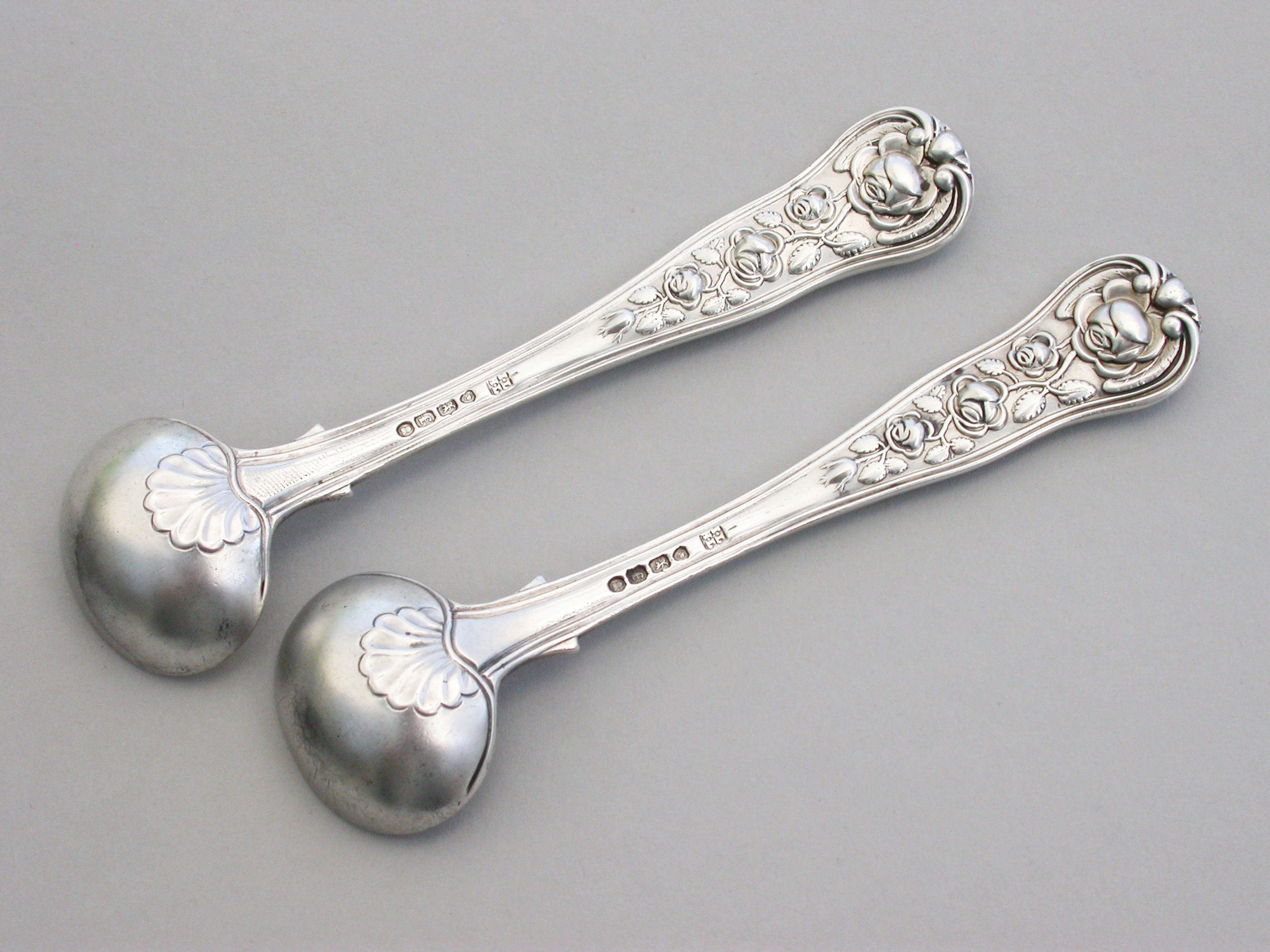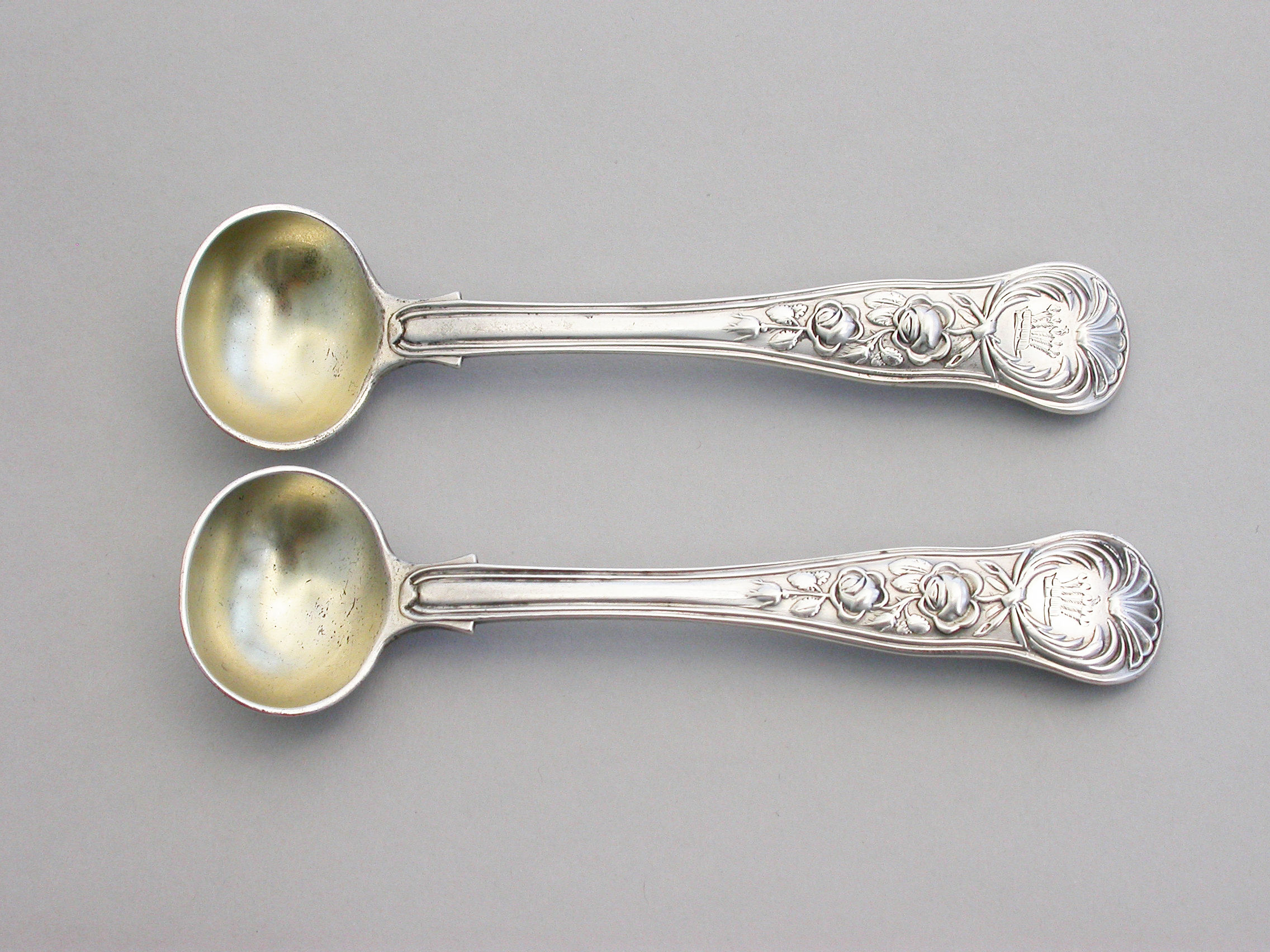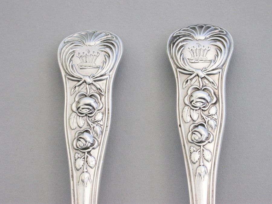 A rare and fine quality pair of George IV cast silver Salt Spoons in 'Rose Pattern', the handles engraved with contemporary crests.