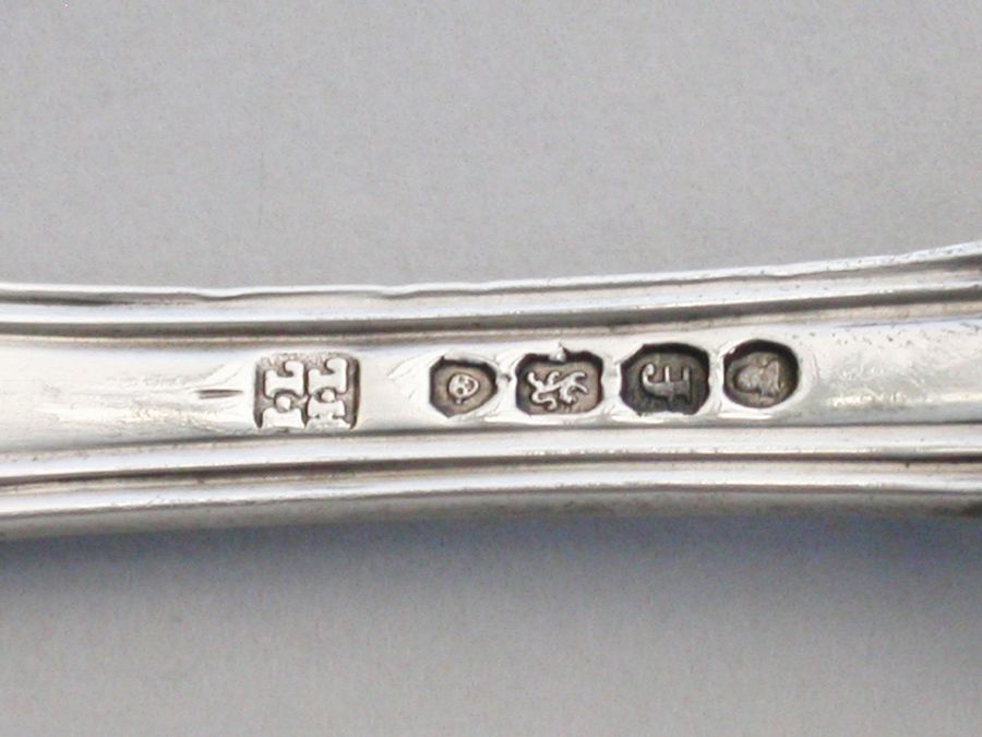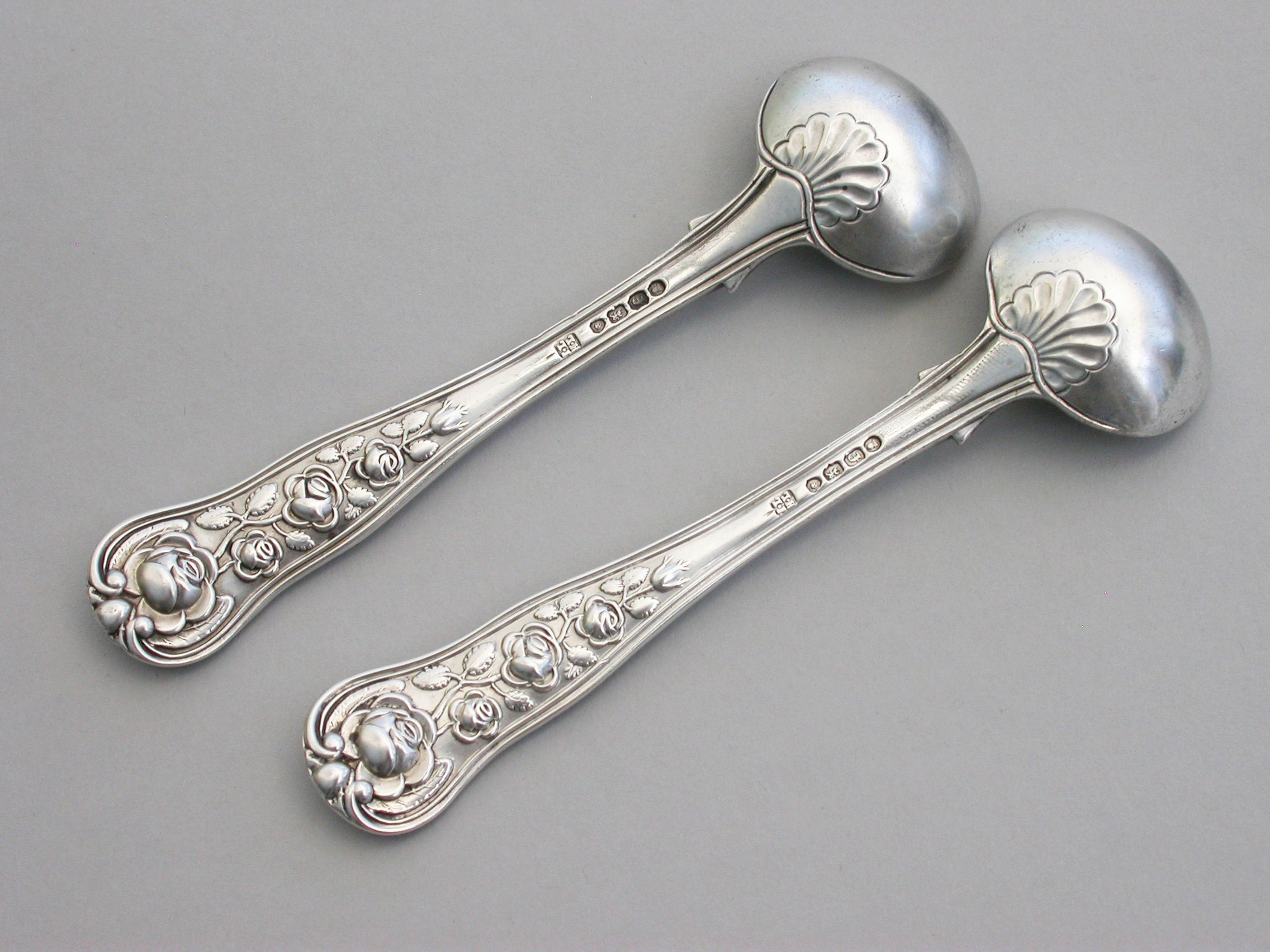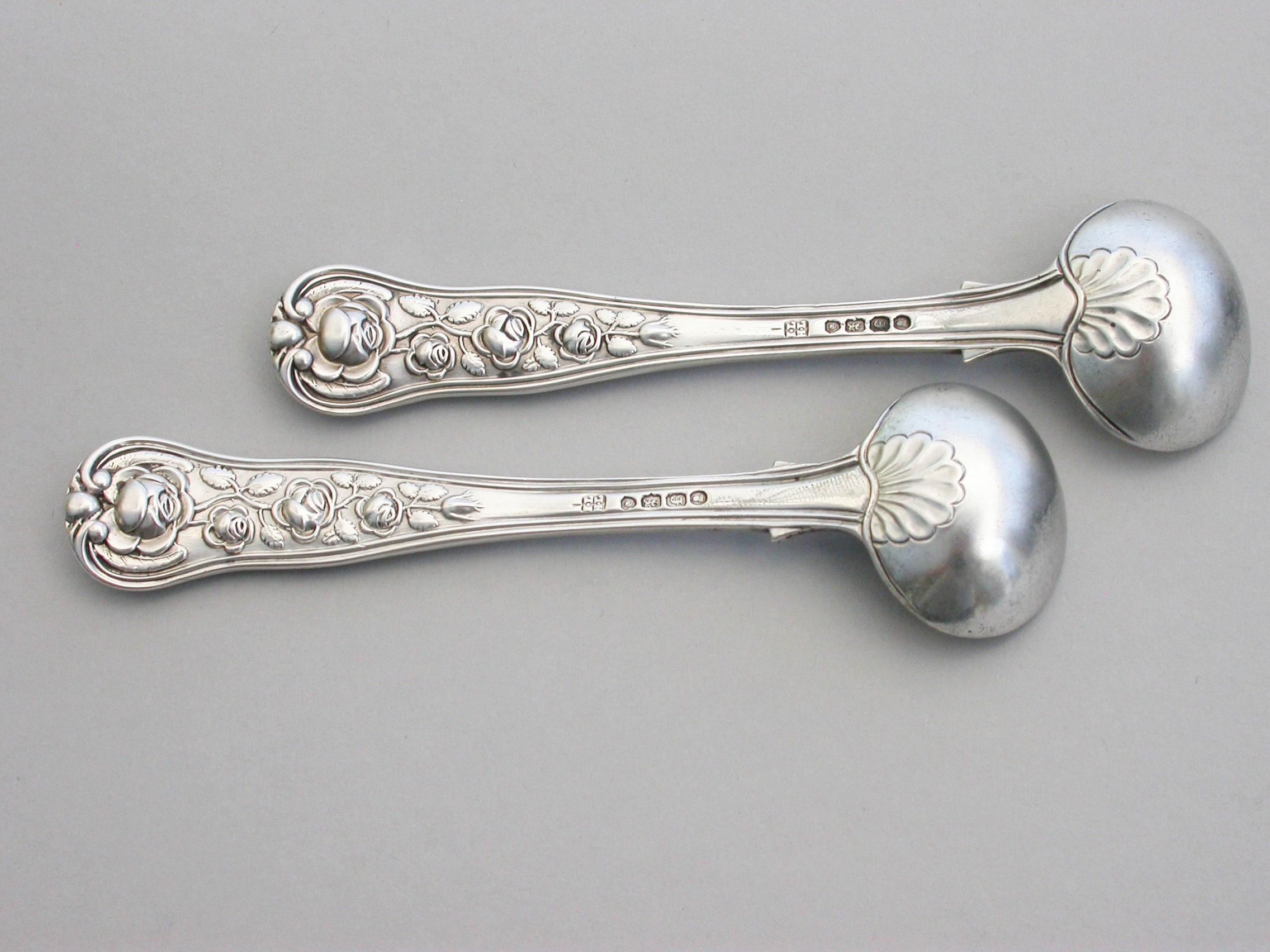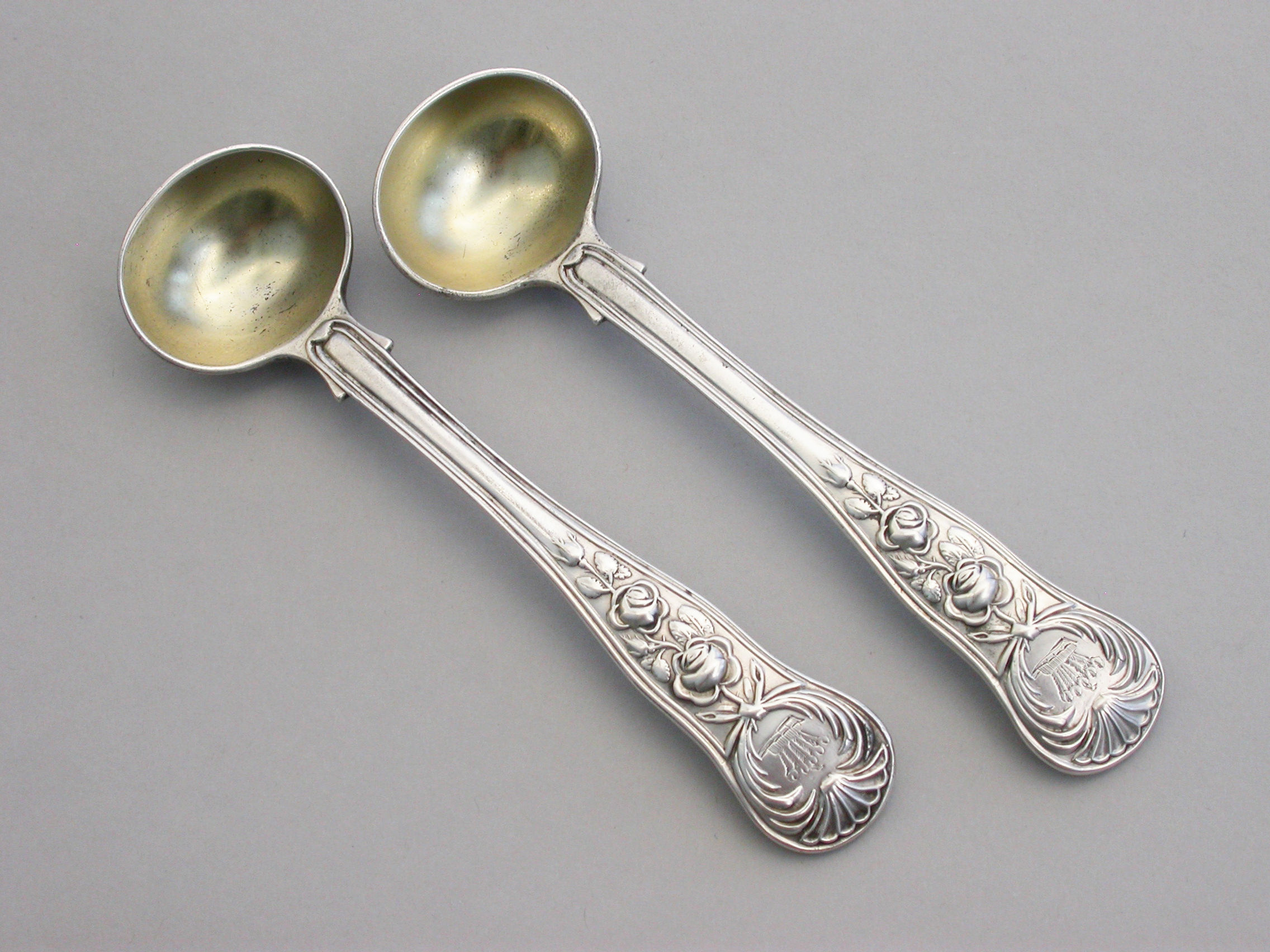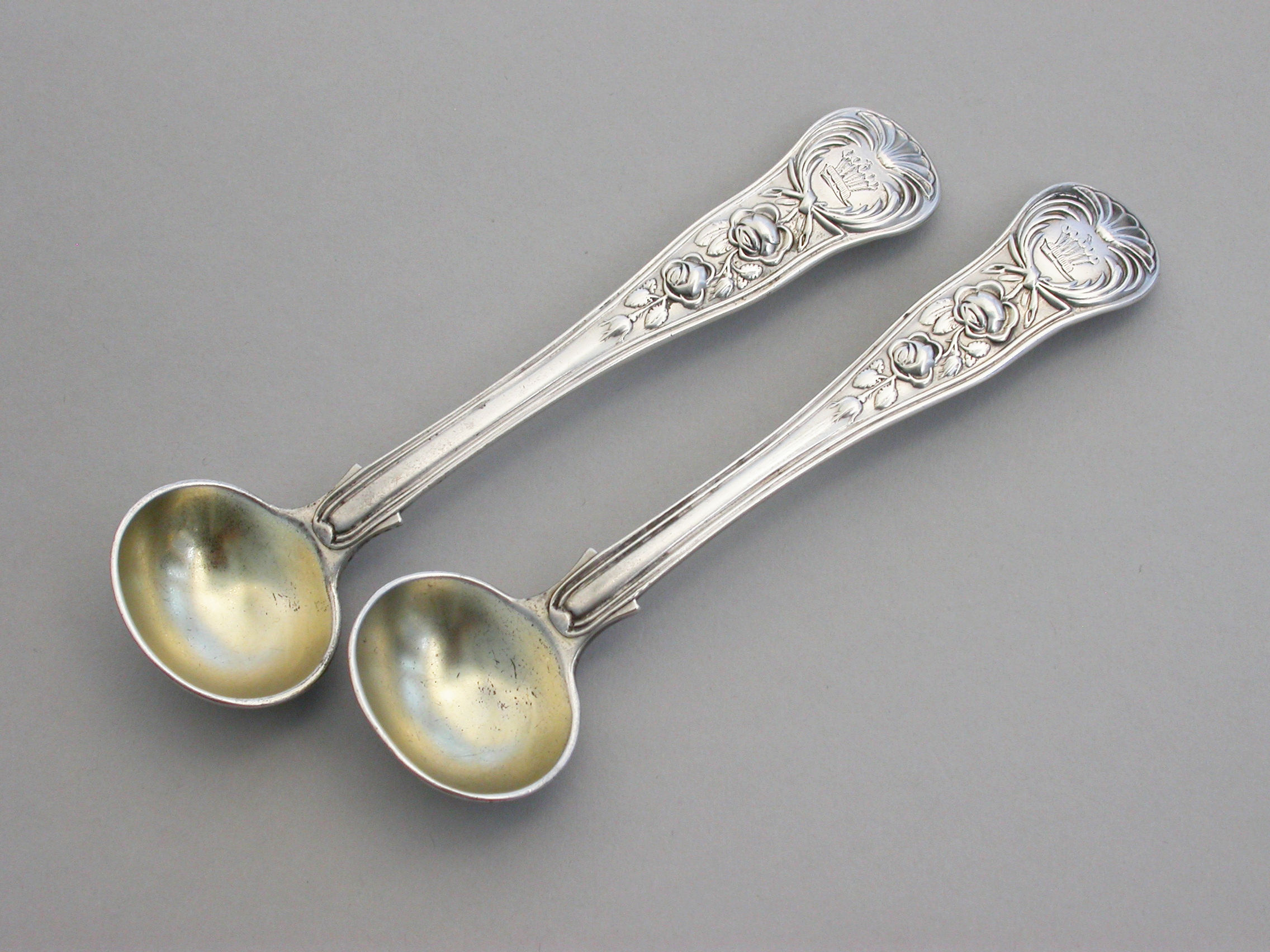 A rare and fine quality pair of George IV cast silver Salt Spoons in 'Rose Pattern', the handles engraved with contemporary crests.