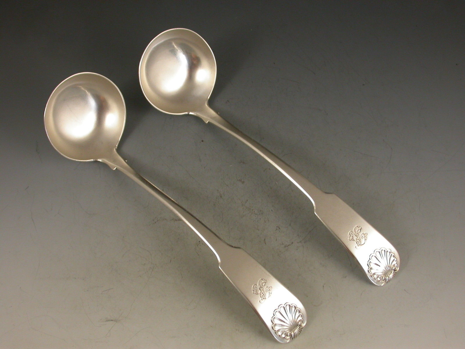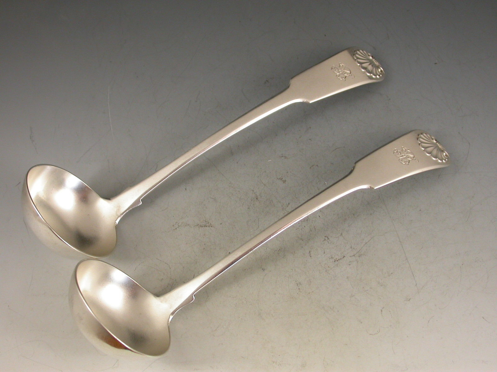 A good pair of George IV Scottish silver Toddy Ladles with fiddle and shell pattern handles engraved with a contemporary script initial.