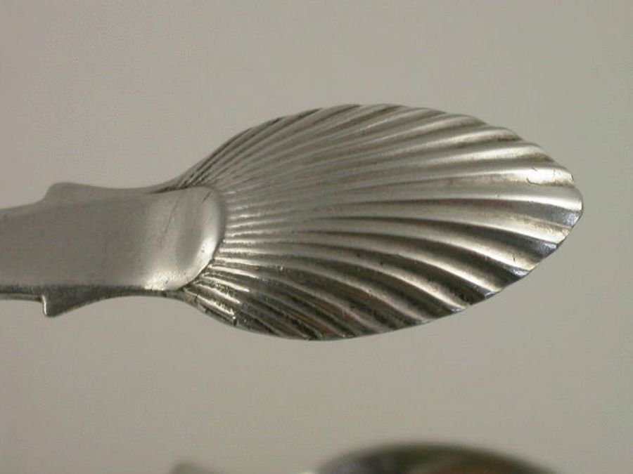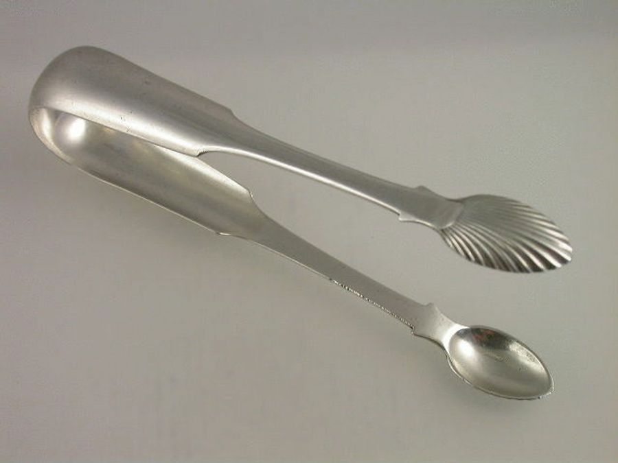 A good pair of George IV Scottish silver Sugar Tongs of plain fiddle pattern with large shell bowls, the bow engraved with contemporary initials.