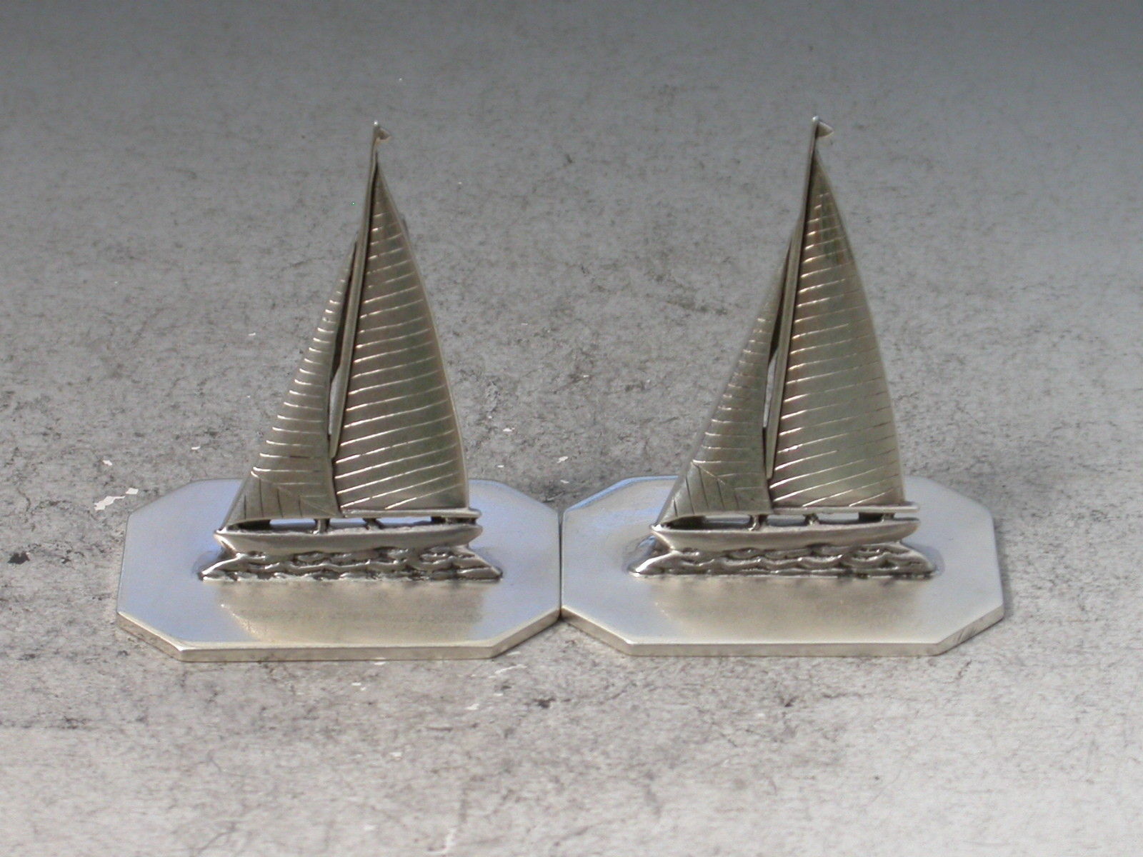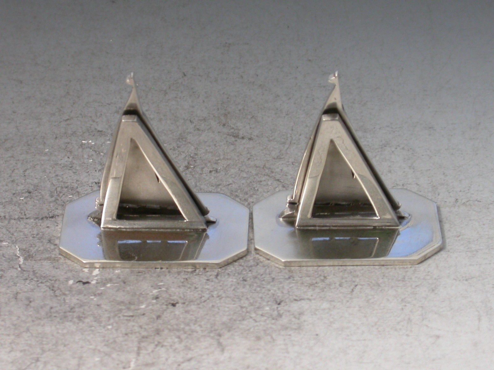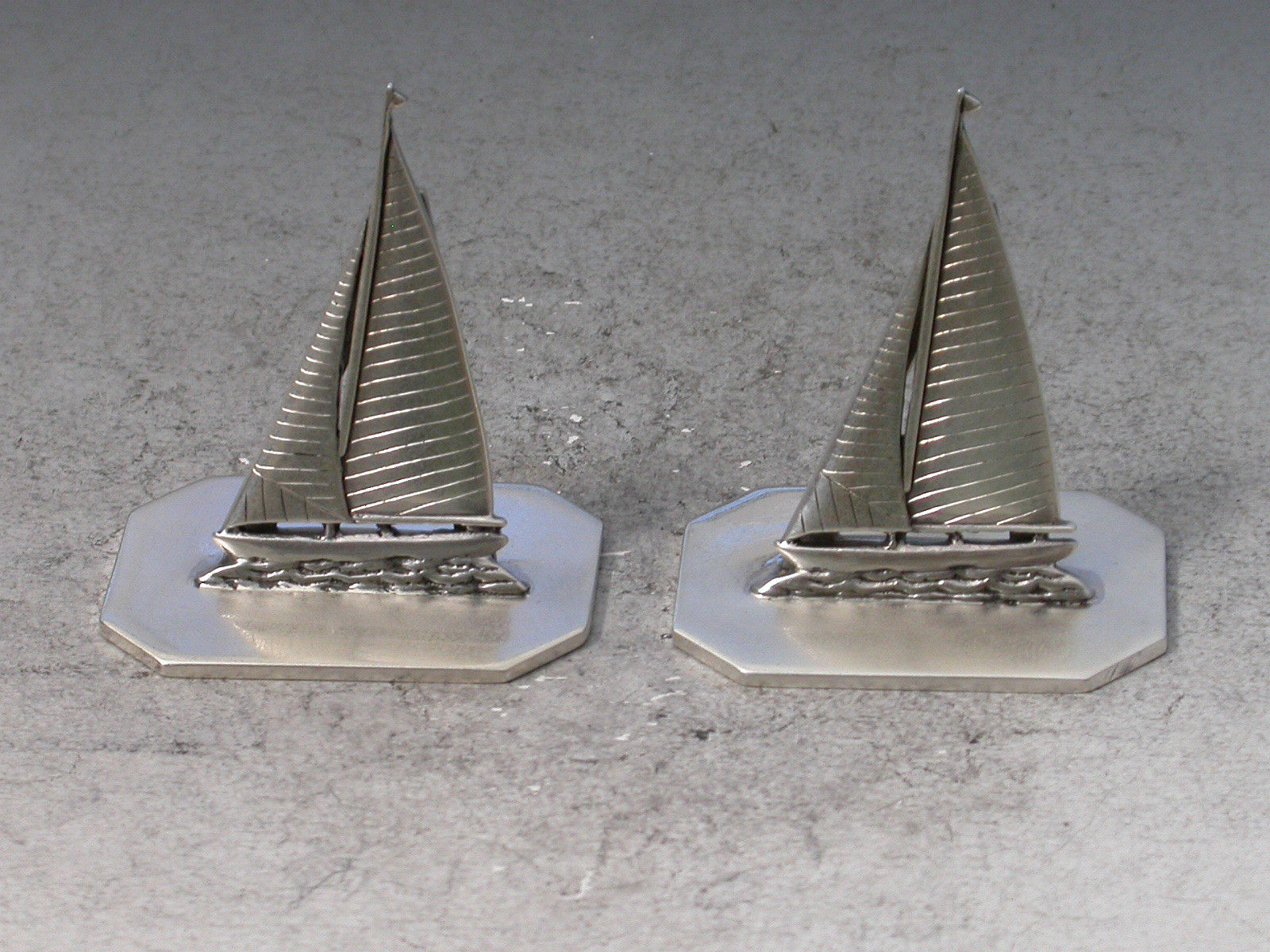 A good pair of George V silver Menu Holders depicting Sailing Boats, on flat rectangular bases with cut corners and triangular supports.