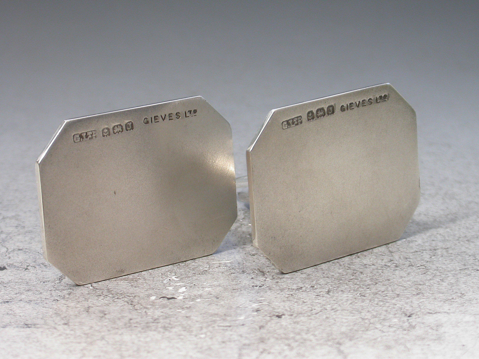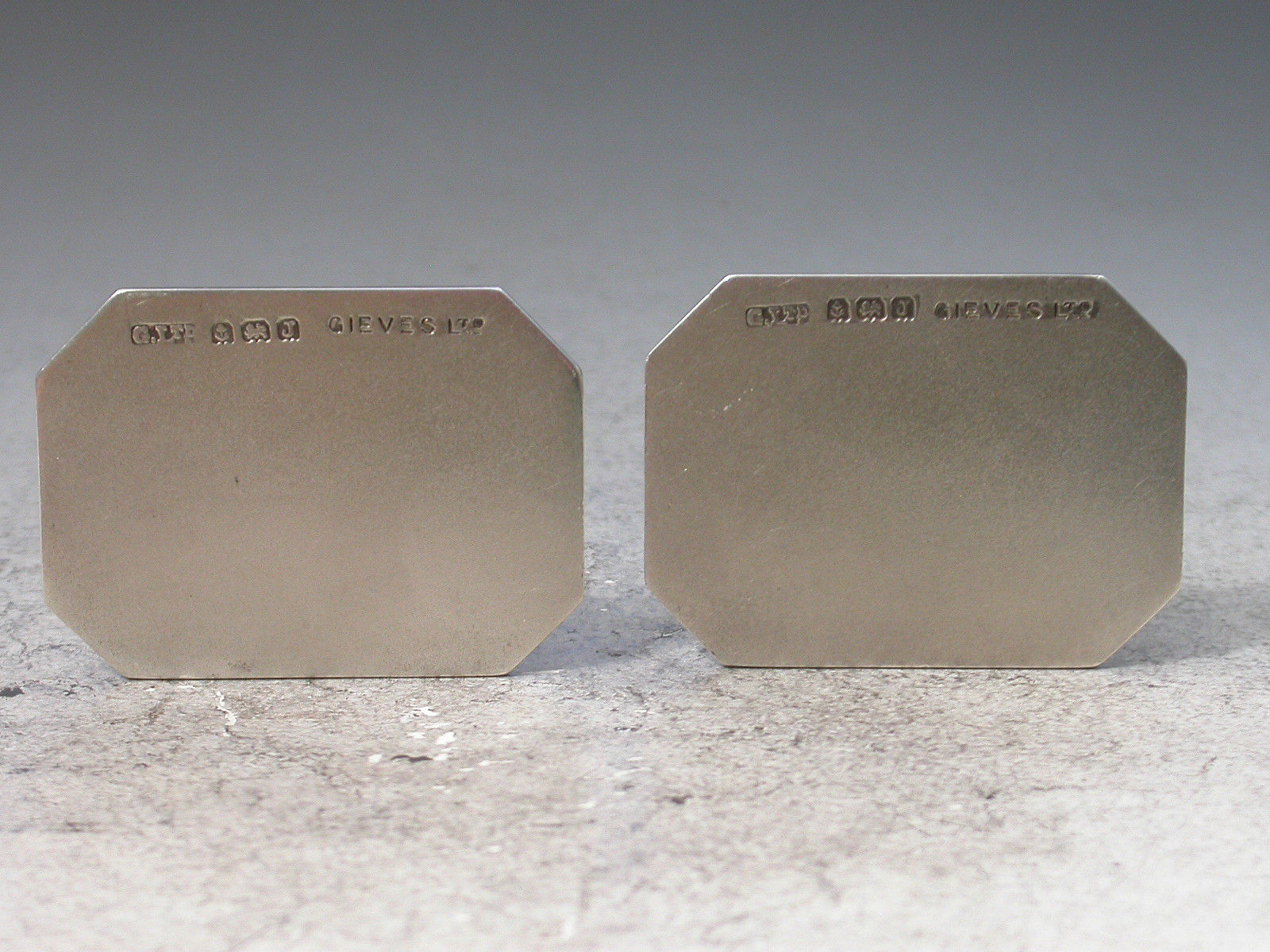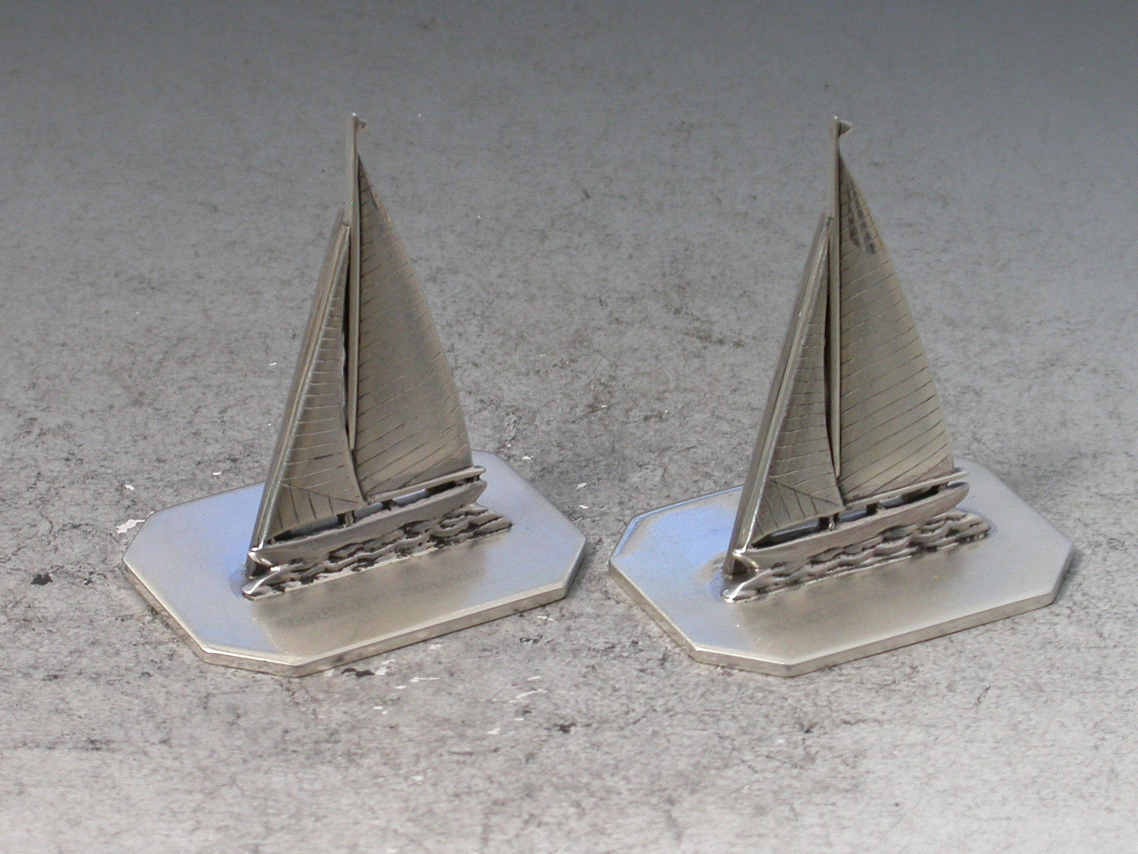 A good pair of George V silver Menu Holders depicting Sailing Boats, on flat rectangular bases with cut corners and triangular supports.