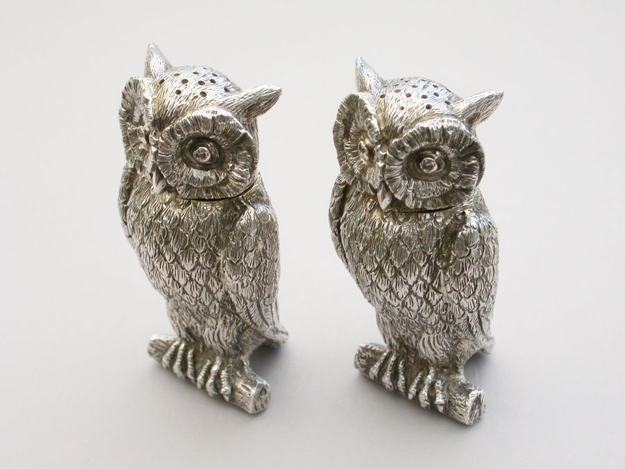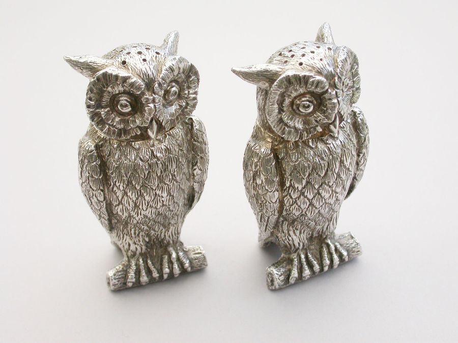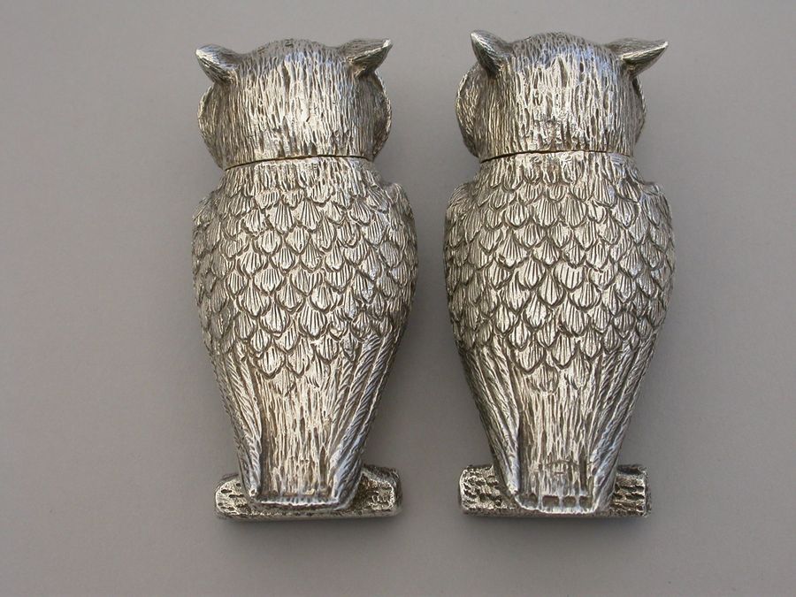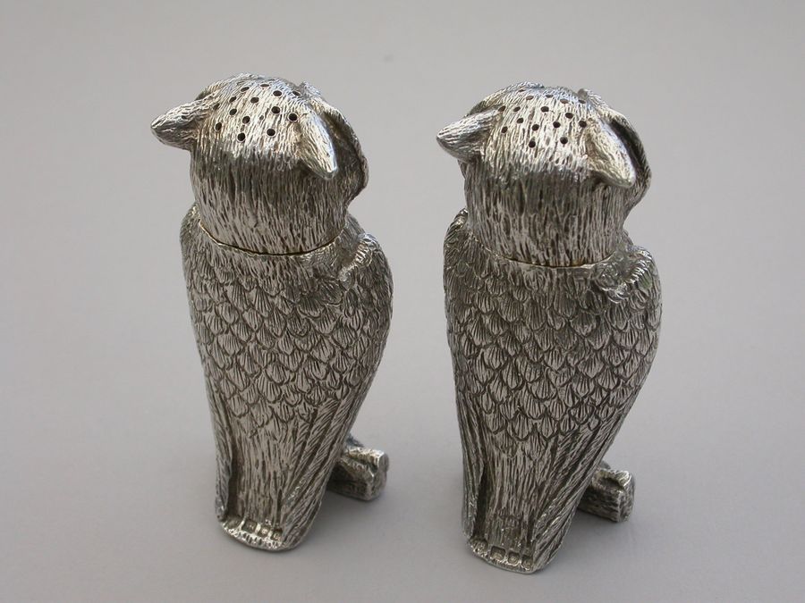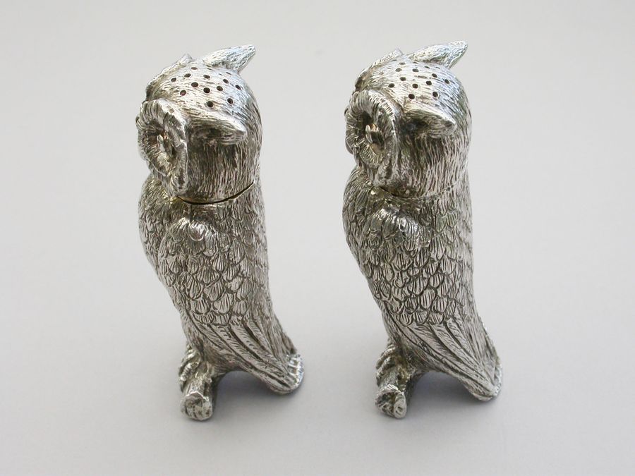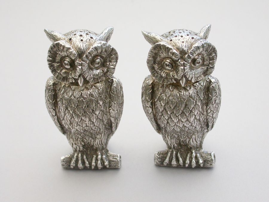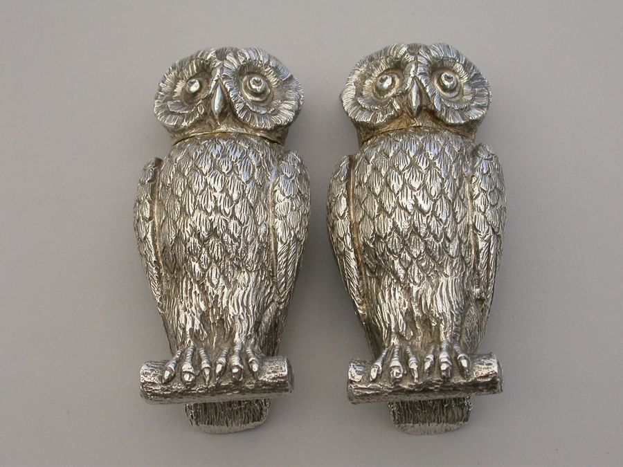 Pair George V Cast Novelty Silver Owl Peppers