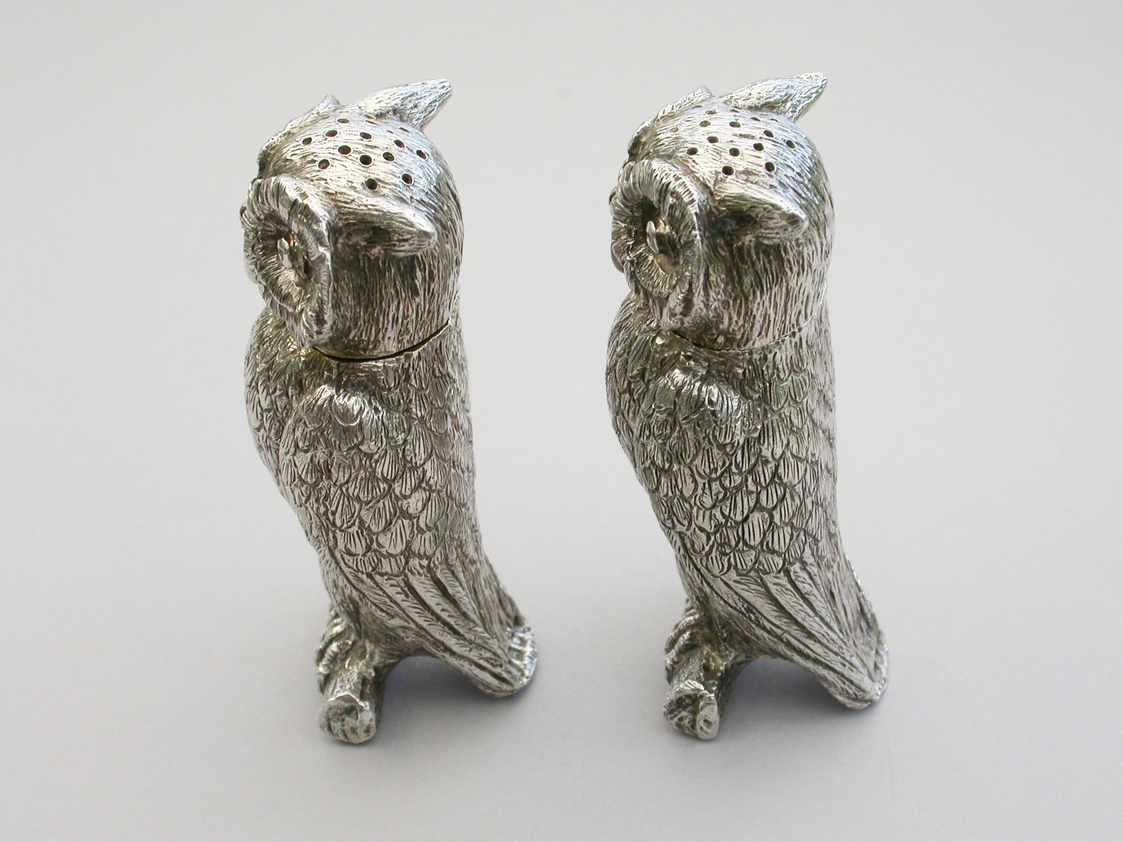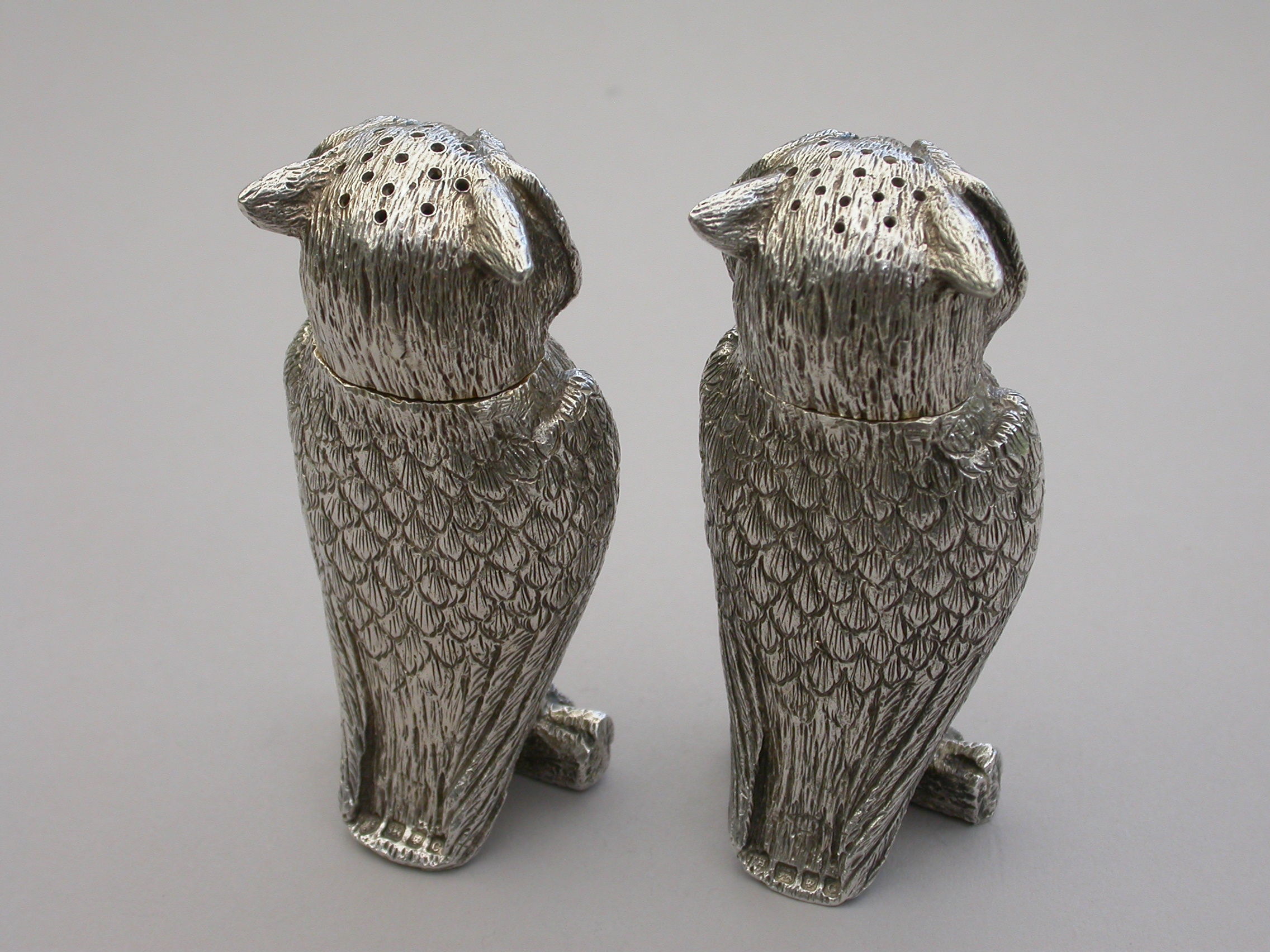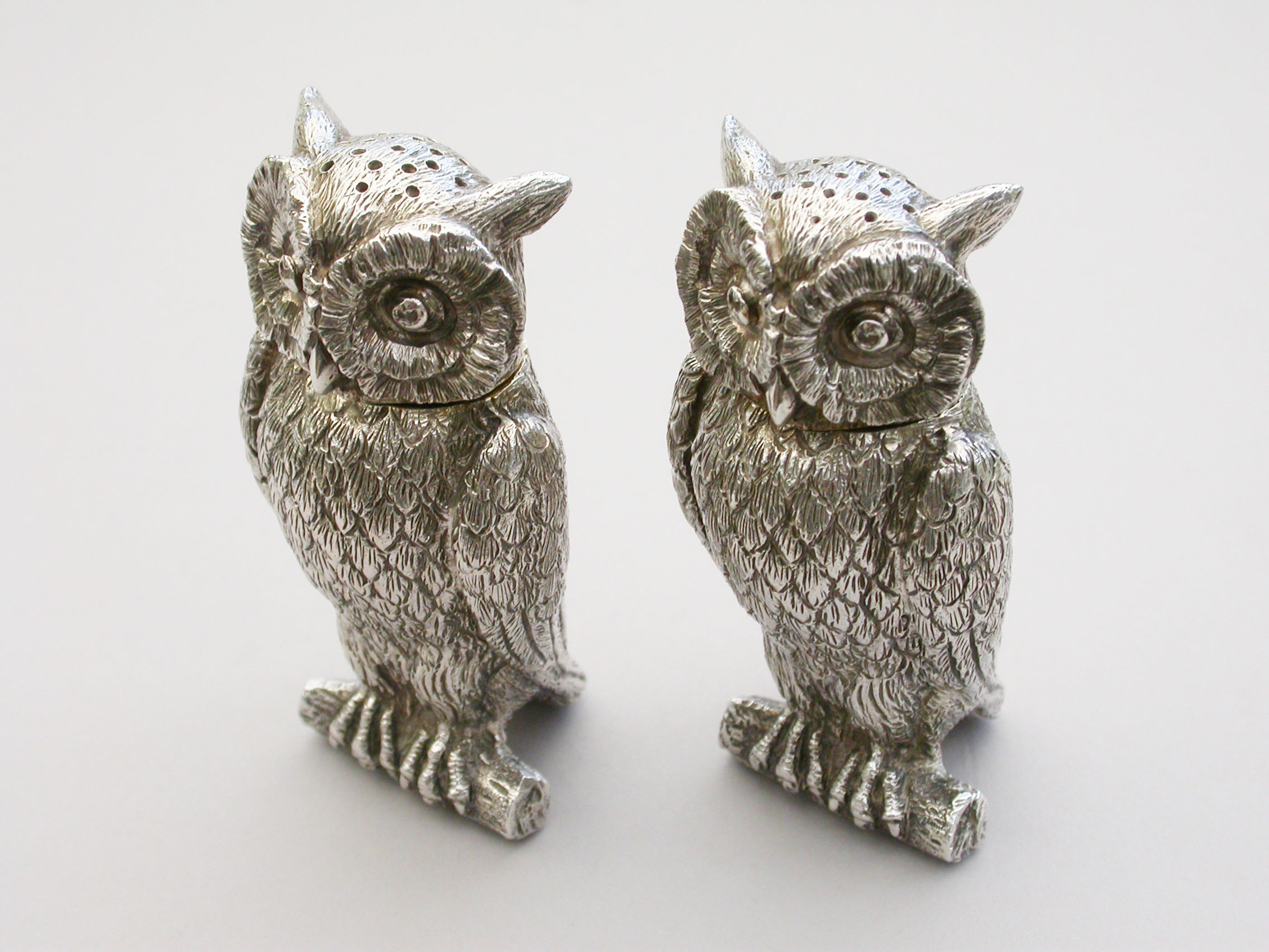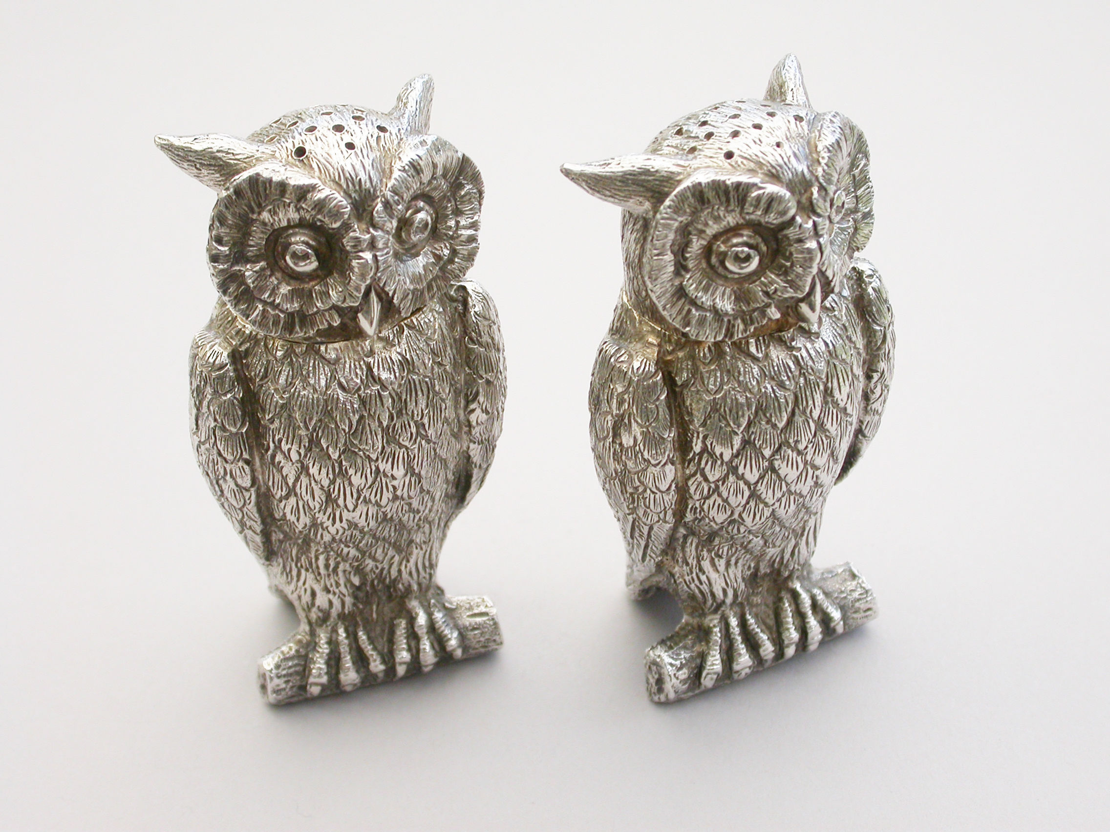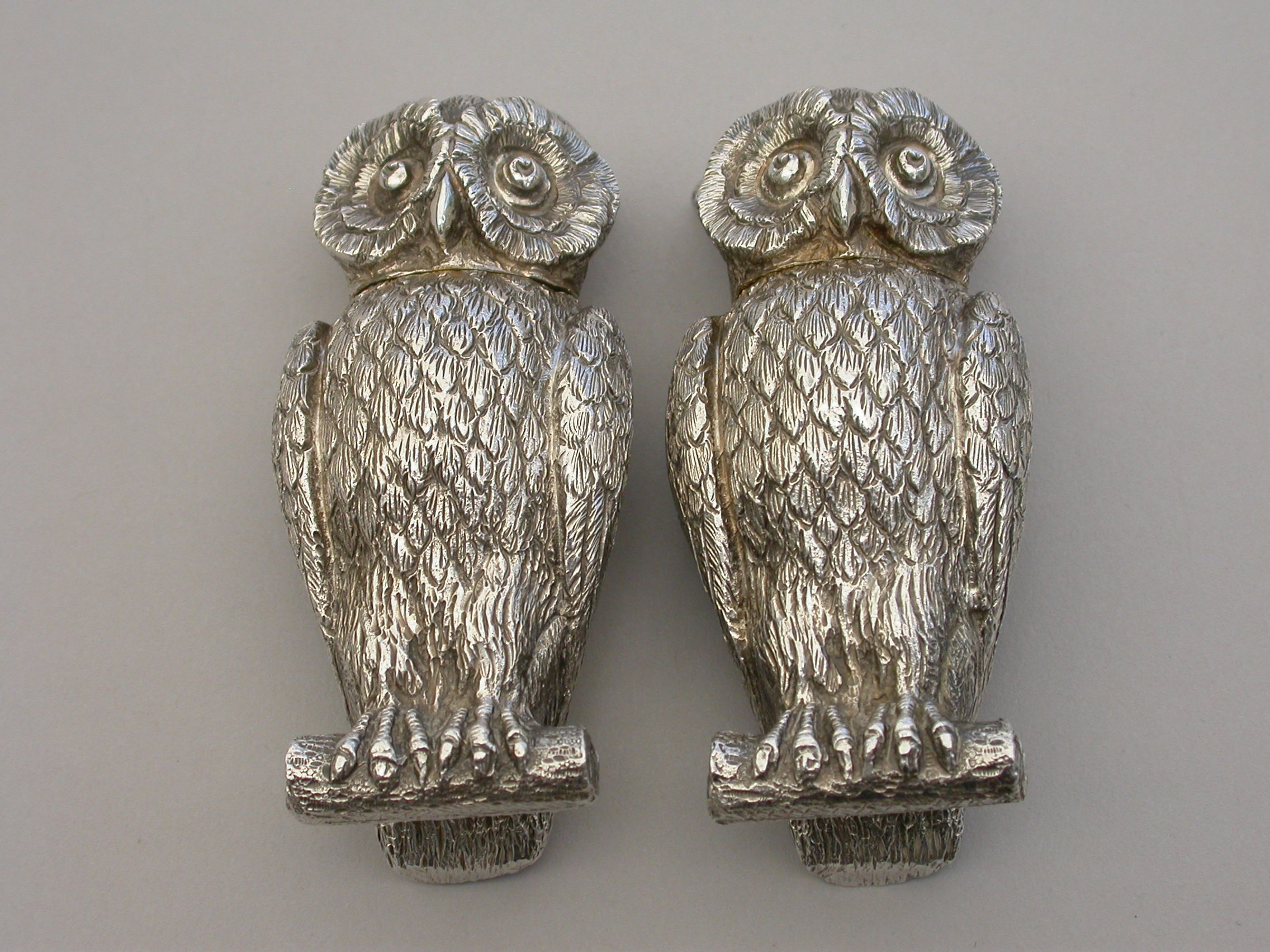 A fine quality pair of early 20th century heavy cast novelty silver Peppers, made in the form of Owls perched on branches, with pull-off pierced lids and silver gilt interiors.