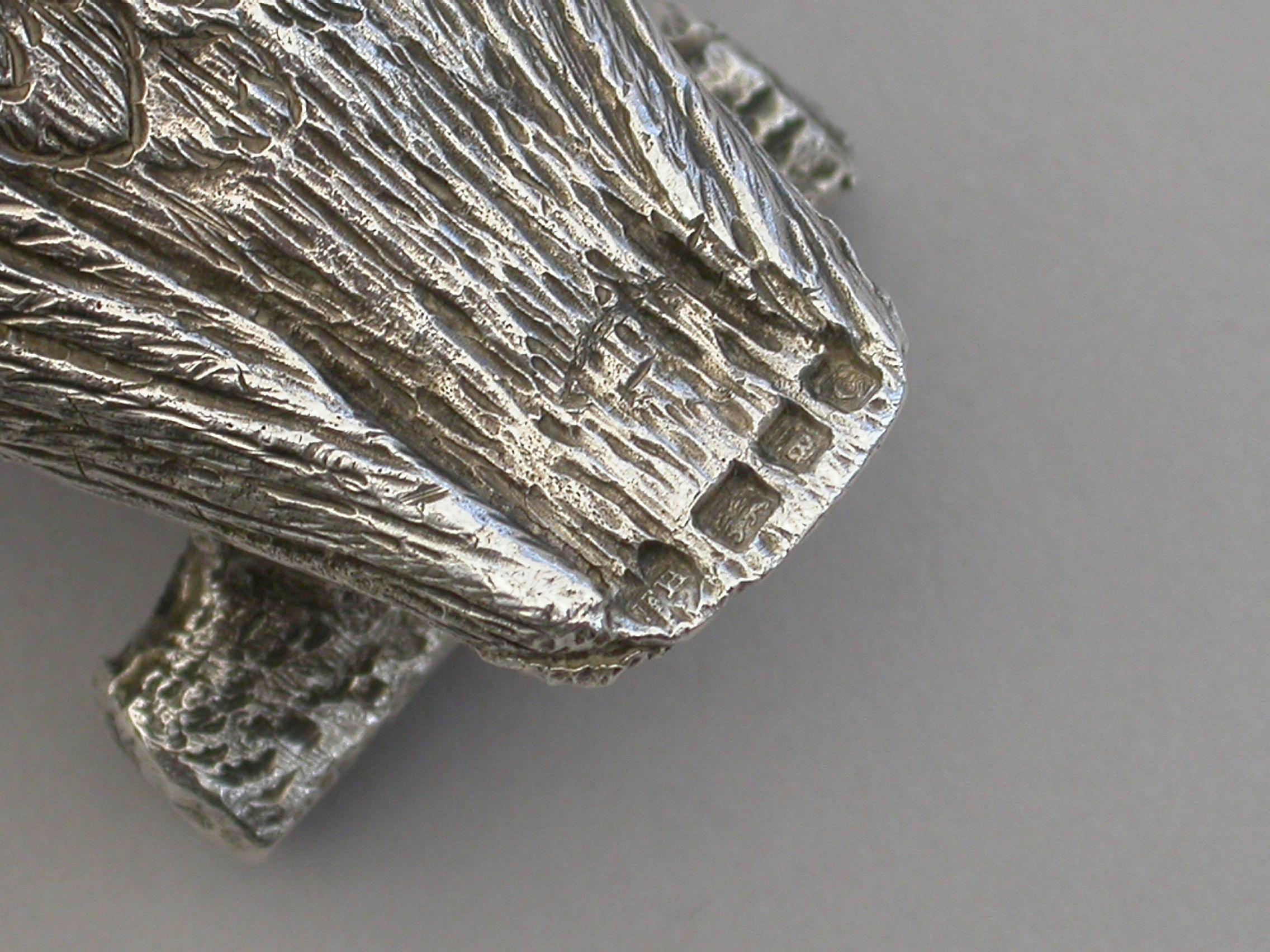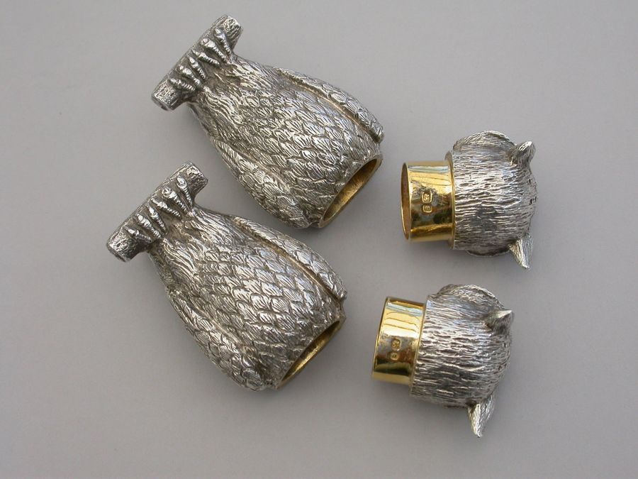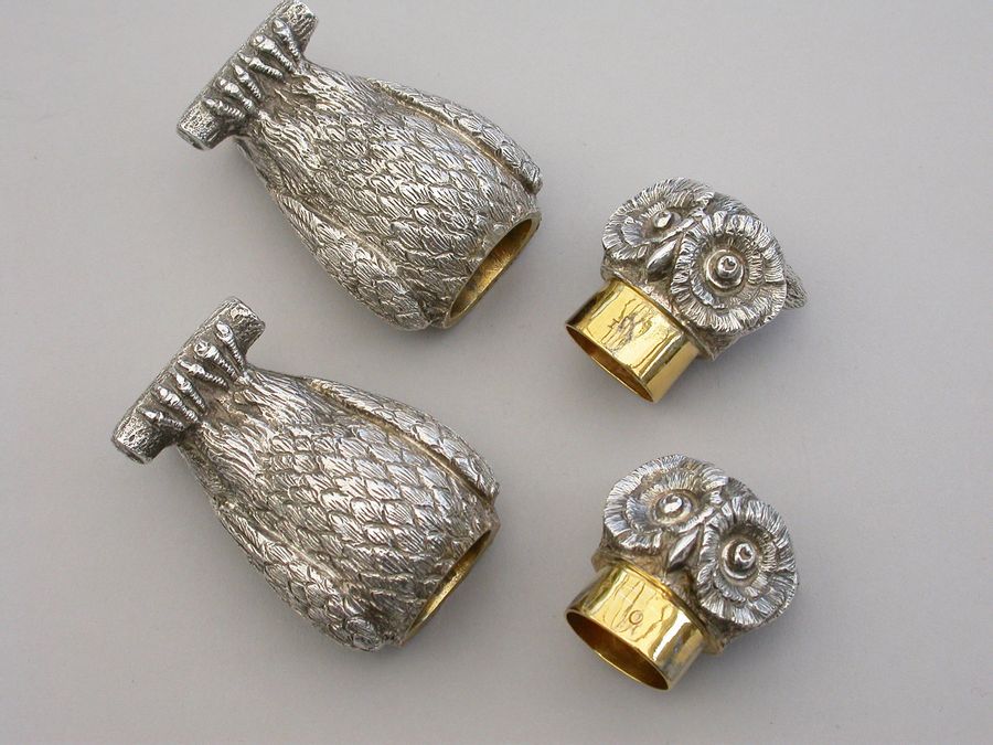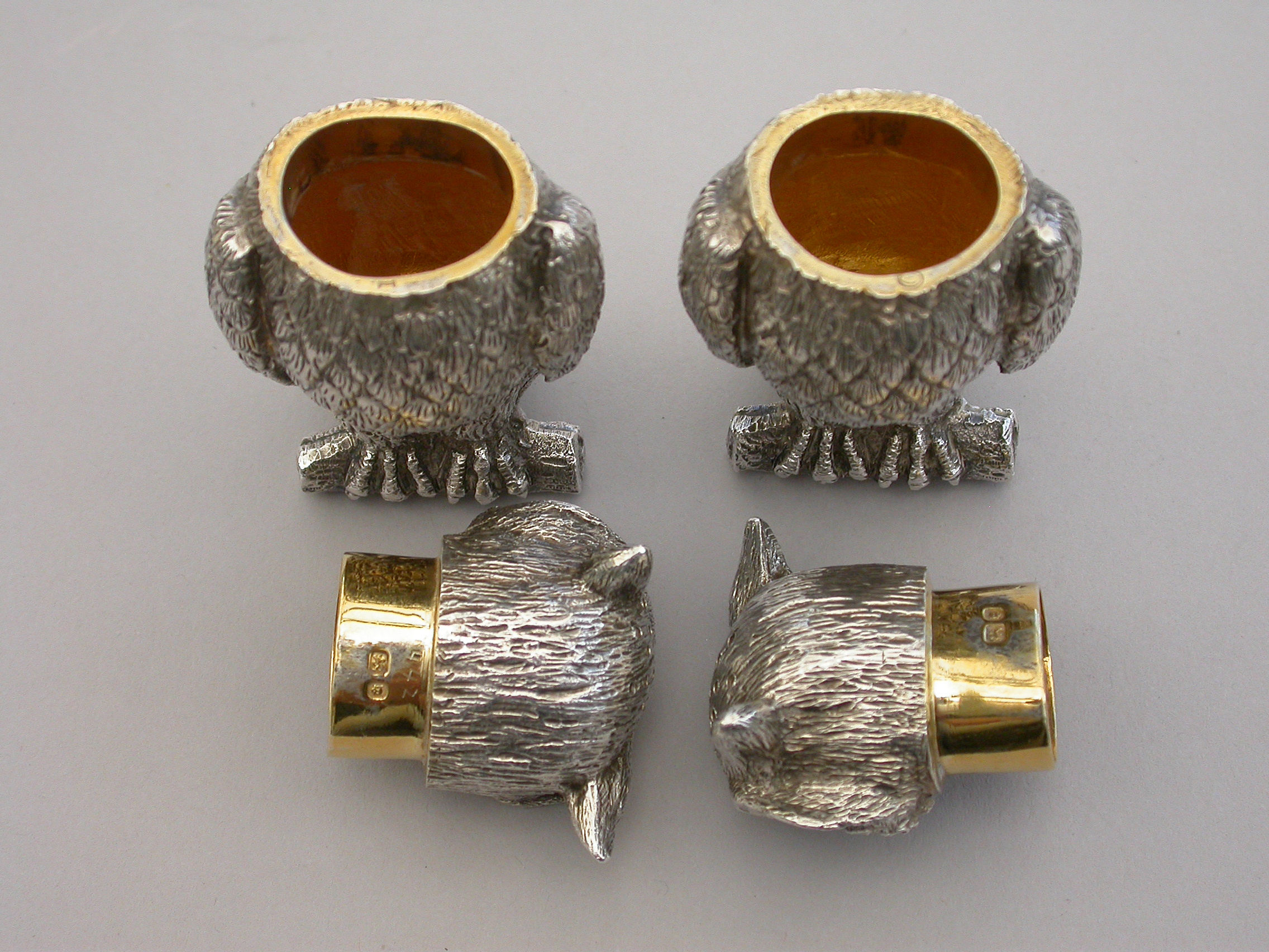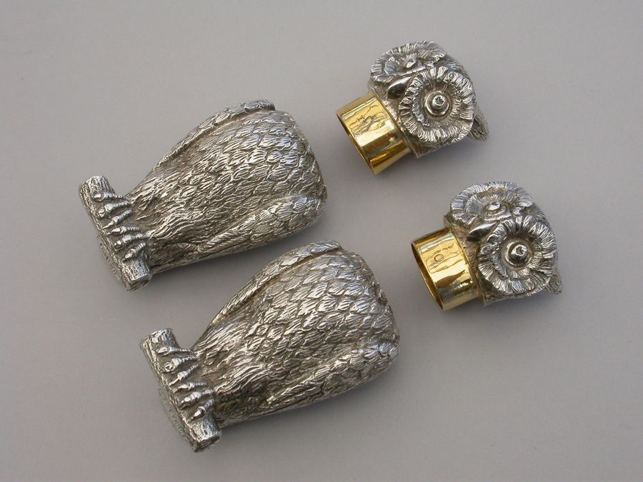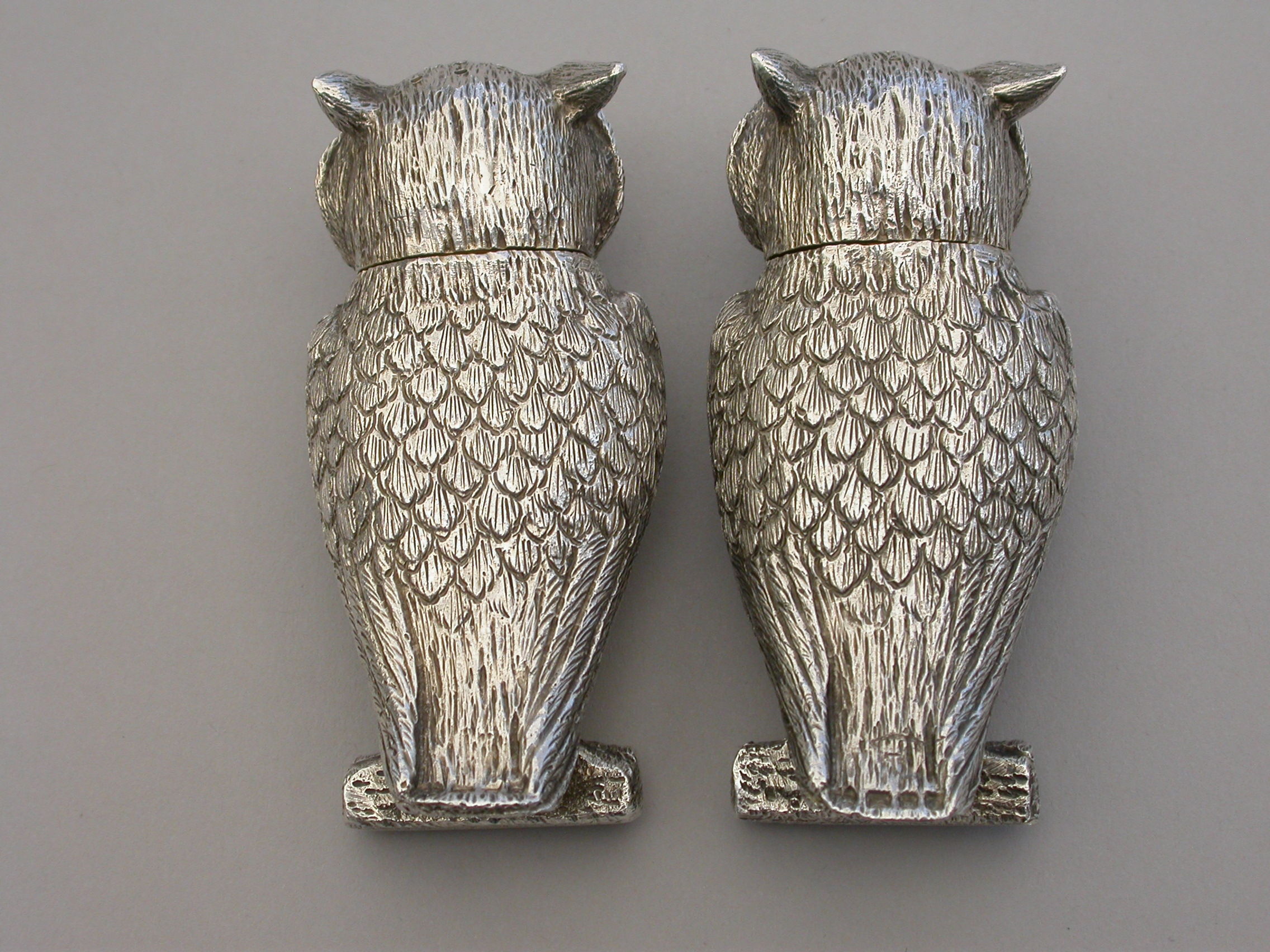 A fine quality pair of early 20th century heavy cast novelty silver Peppers, made in the form of Owls perched on branches, with pull-off pierced lids and silver gilt interiors.