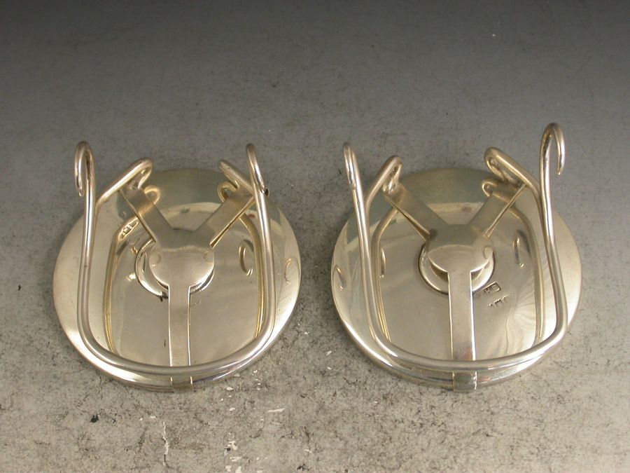 An unusual pair of George V silver Menu Holders of circular form with Mother of Pearl panels engraved with coaching scenes standing on easel type silver wire supports.