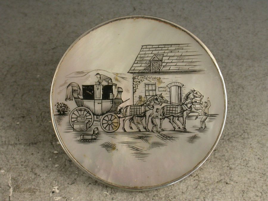 Pair George V Silver & Mother of Pearl 'Coaching Scene' Menu Holders