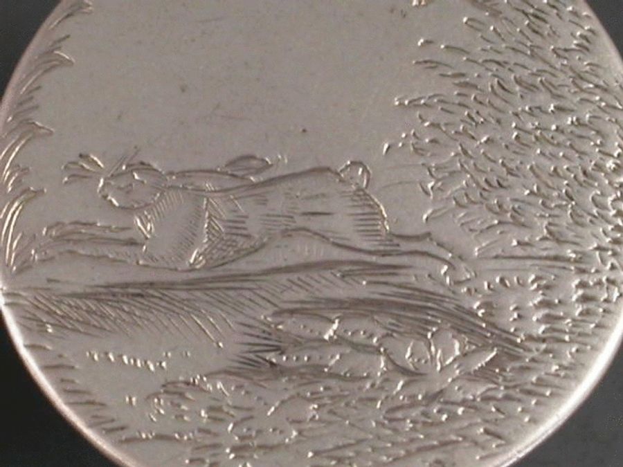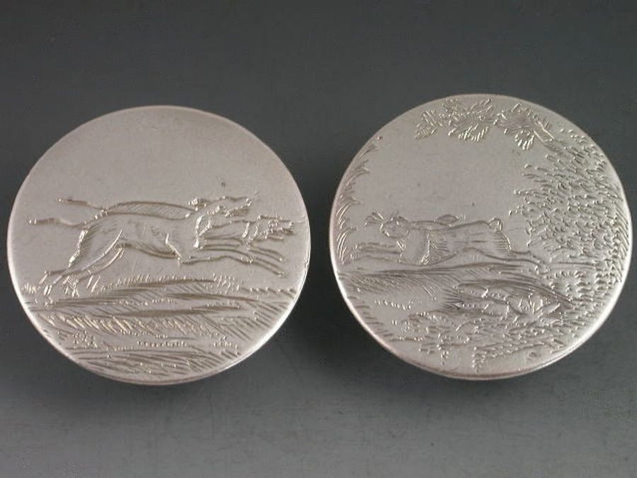 A good pair of Georgian silver Hunting Buttons, one engraved with a pair of Coursing Dogs, the other with a fleeing Hare, in landscape scenes. Complete with soldered attachment loops.