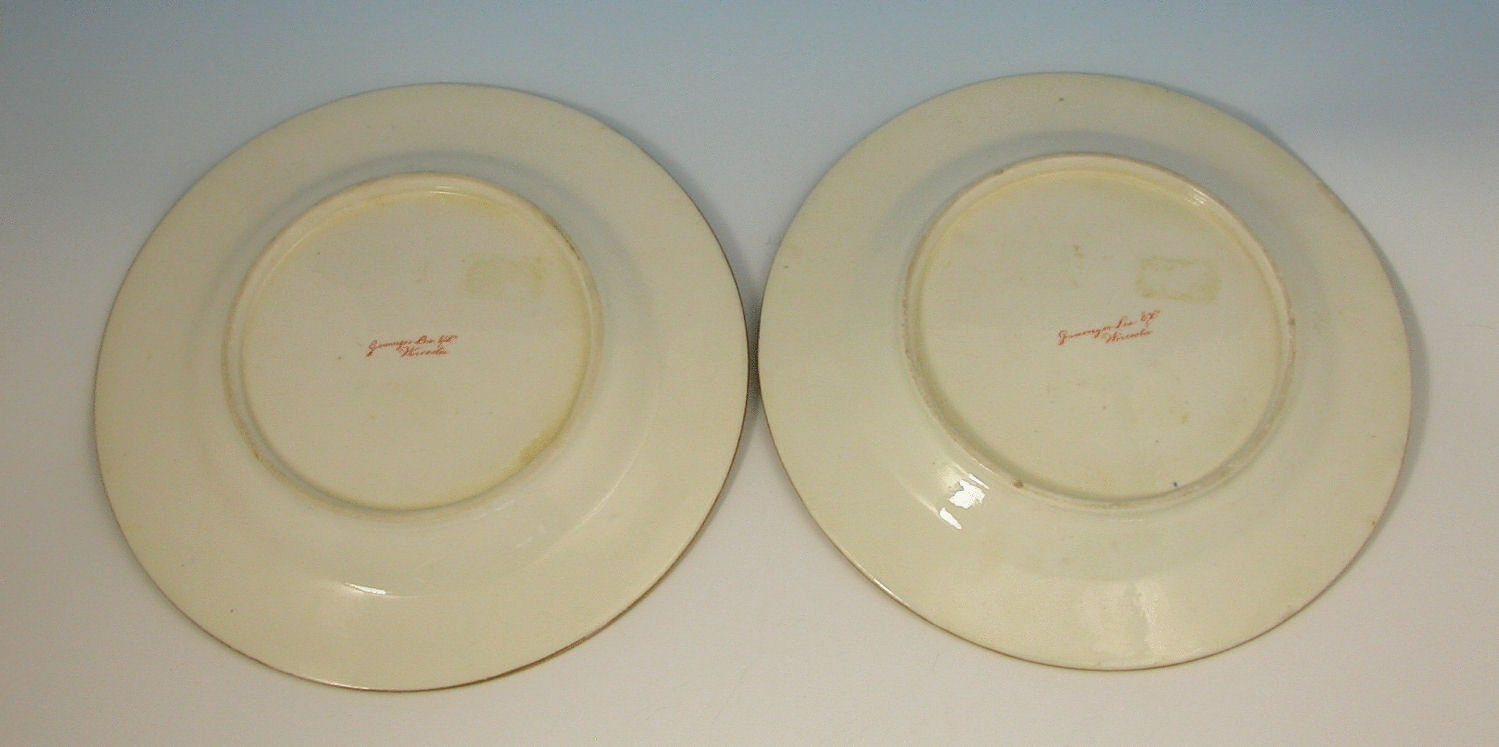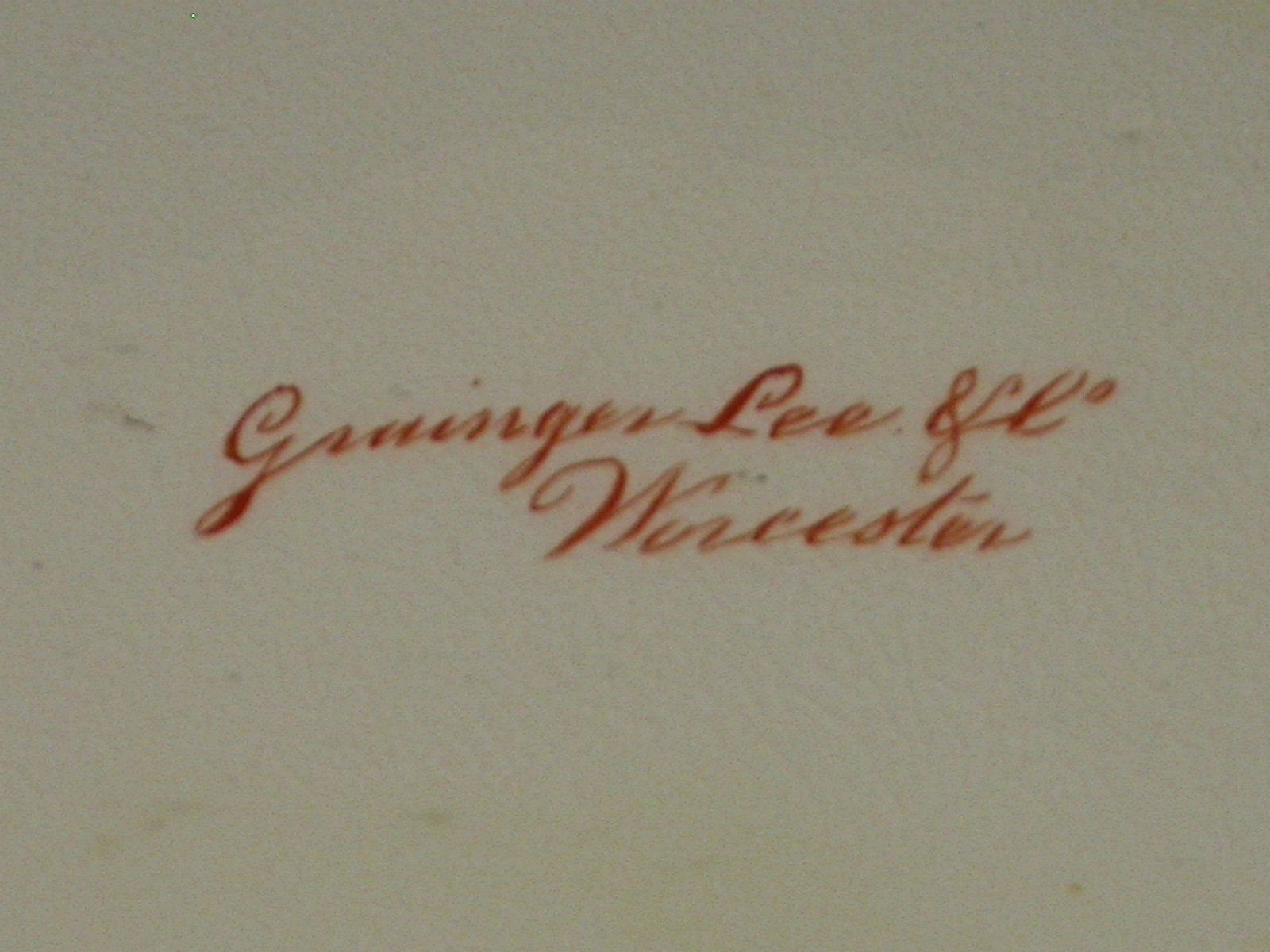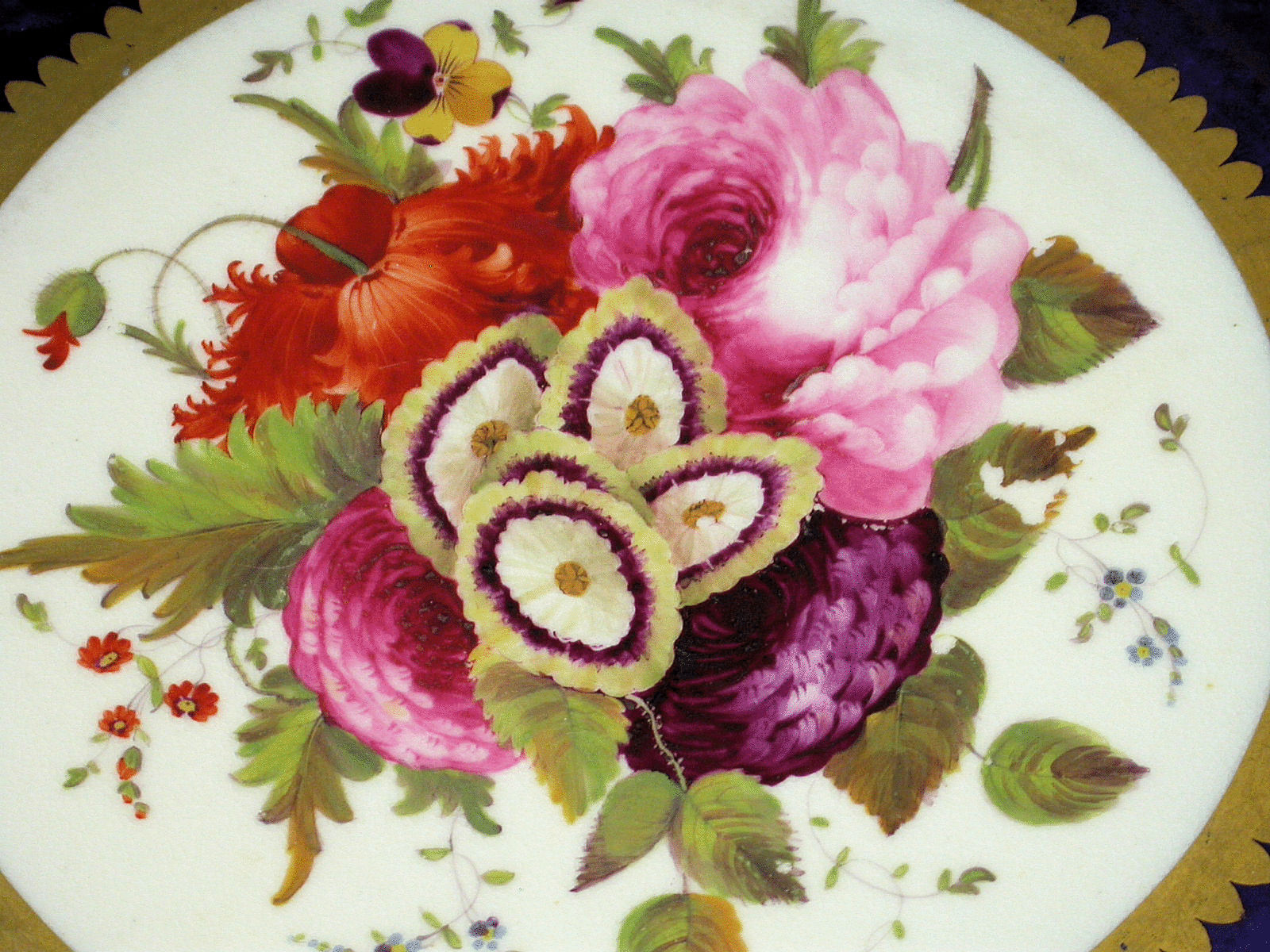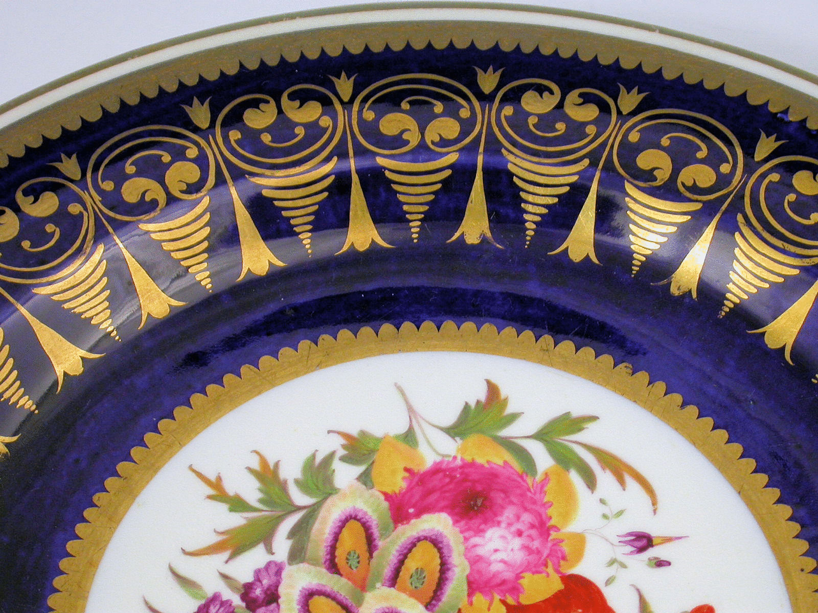 A good pair of Grainger Worcester Dessert Plates, on a gross bleu ground, with intricate gilding and painted with a central display of flowers.