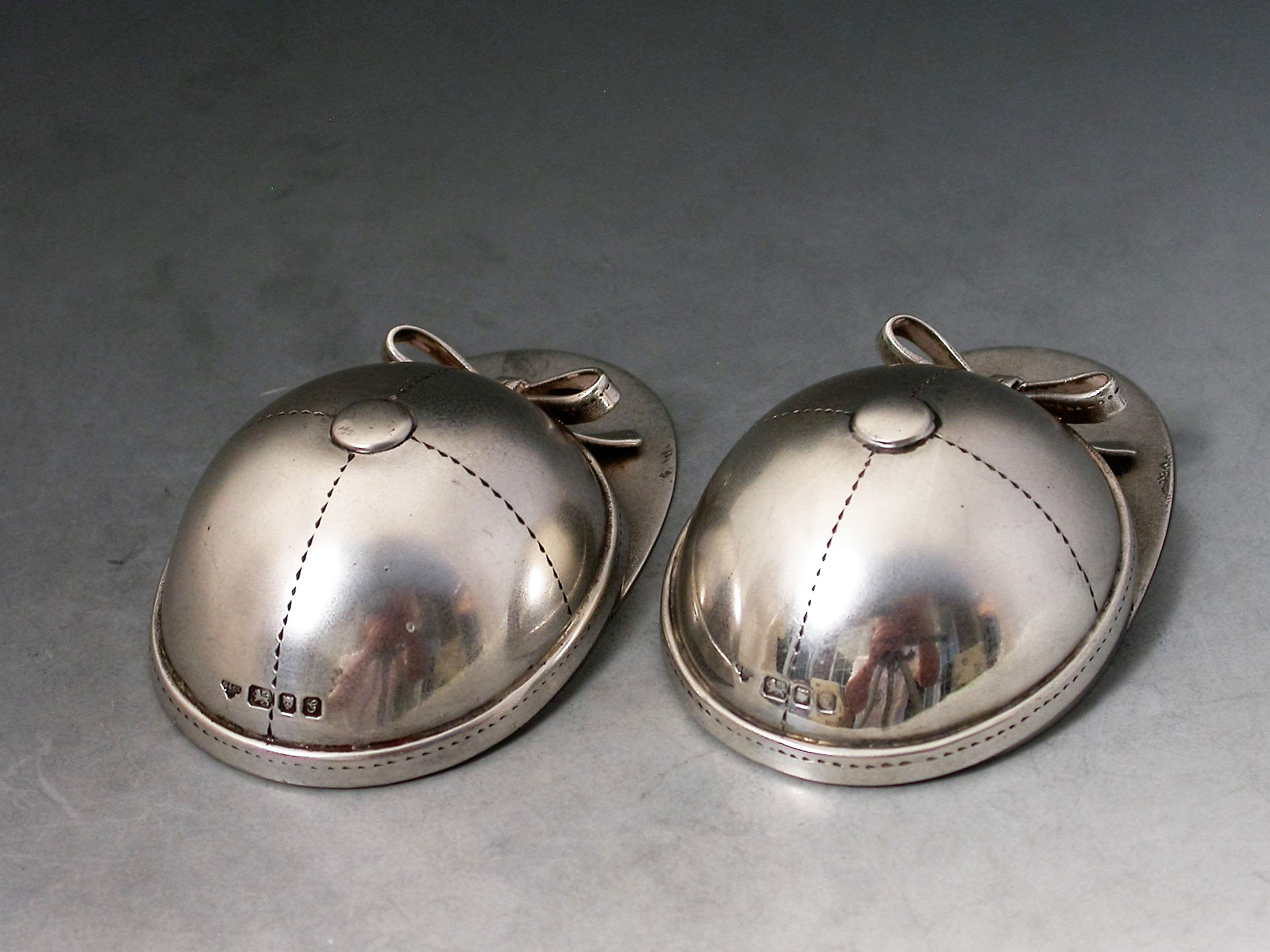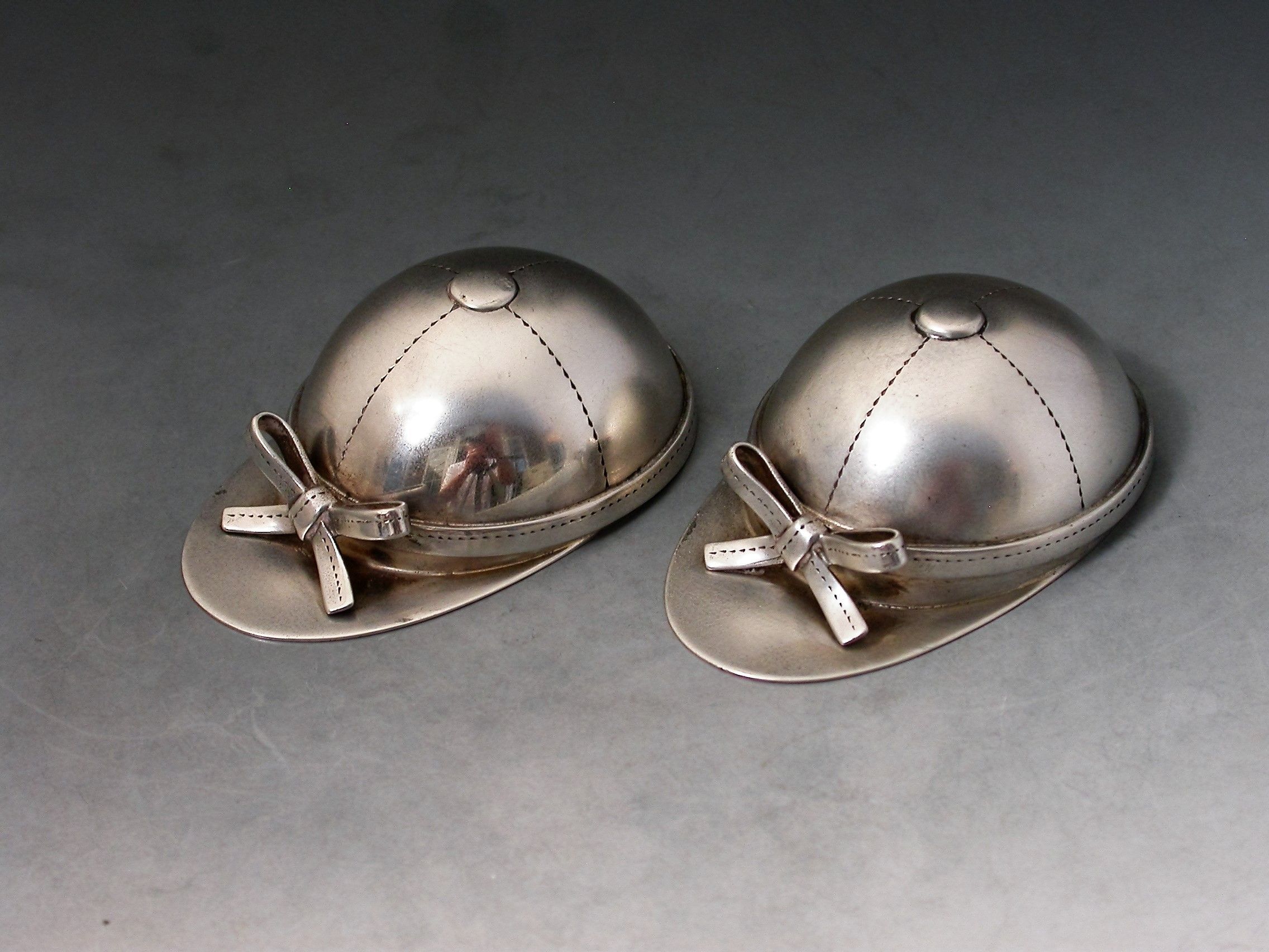 A good quality pair of modern silver Caddy Spoons, made in the form of Jockey Caps with applied tied ribbons.