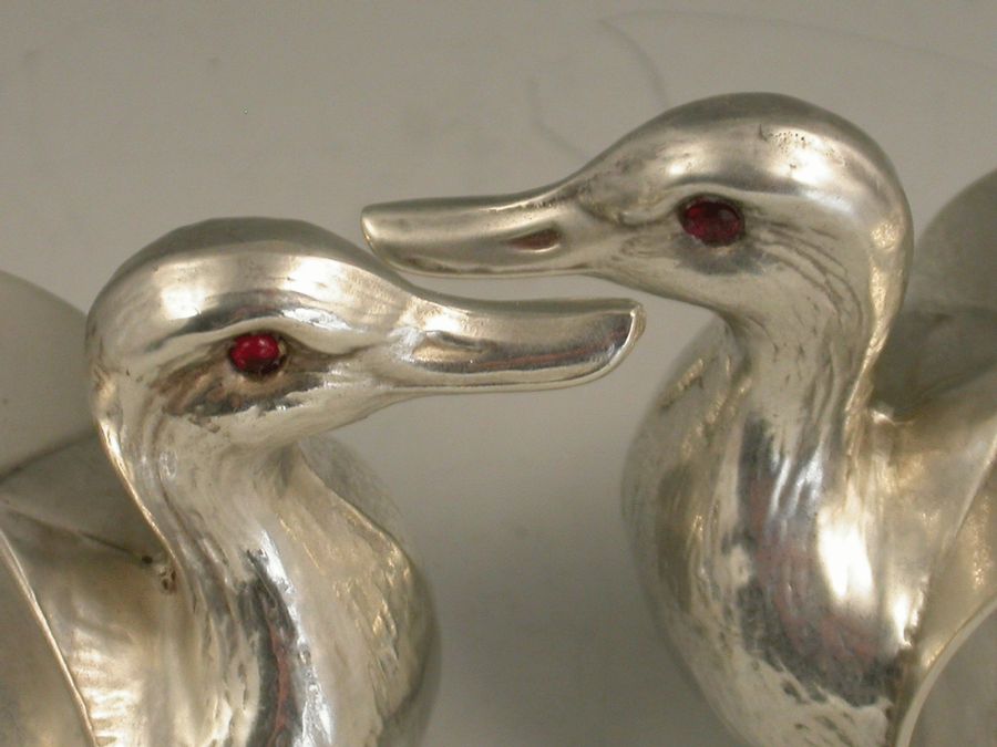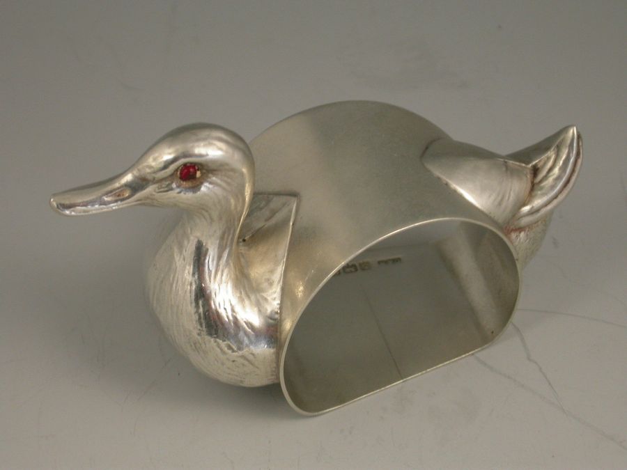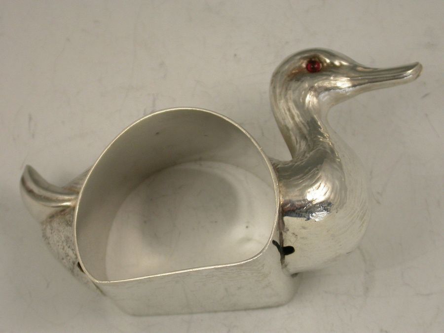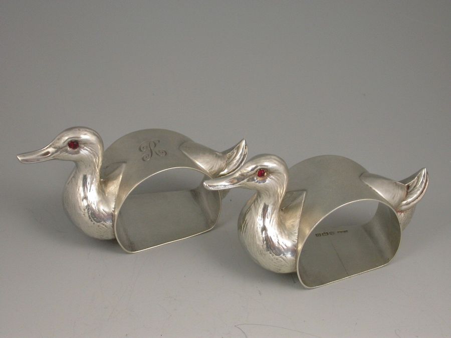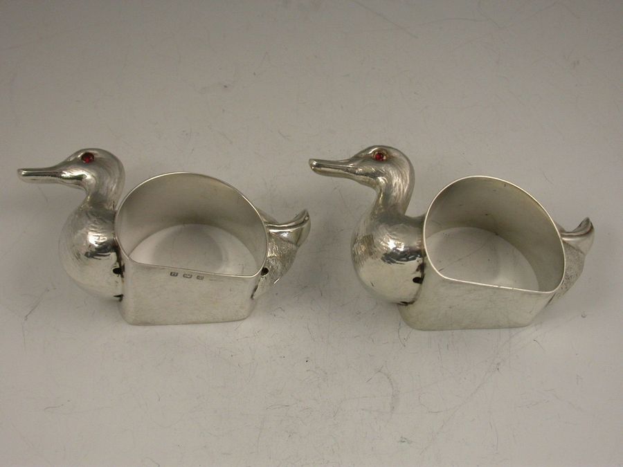 A good quality pair of early 20th century novelty silver Napkin Rings formed as Ducks with ruby glass eyes. One engraved with script initial R.