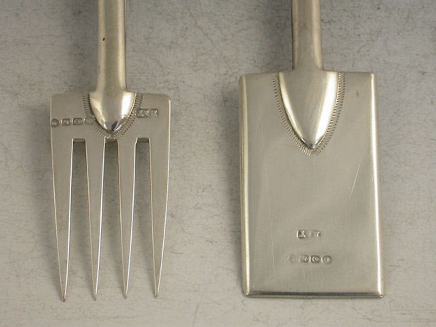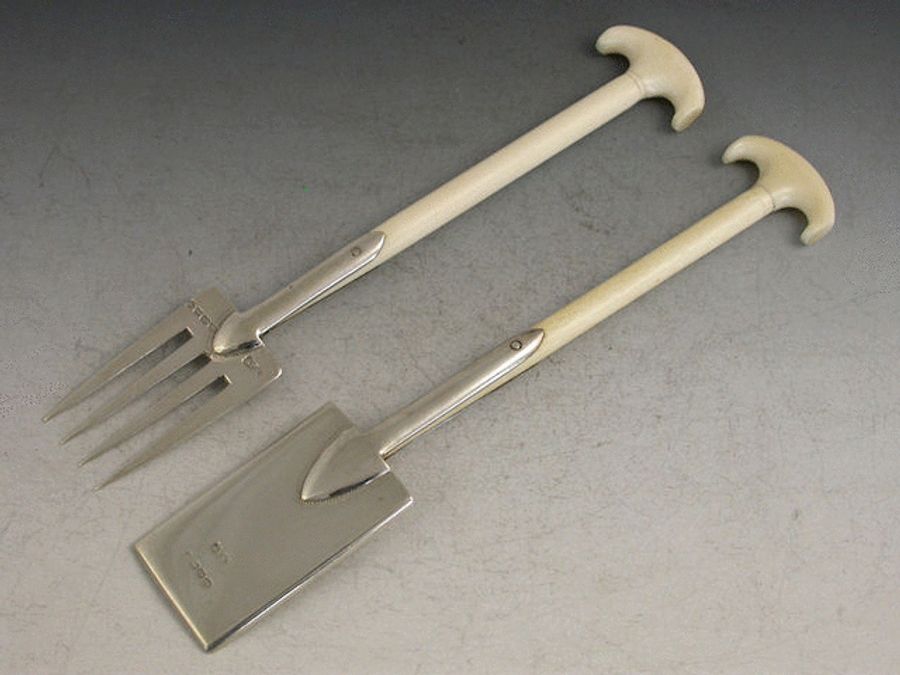 A very similar pair are illustrated in ""THE ALBERT COLLECTION"" By Robin Butler, where they are described thus:- “This pair are modelled as a garden spade and fork, each with panels of neo-rococo engraved decoration and with ivory ‘T’ handles. It is possible that these two instruments were intended for use on the dining table, although it is doubtful if the spade was used for butter. However a more likely cause for the manufacture may be that the pair were intended as presentation gifts, perhaps for long service in horticulture. It was common practice during the closing years of the nineteenth century to commission presentation gifts which pertained to the livelihood of the recipient. In Bristol City Museum and Art Gallery, there is a miniature silver litter bin given for long service by the City Council to the City Engineer”