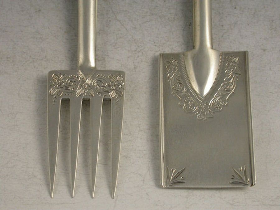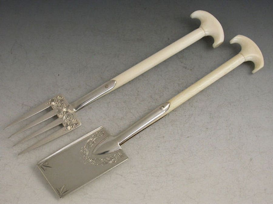 A pair of Victorian novelty silver and ivory Servers formed as a garden Fork and Spade, the blades with bright cut engraved foliate decoration. The ends of the ivory handles unscrew to replicate original wooden ones of the period.