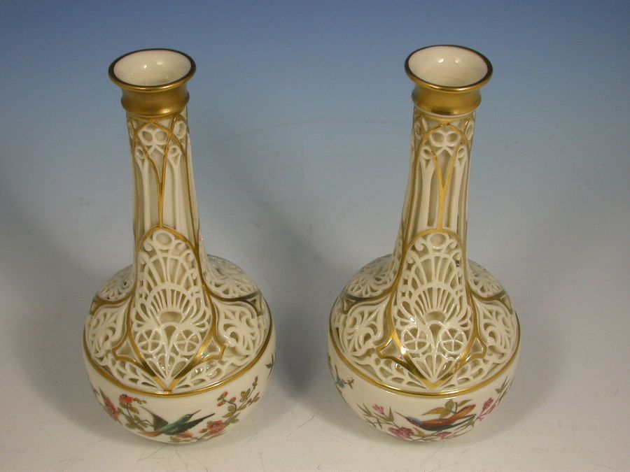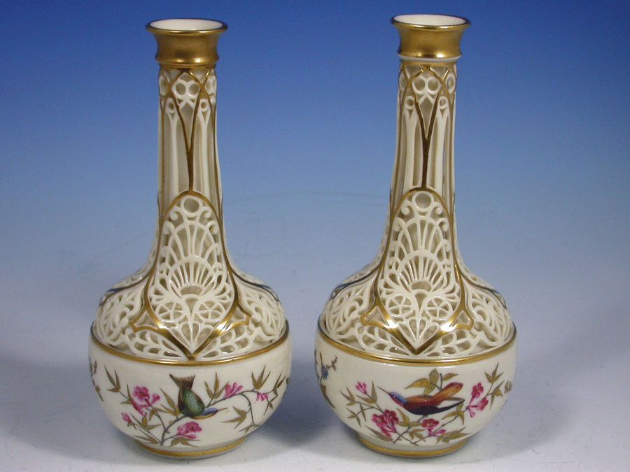 Pair of Derby Crown Porcelain Company Reticulated Bottle Vases