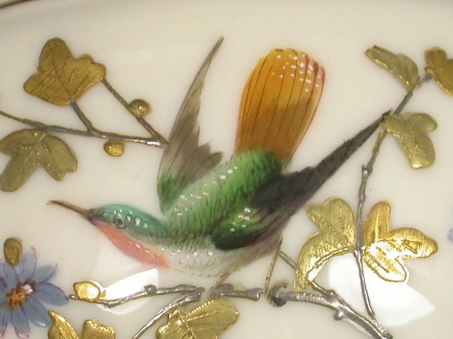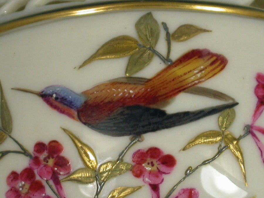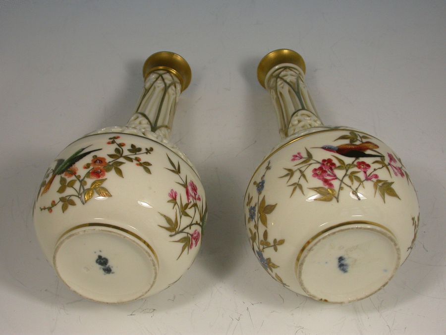 An extremely fine and very rare pair of Crown Porcelain Derby Reticulated Bottle shape Vases on ivory ground with gilt rims, painted with a continuous band of naturalistic exotic birds.