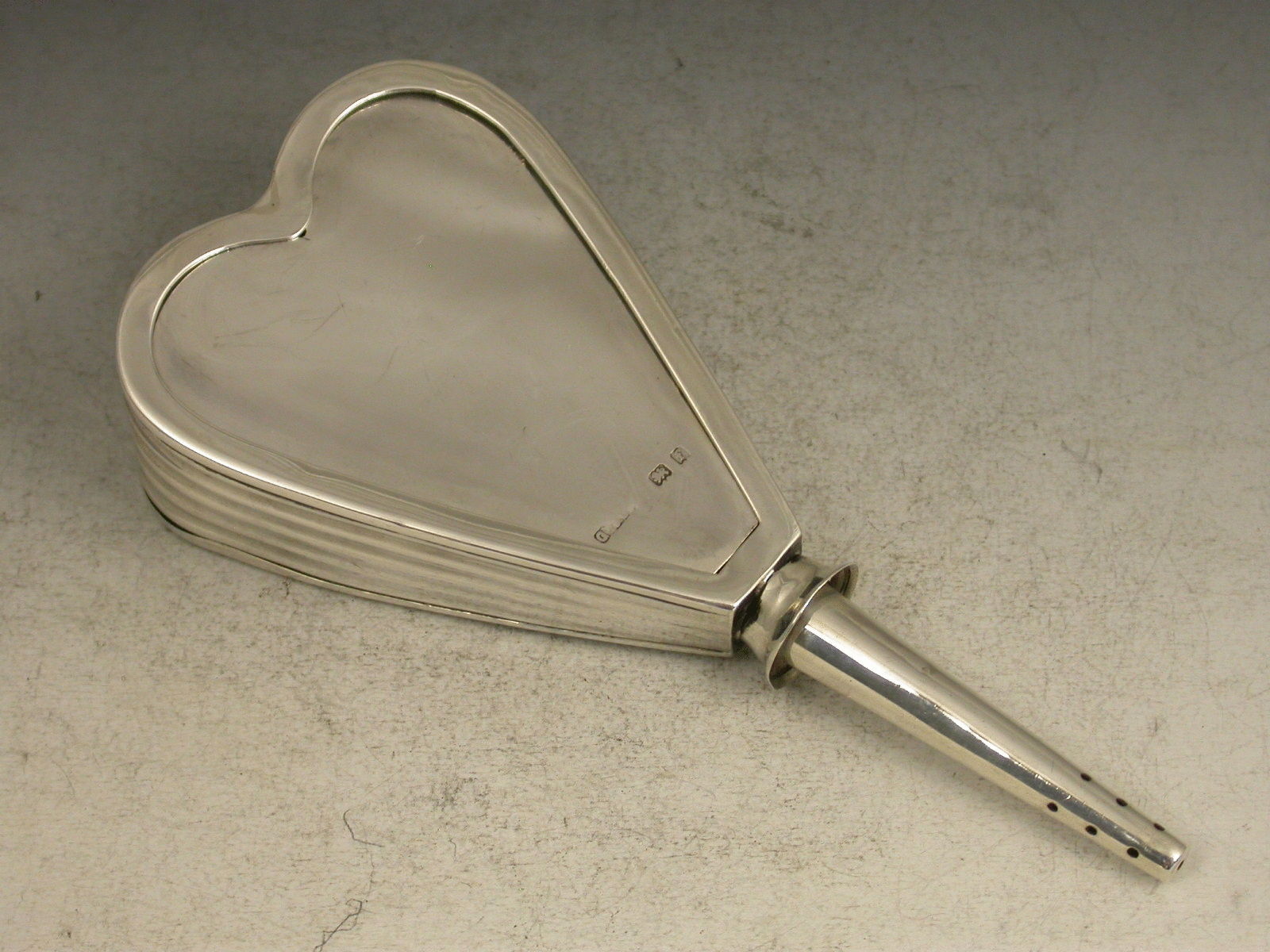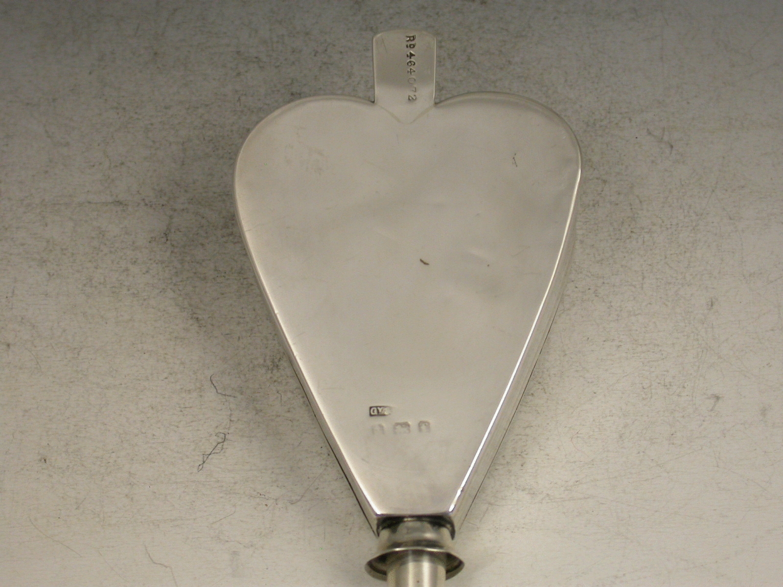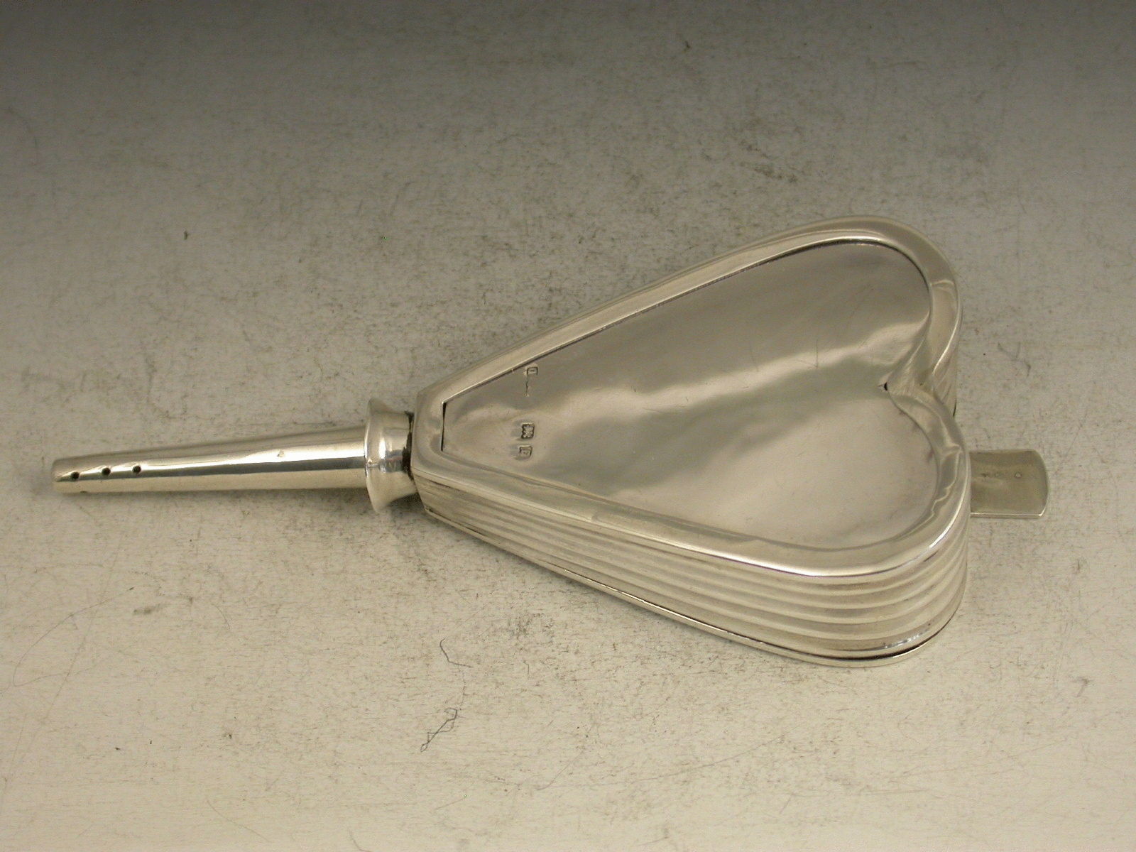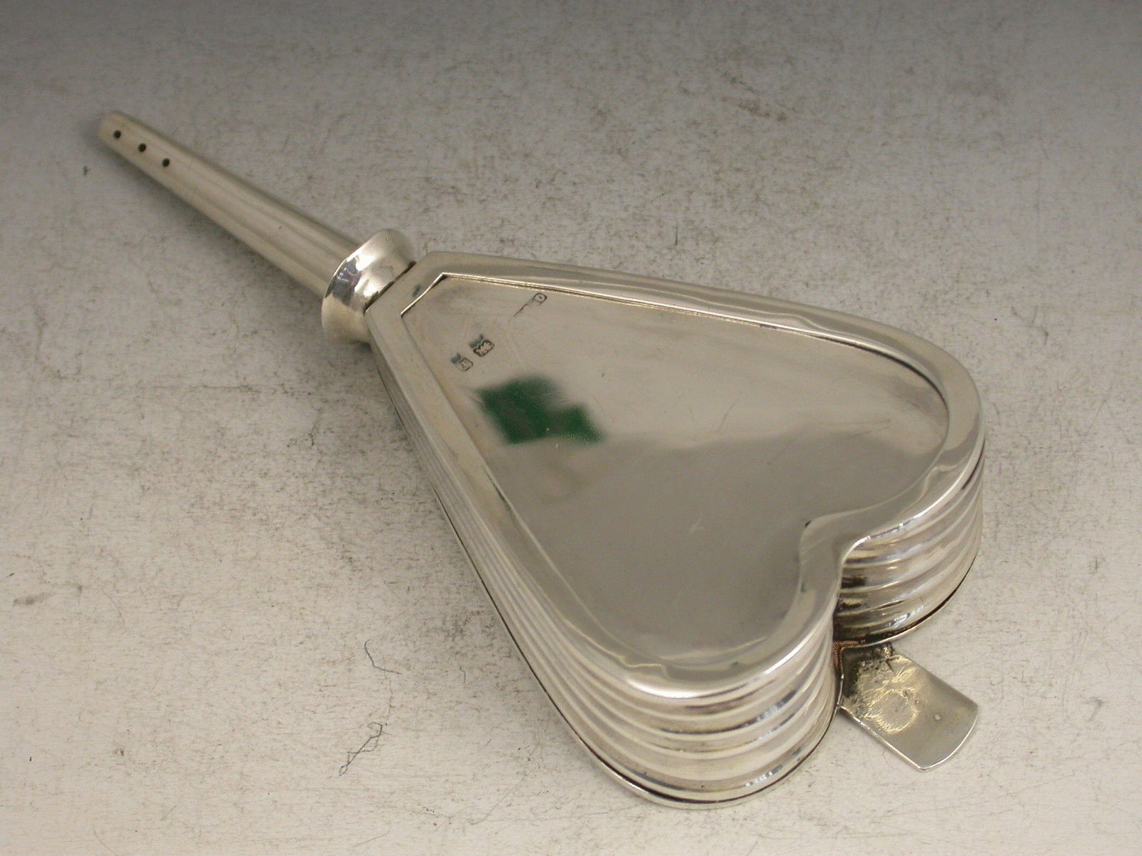 An unusual pair of Edwardian silver Pipe Smokers Bellows of a registered design, with heart shaped body and tapered nozzle with pierced end. Air is forced from the nozzle when the sprung bellows are depressed.