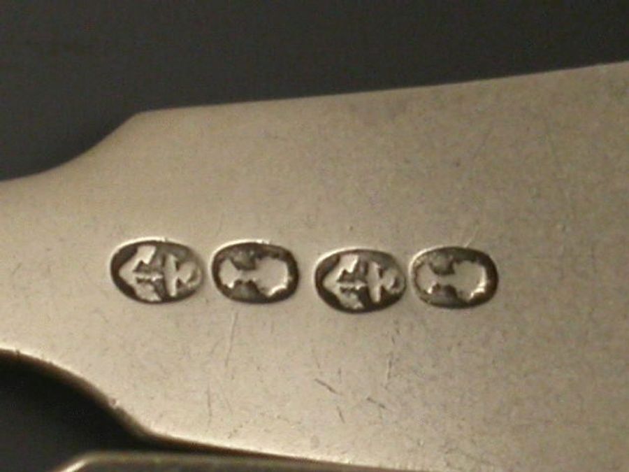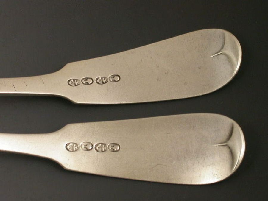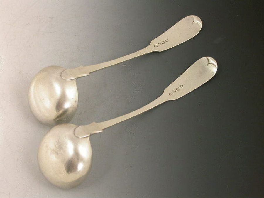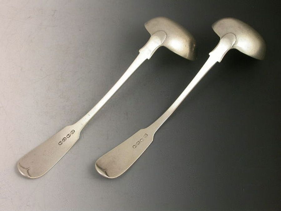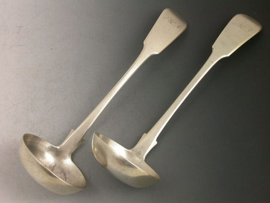 A good pair of early 19th century Scottish Provincial silver Toddy Ladles of plain fiddle pattern with circular bowls, the handles engraved with contemporary initials MD.