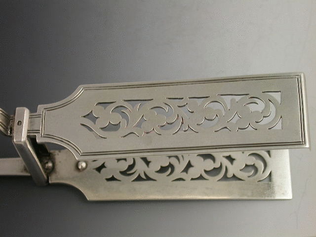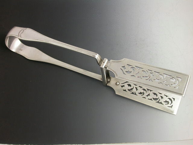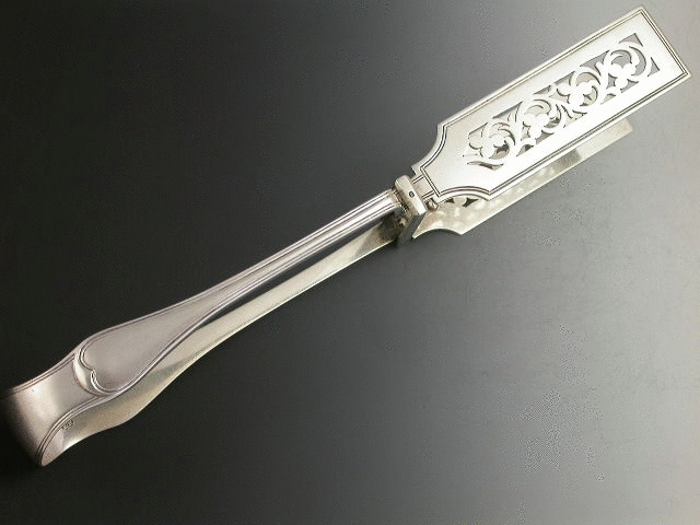 A good pair of Victorian silver Asparagus Tongs of Old English thread pattern, the bow engraved with a crest of a Unicorn out of a Ducal Coronet. By Elizabeth Eaton, London, 1855.