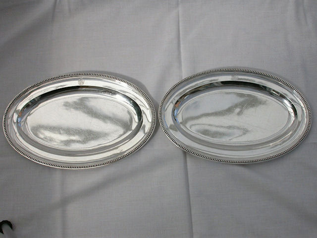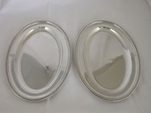 A good pair of George III silver oval Meat Dishes with beaded borders. Engraved with the Arms of Robert Fowler, his Grace The Archbishop of Dublin. Engraved to the reverse with numbers 23 and 25 and the Scratch weights 15 = 16 and 15 = 19.