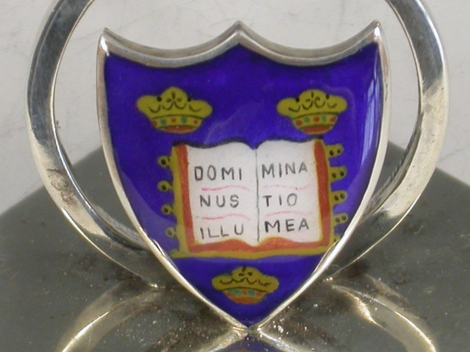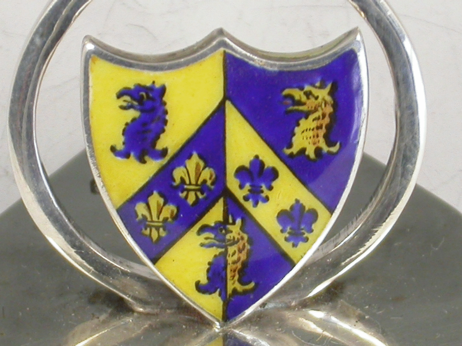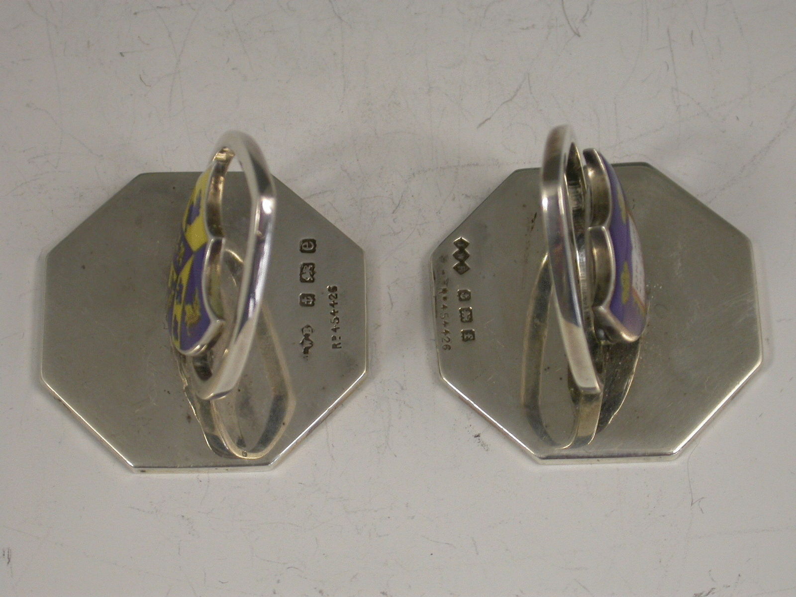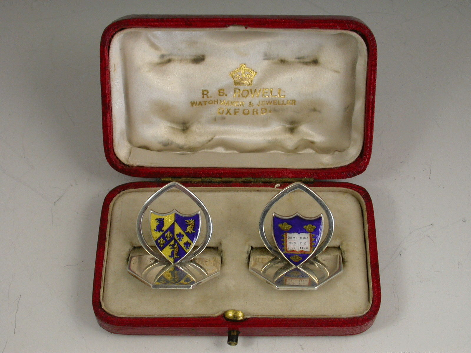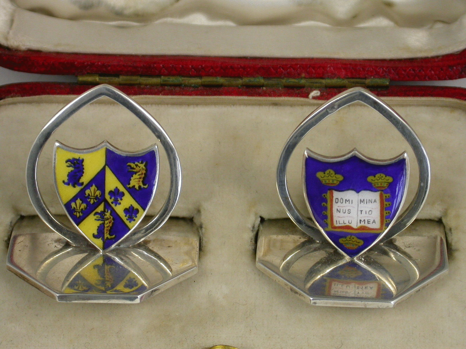 A good pair of Edwardian cased silver and enamel Menu Holders, the shield shaped stands on octagonal bases, enamelled with the Coat of Arms of Oxford University and Trinity College, Oxford. Complete with original silk and velvet lined red leather case.