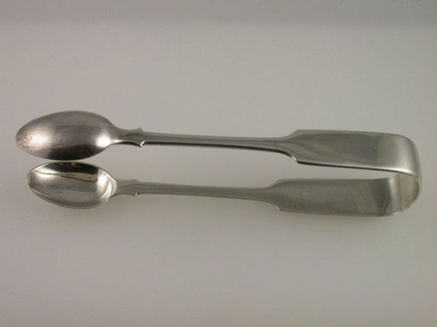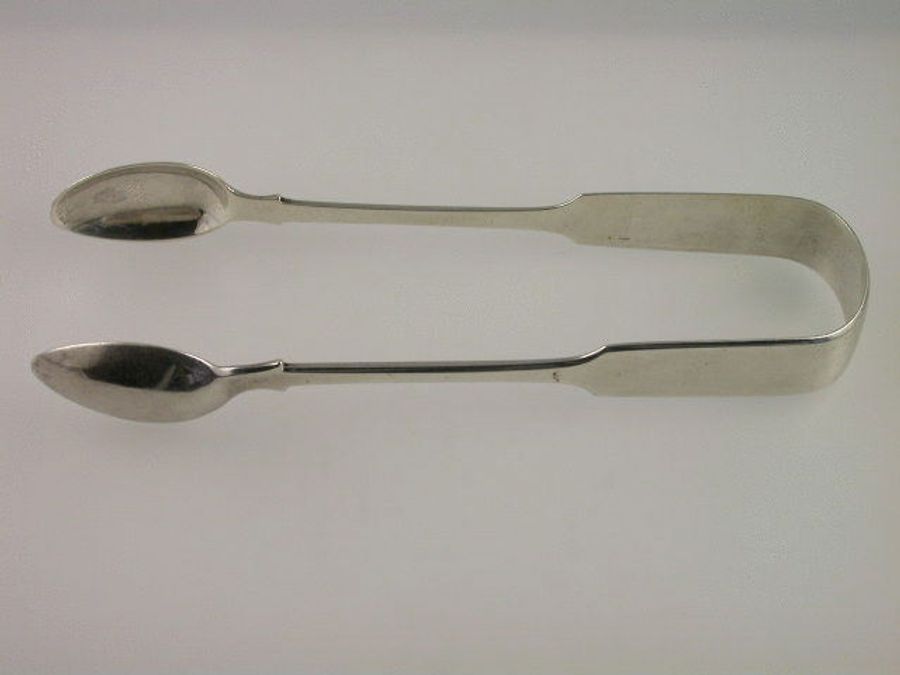 A rare pair of early Victorian Provincial silver plain fiddle pattern Sugar Tongs, engraved with contemporary initials.