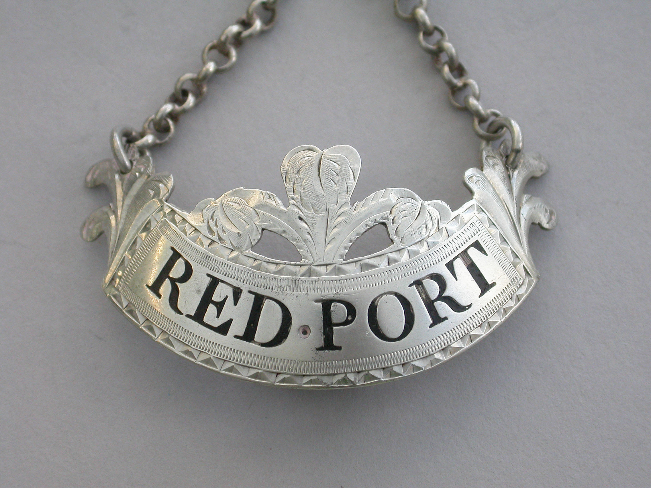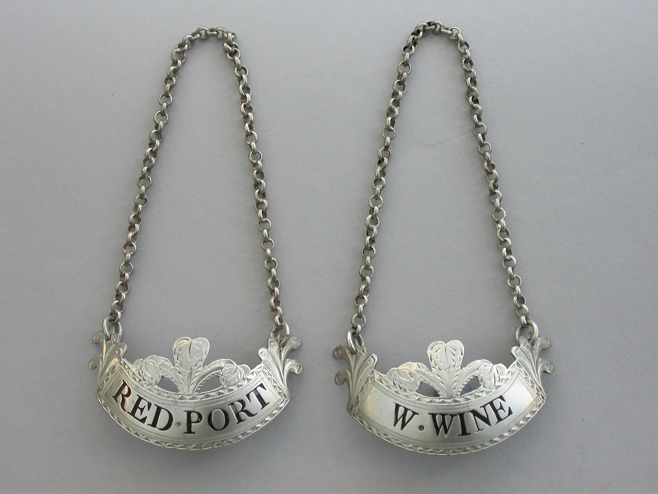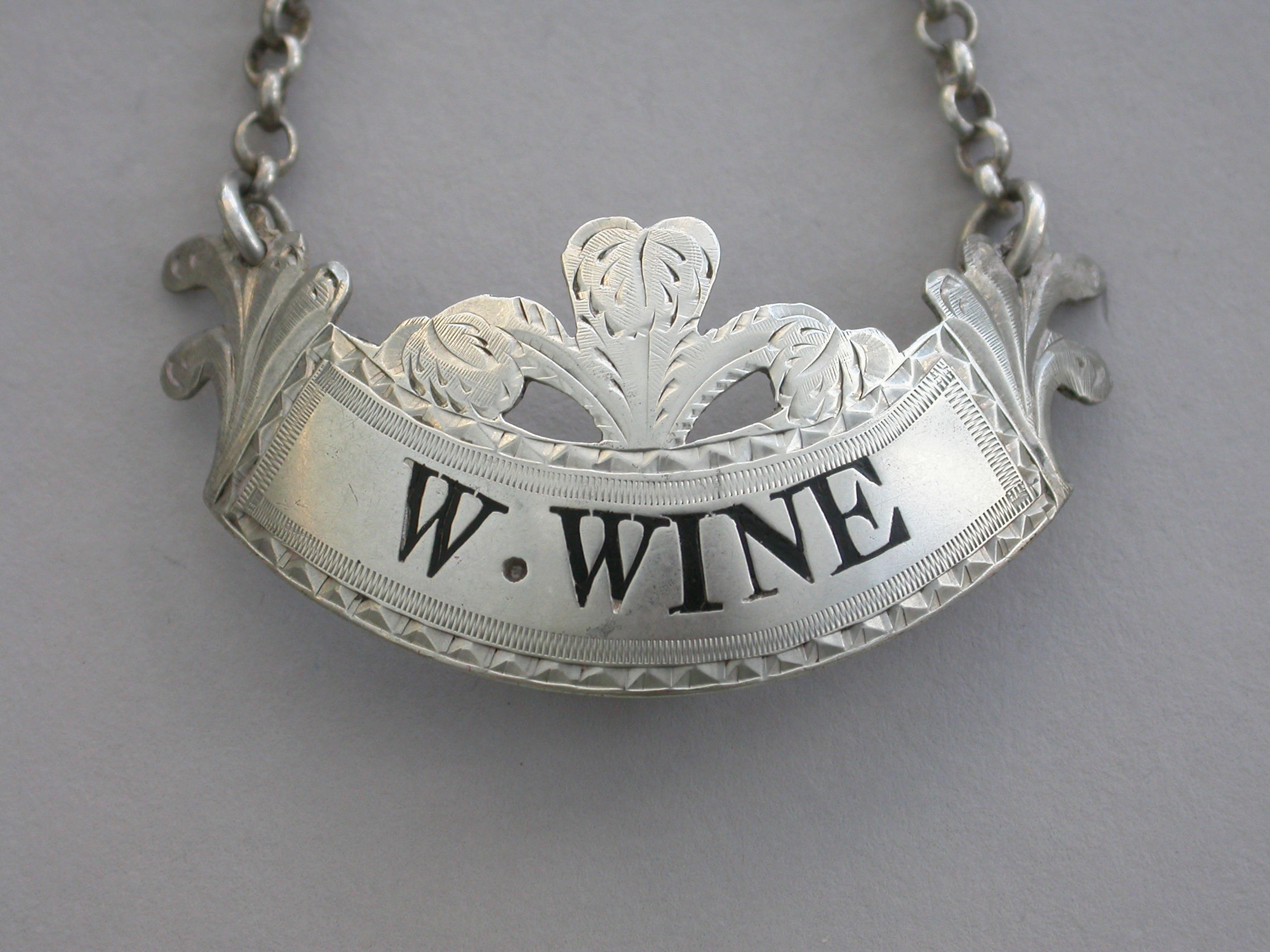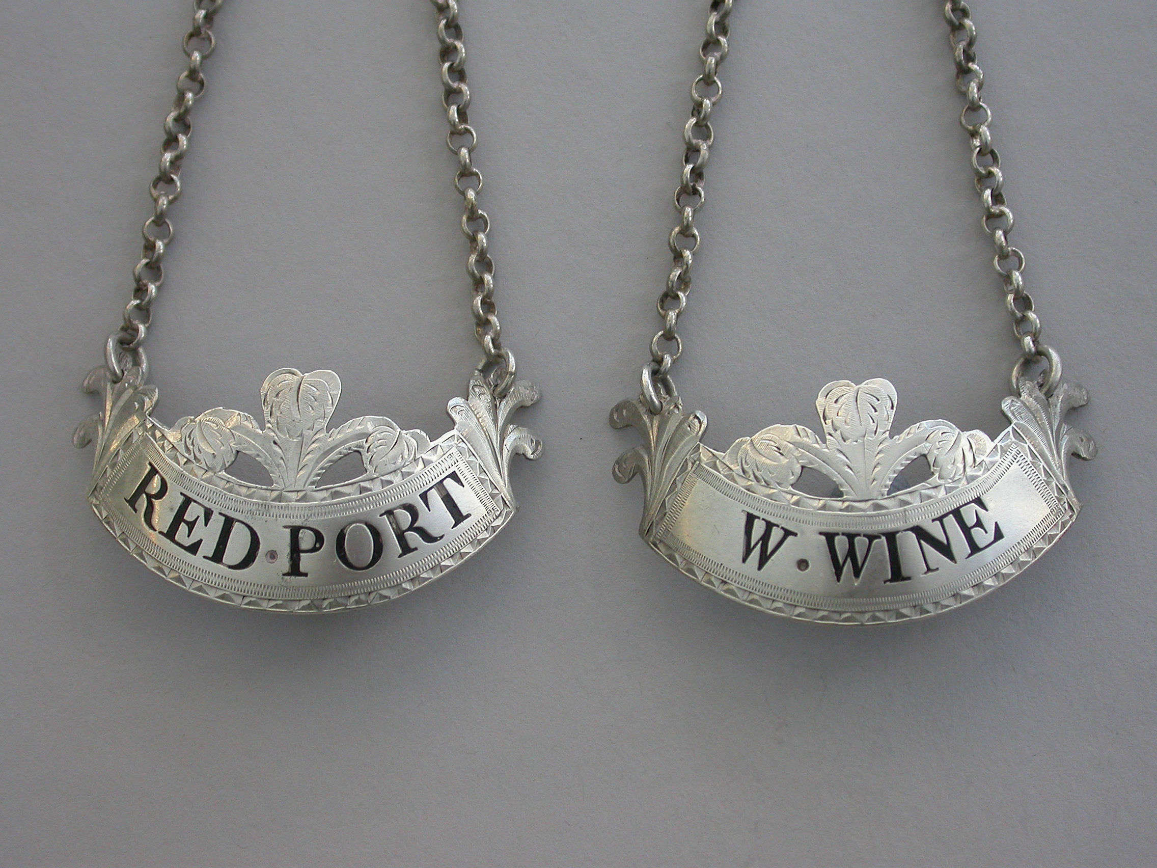 A very good pair George III silver Wine Label of ""Prince of Wales Feathers"" form, featuring a plume of three ostrich feathers above bright-cut engraved curved narrow rectangular labels with engraved foliate feathered ends, incised and niello filled for W*WINE & RED PORT.
