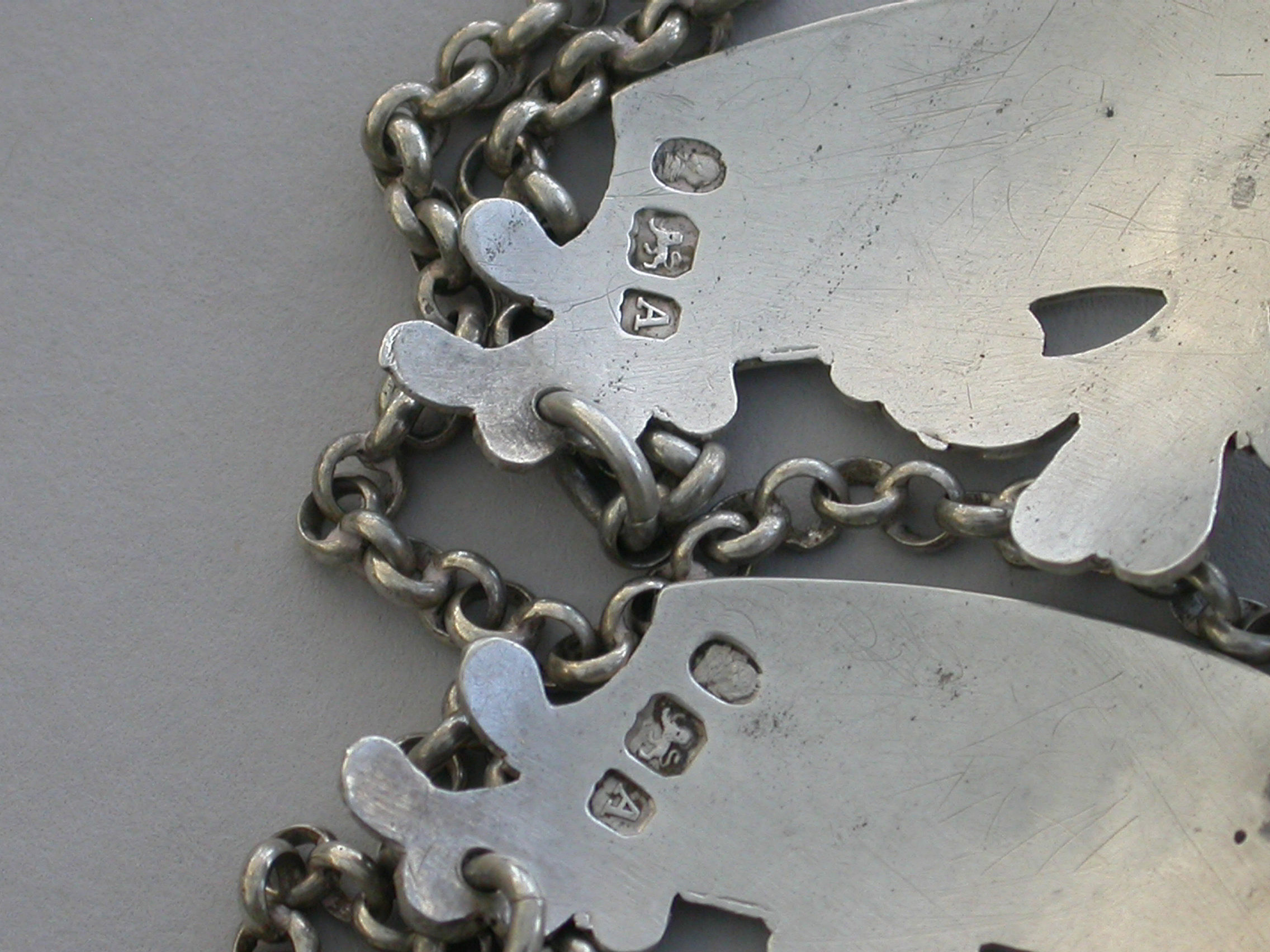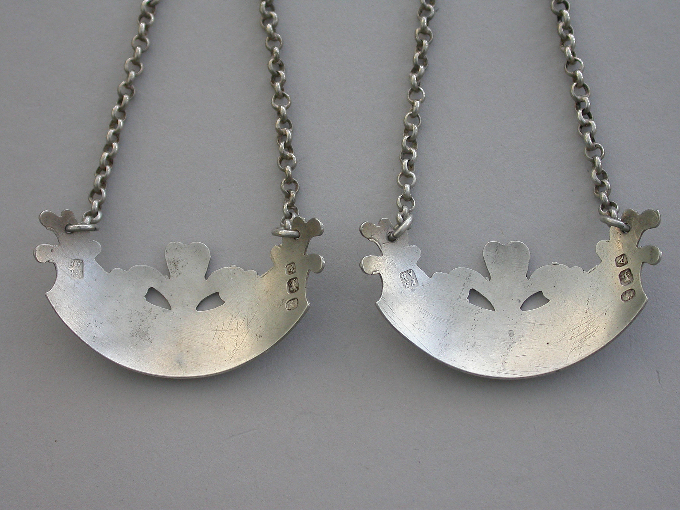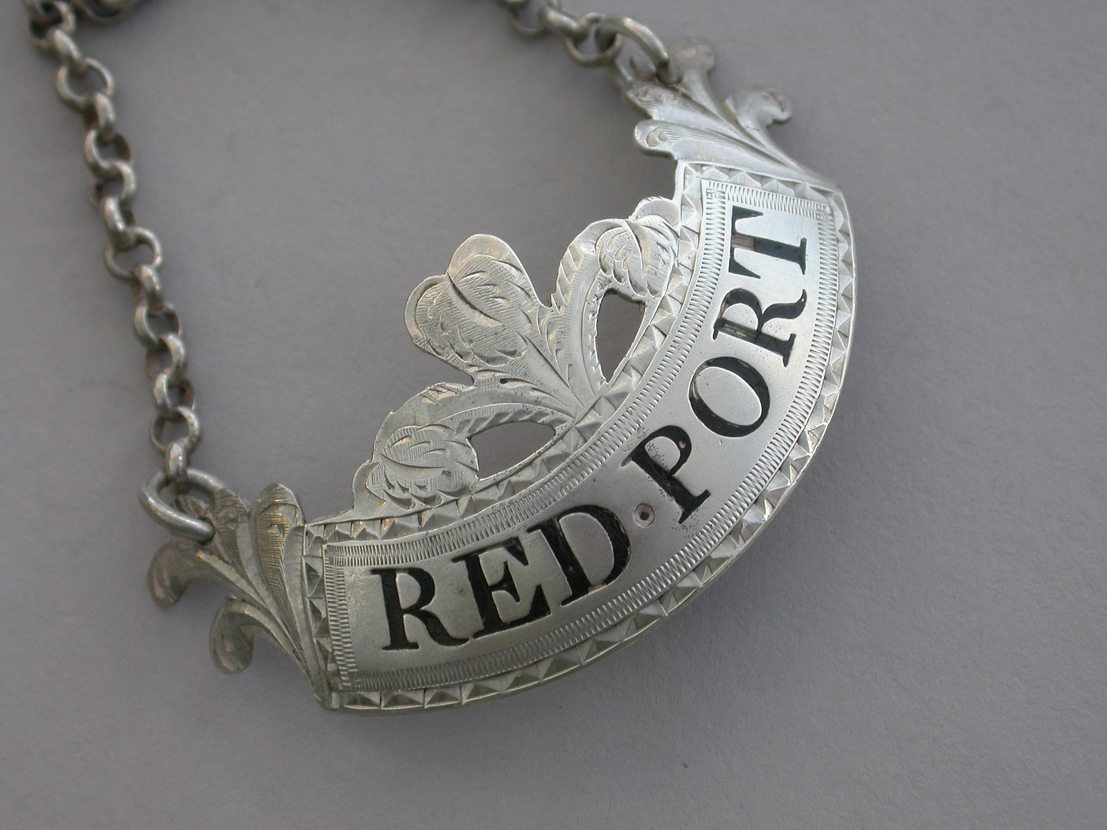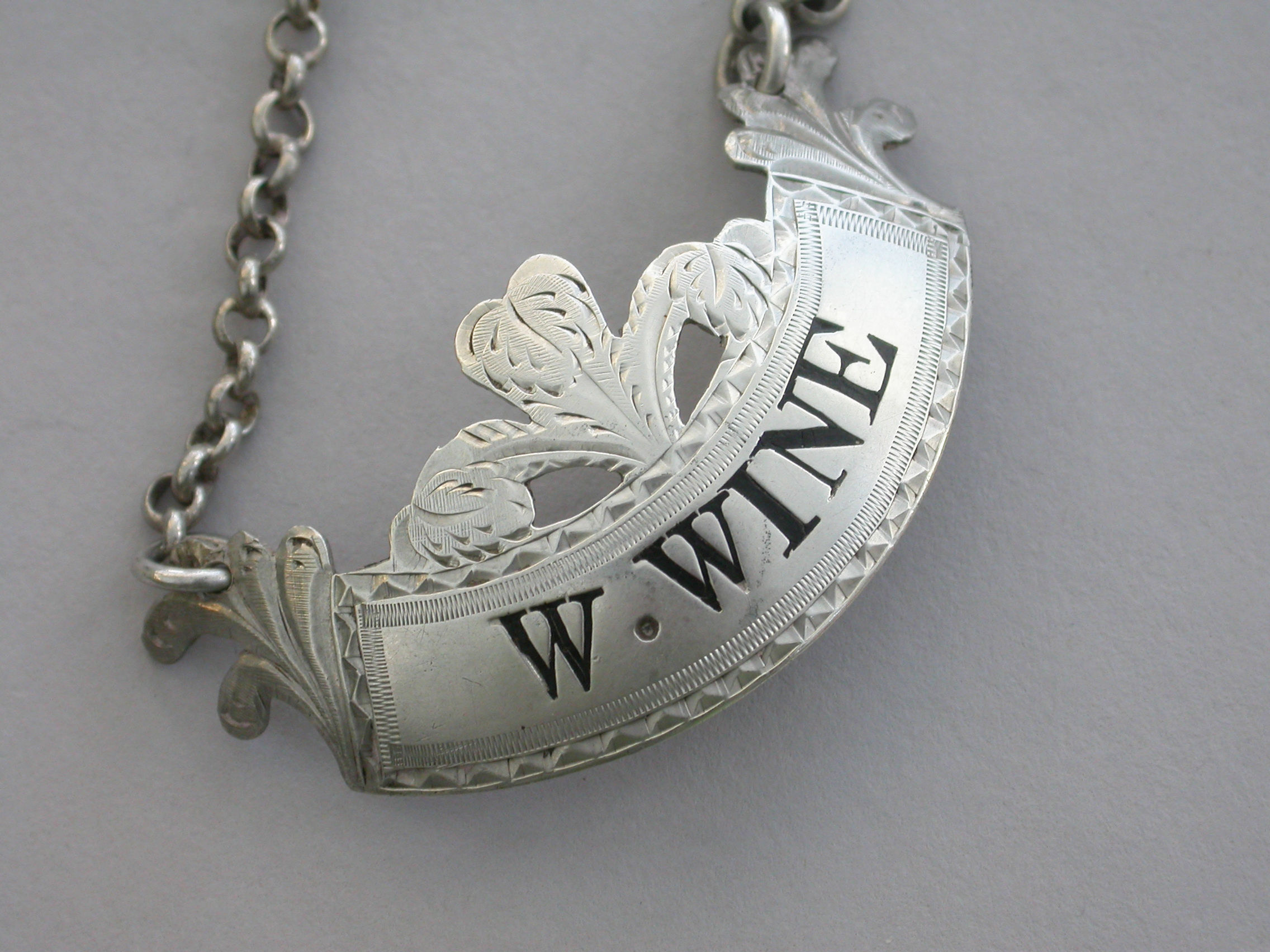 A very good pair George III silver Wine Label of ""Prince of Wales Feathers"" form, featuring a plume of three ostrich feathers above bright-cut engraved curved narrow rectangular labels with engraved foliate feathered ends, incised and niello filled for W*WINE & RED PORT.