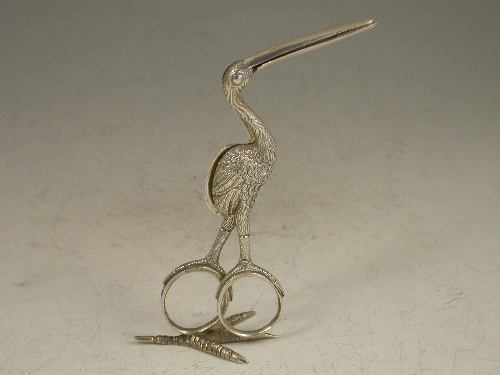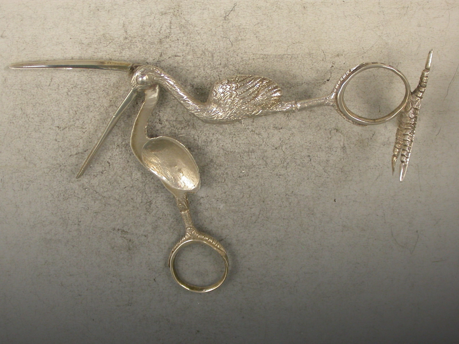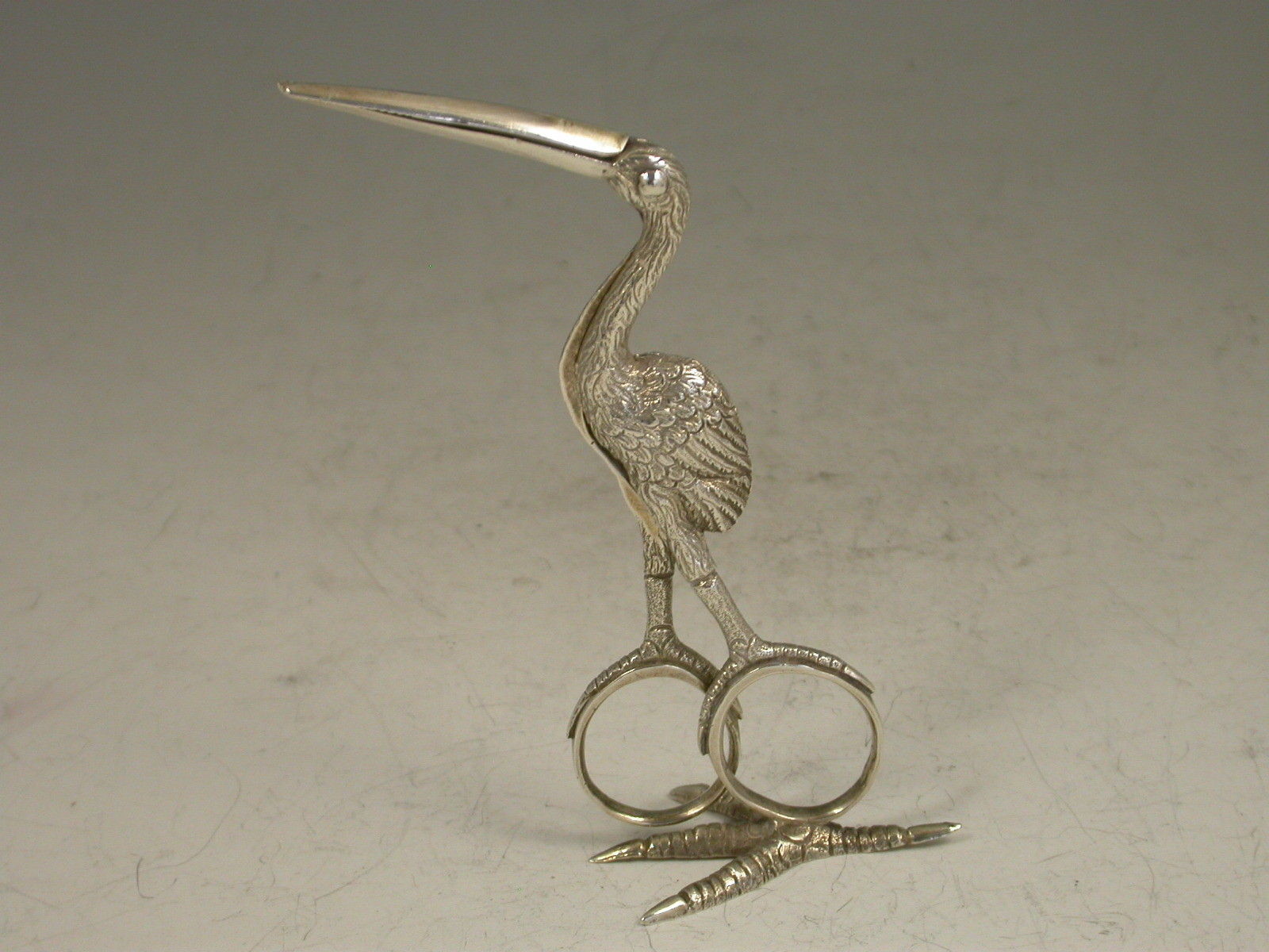 A pair of early Victorian cast silver Ribbon Threaders made in the form of a Stork, standing on a four claw foot.