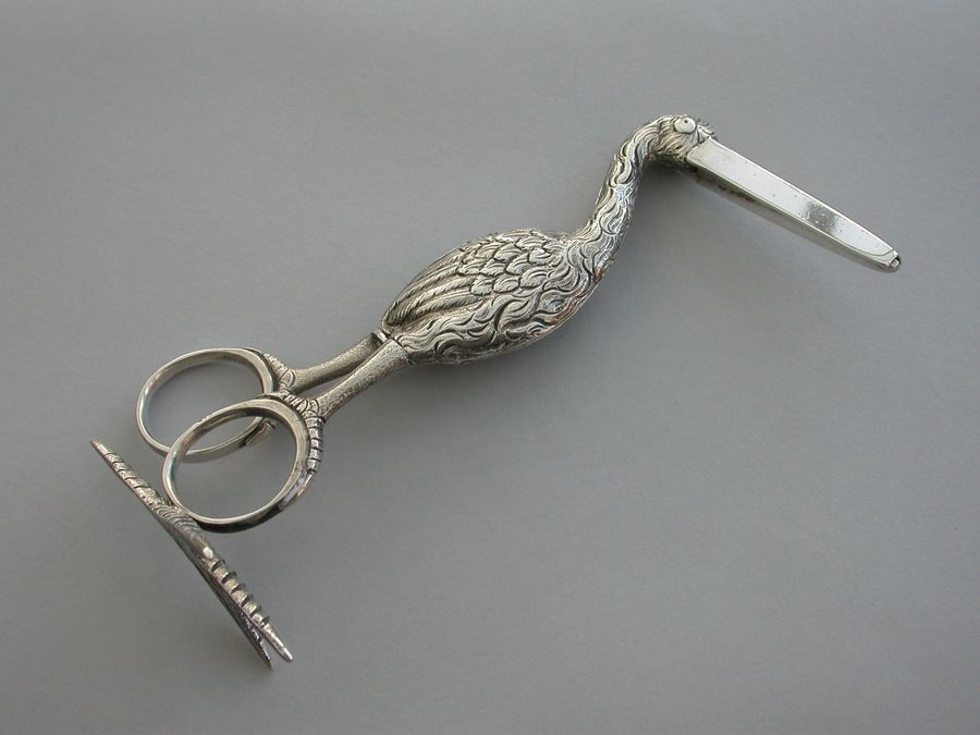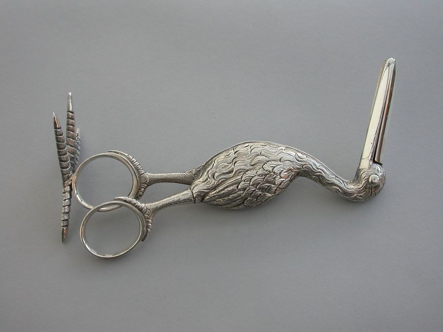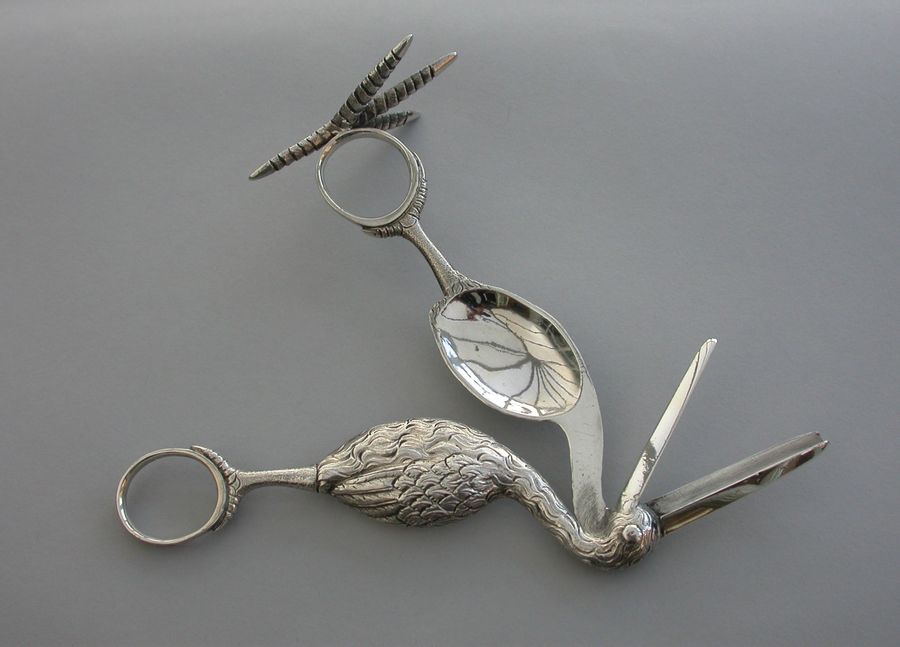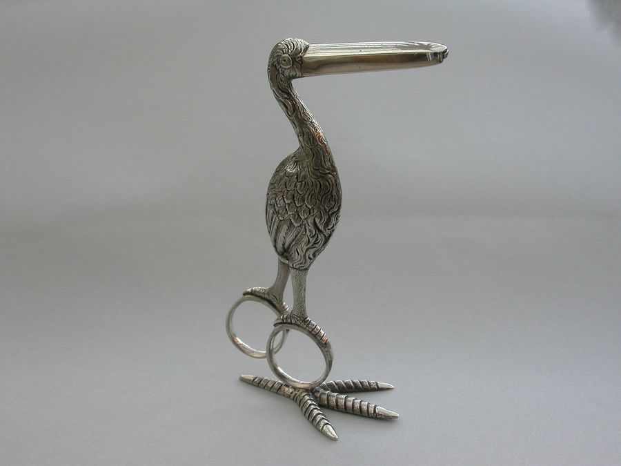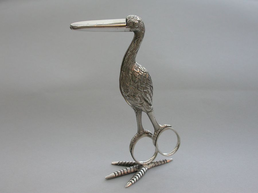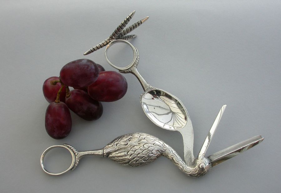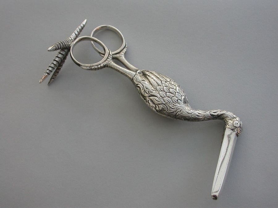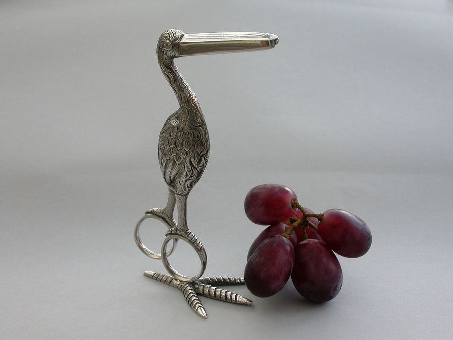 A pair of fine quality and unusual early Victorian cast silver Grape Scissors, made in the form of a standing Stork.