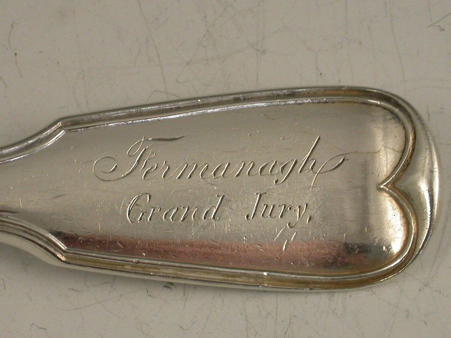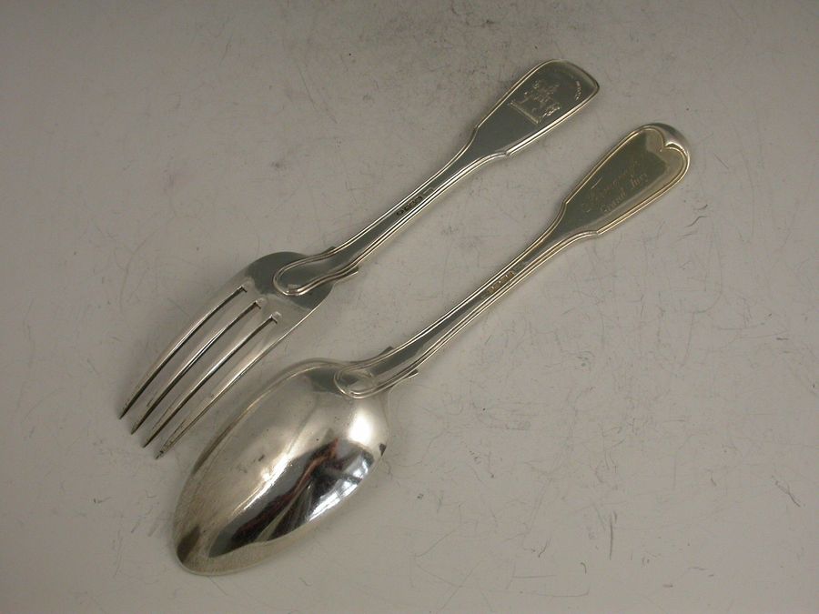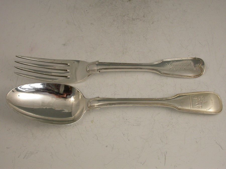 An interesting matched pair of Victorian Irish Loyalist silver fiddle and thread pattern Table Spoon and Fork, the reverse of the handle engraved ""Fermanagh Grand Jury"" the fronts engraved with a crest depicting William of Orange on horseback below the motto ""The Glorious Memory"".