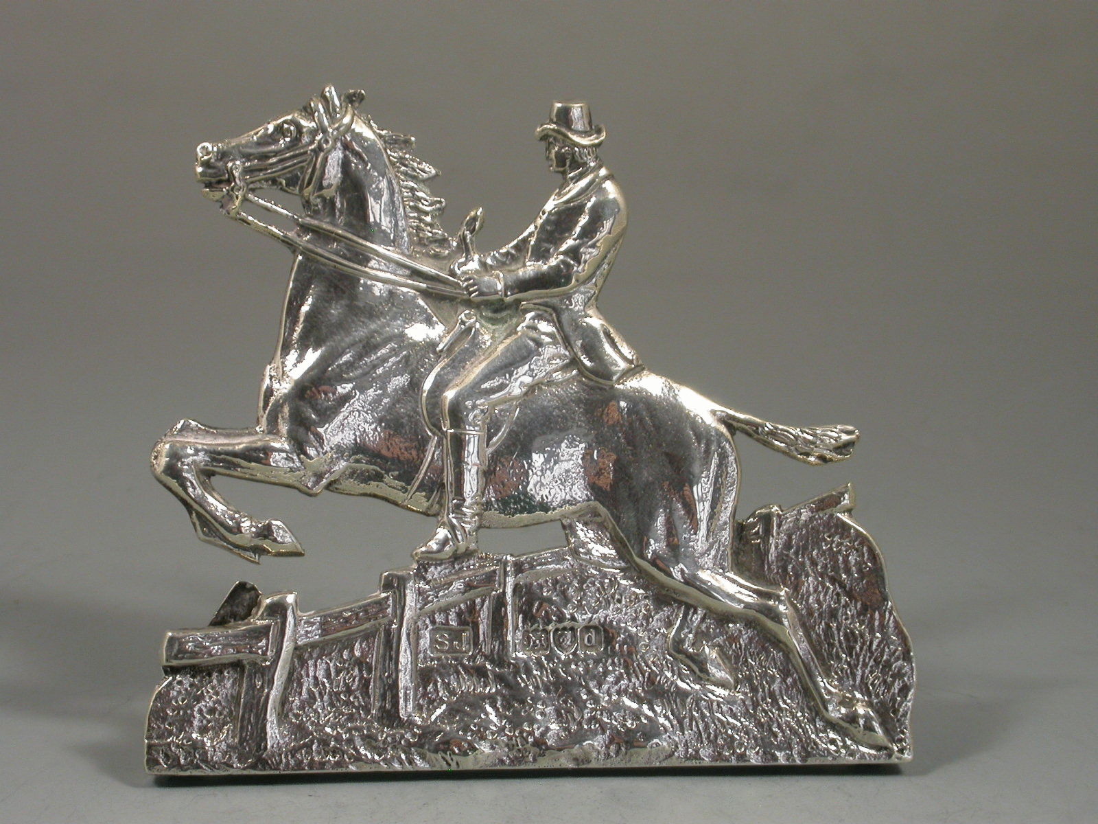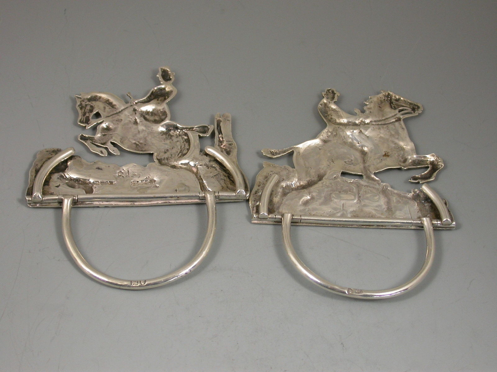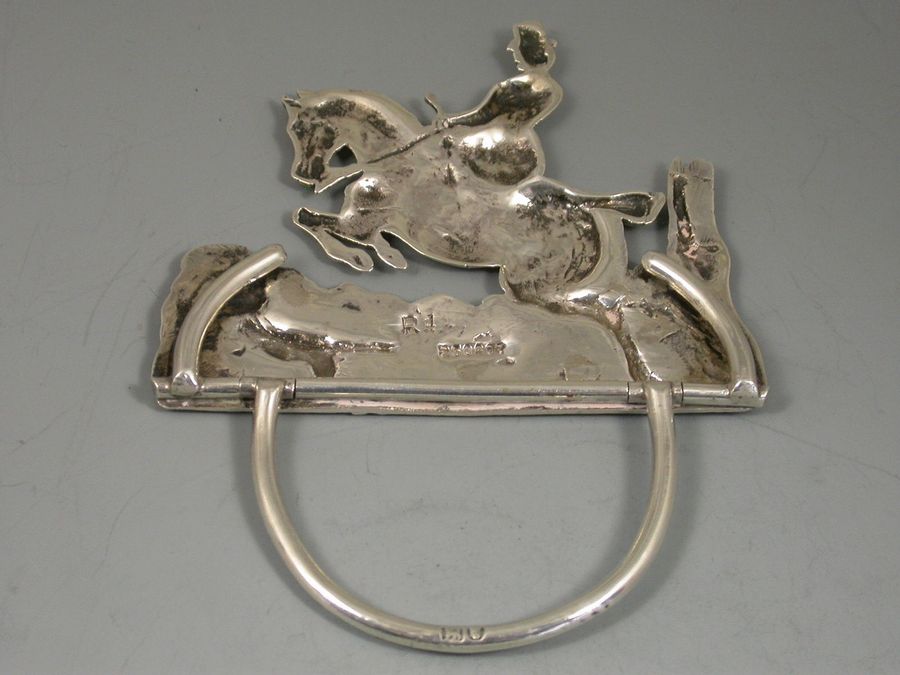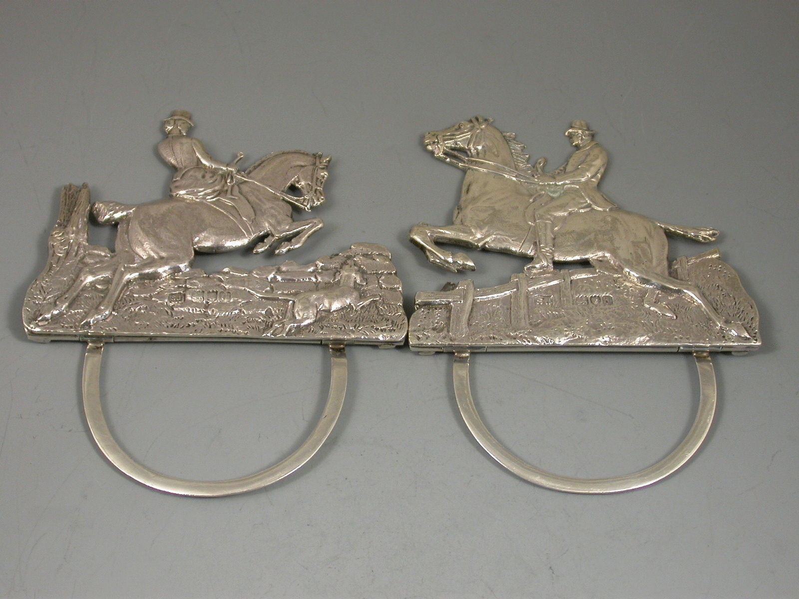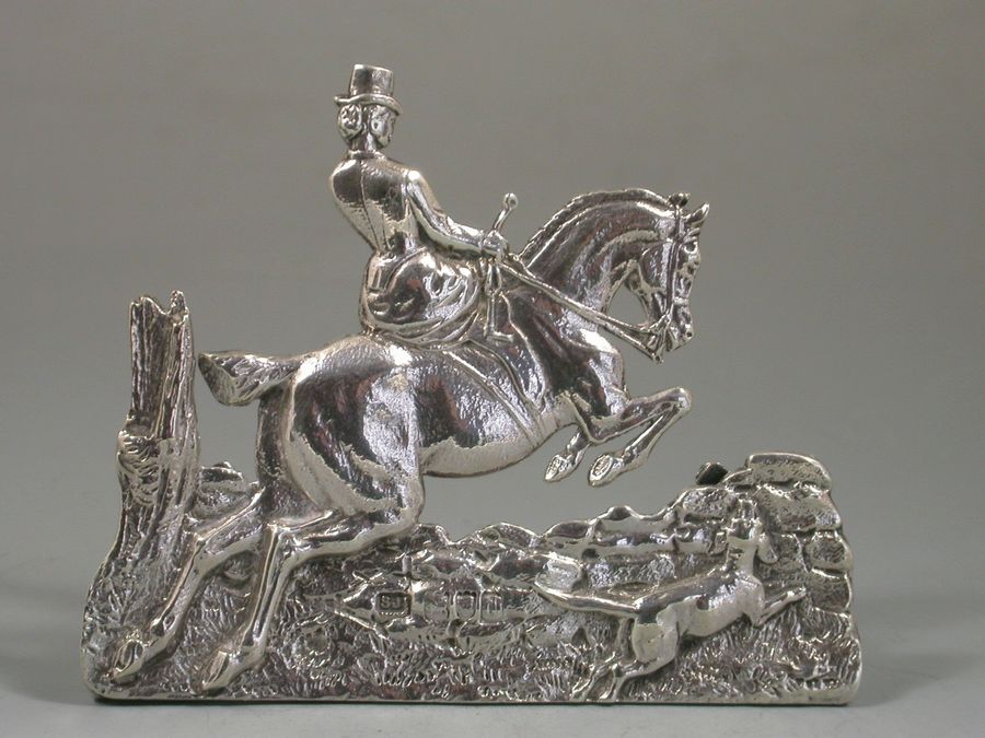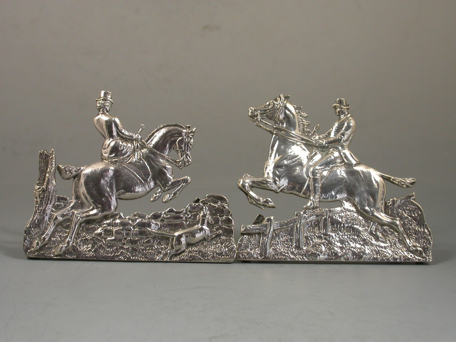 A very fine quality and large pair of Victorian cast silver Menu holders formed as a Huntsman and Huntswomen on horse back, one jumping a fence the other jumping a stone wall, a hound in attendance, the lady riding sidesaddle. On 'D' shaped hinged supports.