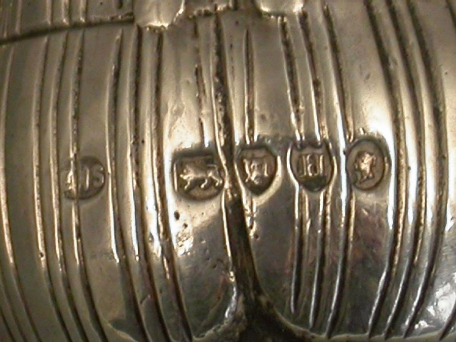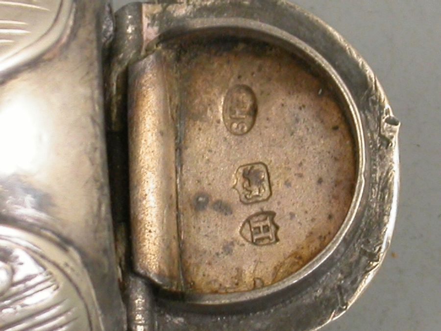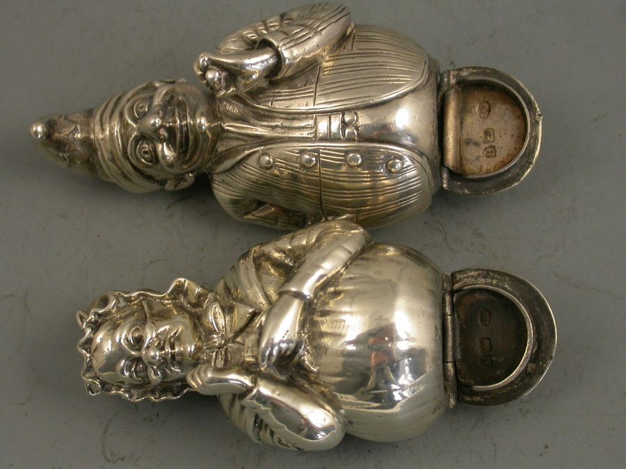 A pair of Victoria fine quality cast silver Peppers formed as Mr Punch and his wife Judy, with flat circular hinged covers. Mr Punch smoking a cigar and Judy taking a pinch of snuff.