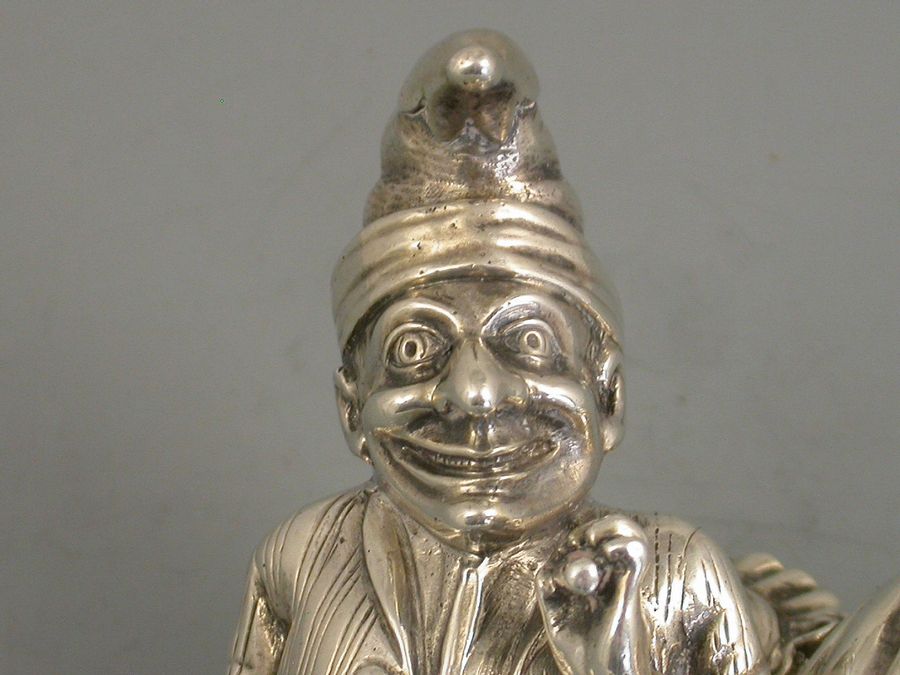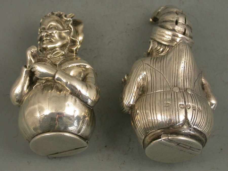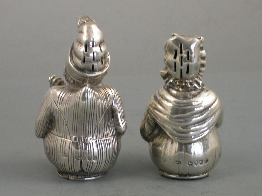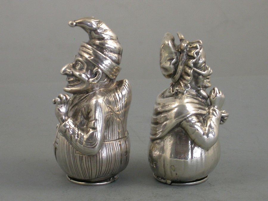 Pair Victorian Novelty Cast Silver Peppers Punch & Judy