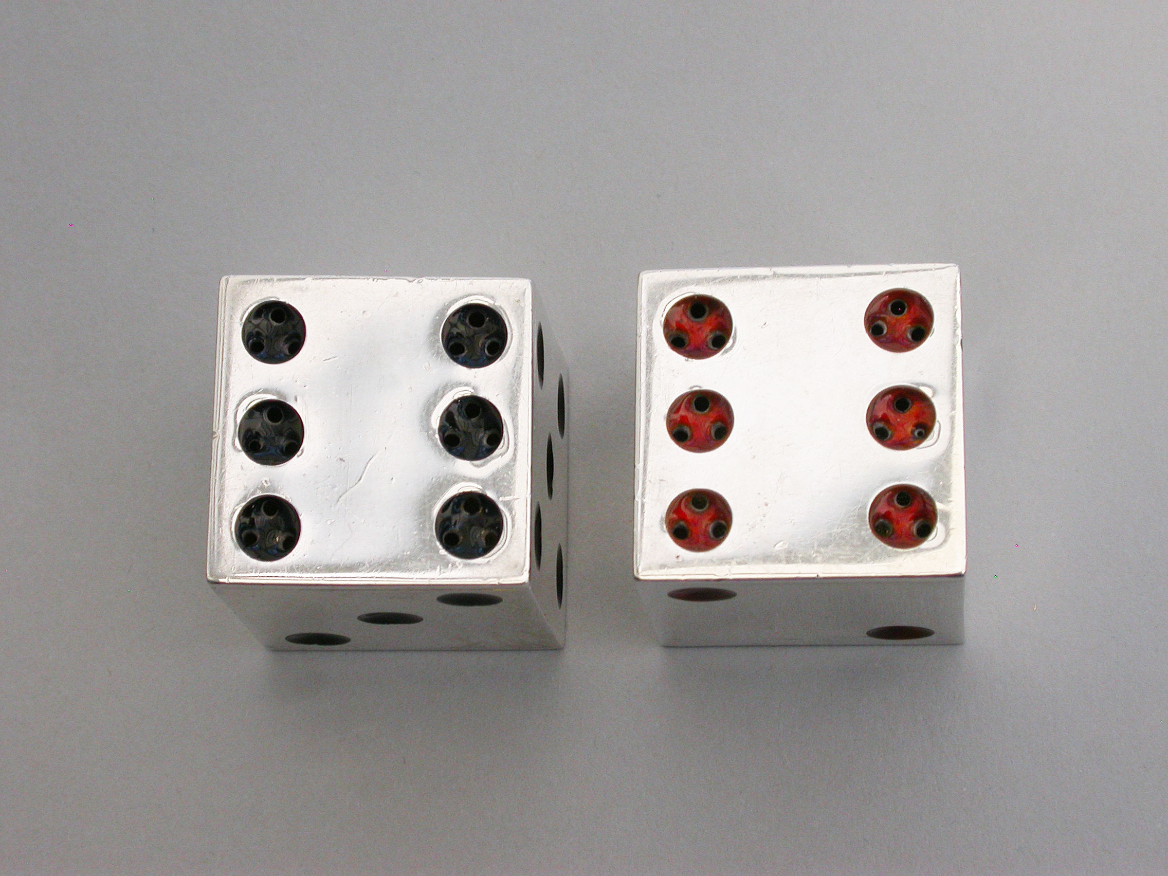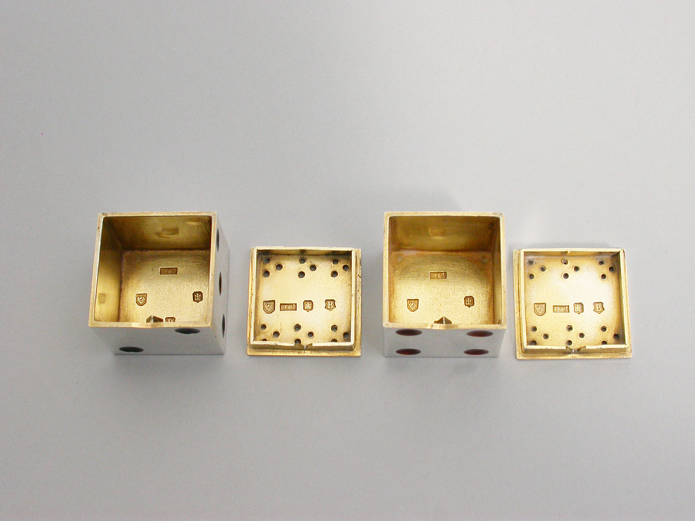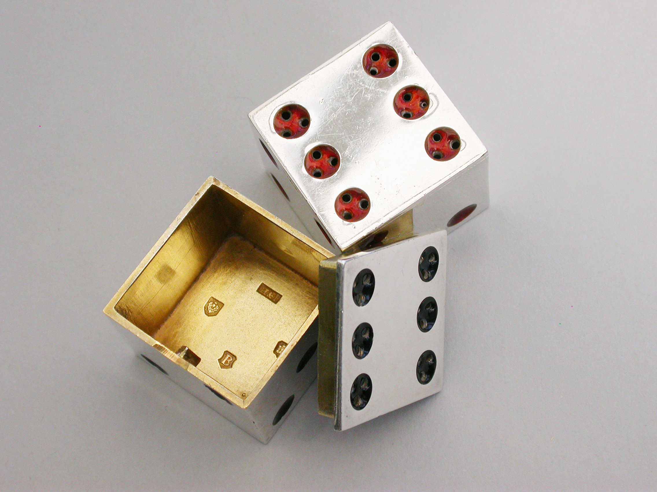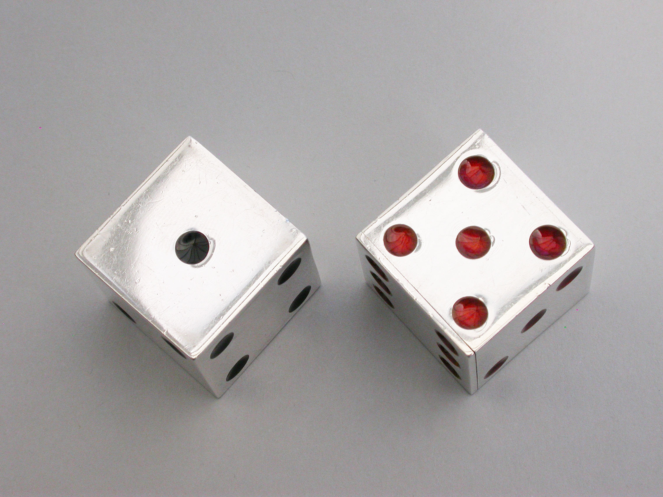 A rare pair of Victorian novelty Scottish silver and enamel Peppers made in the form of Dice, with black and red enamel numbers. Pull-off covers and silver gilt interiors.