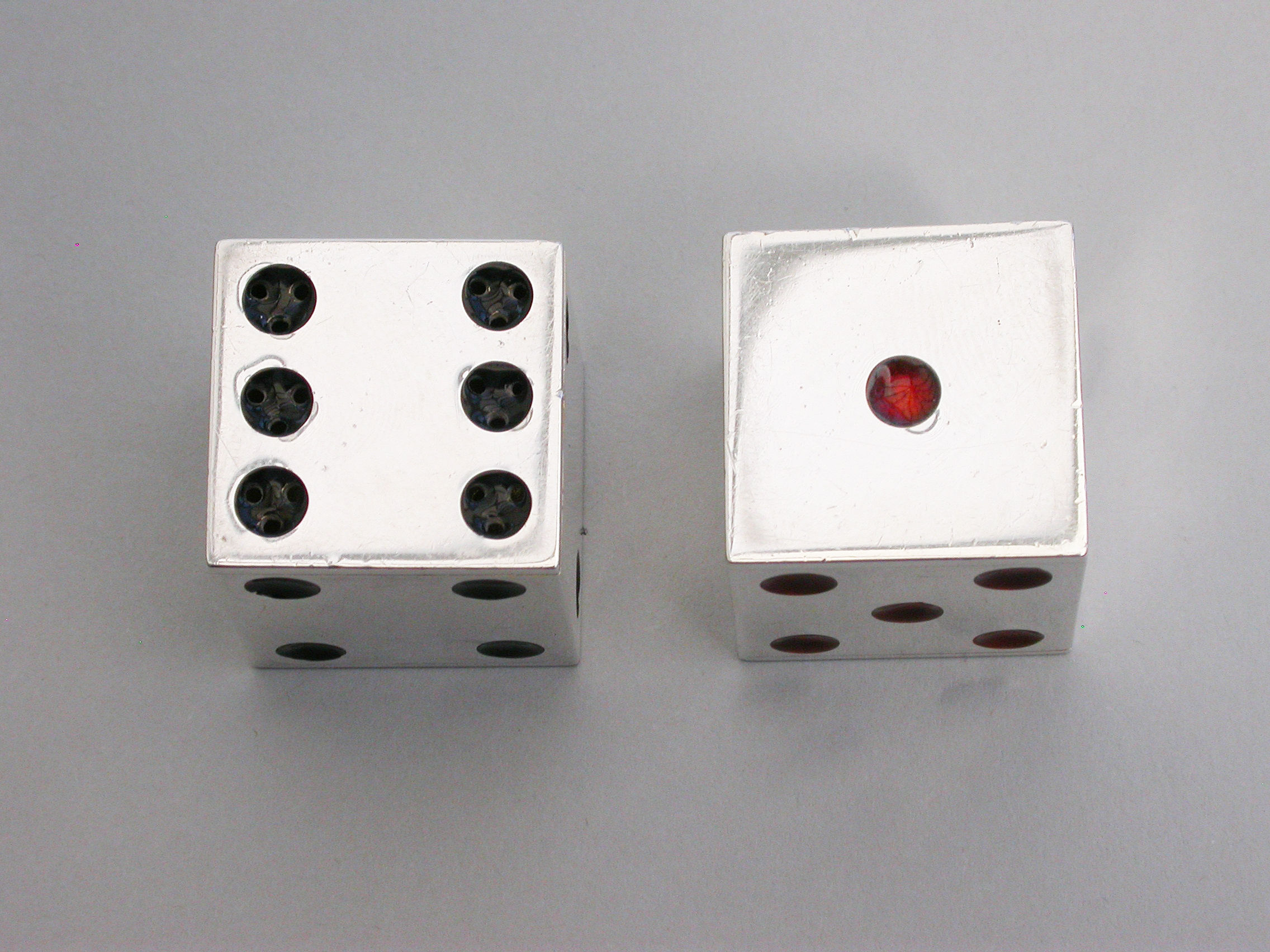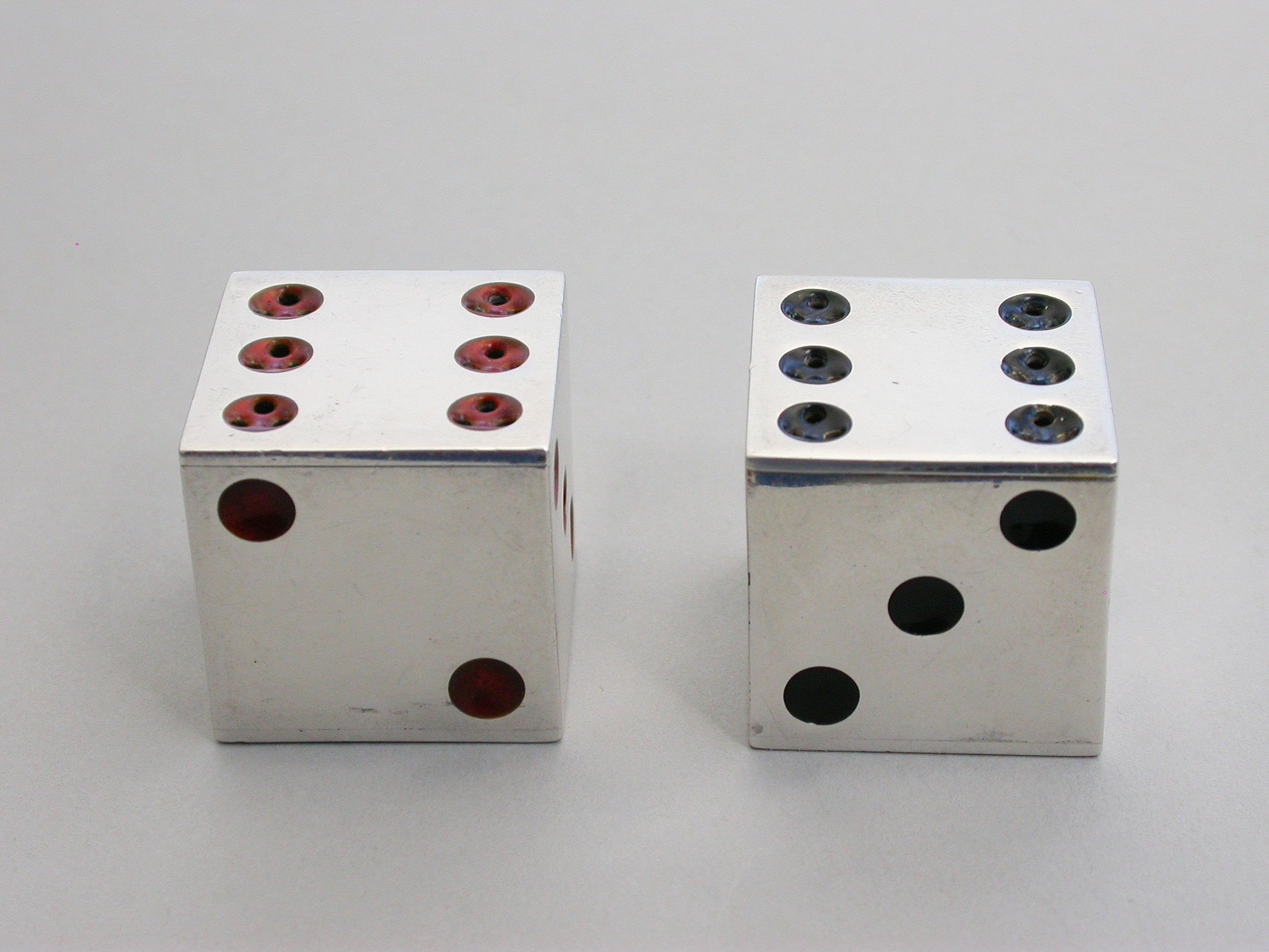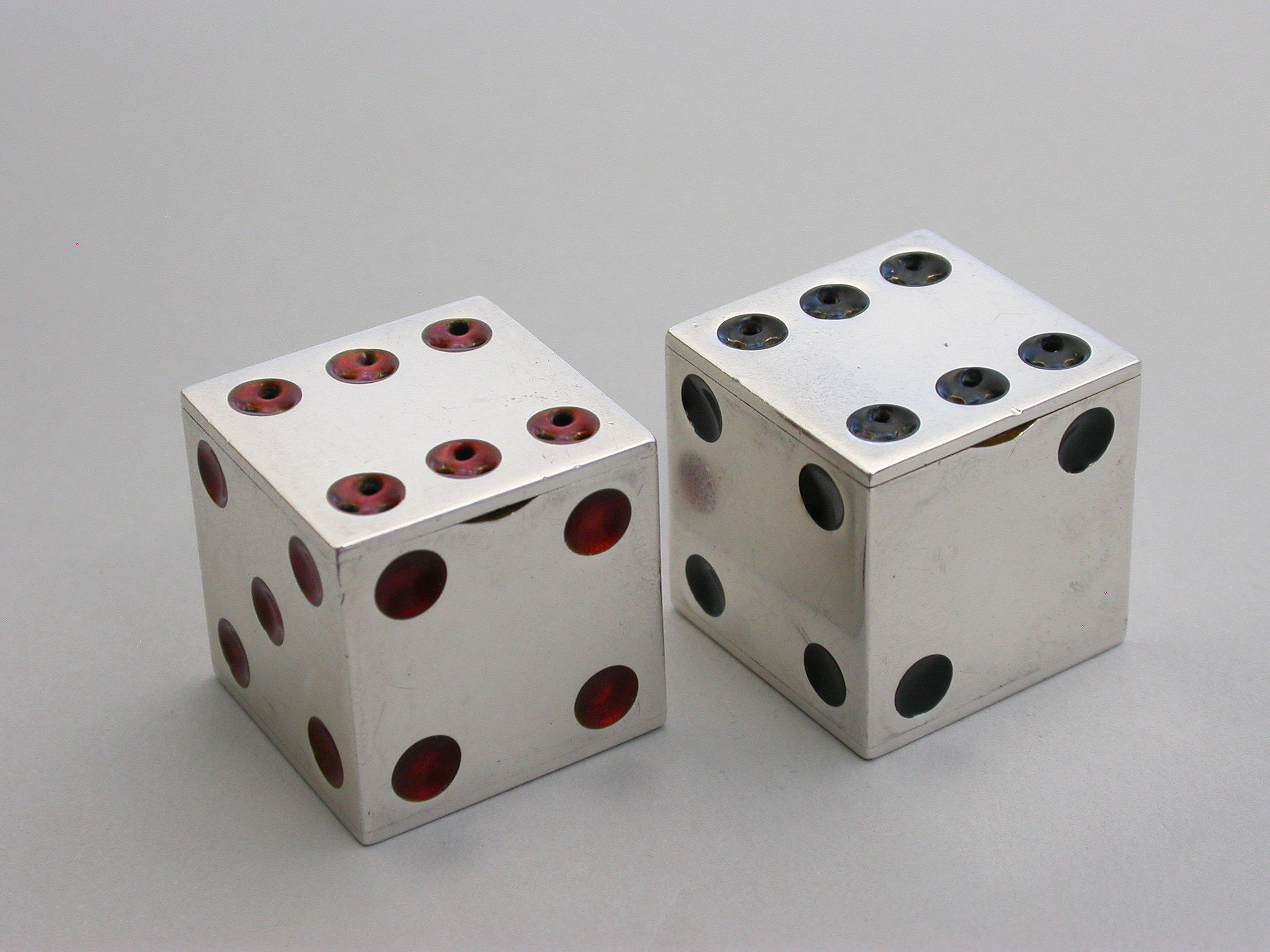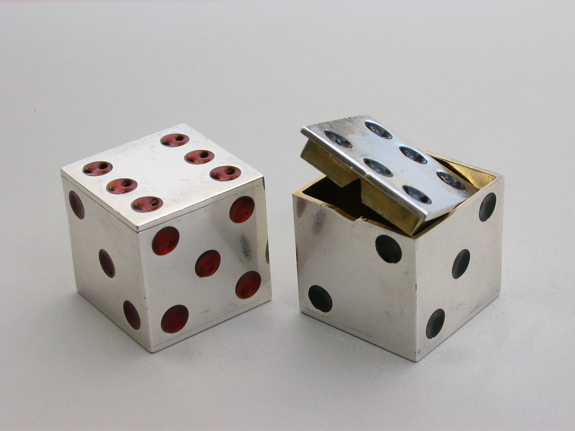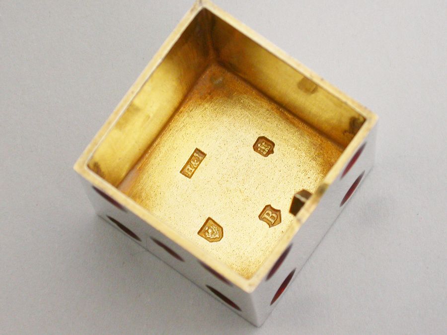 A rare pair of Victorian novelty Scottish silver and enamel Peppers made in the form of Dice, with black and red enamel numbers. Pull-off covers and silver gilt interiors.