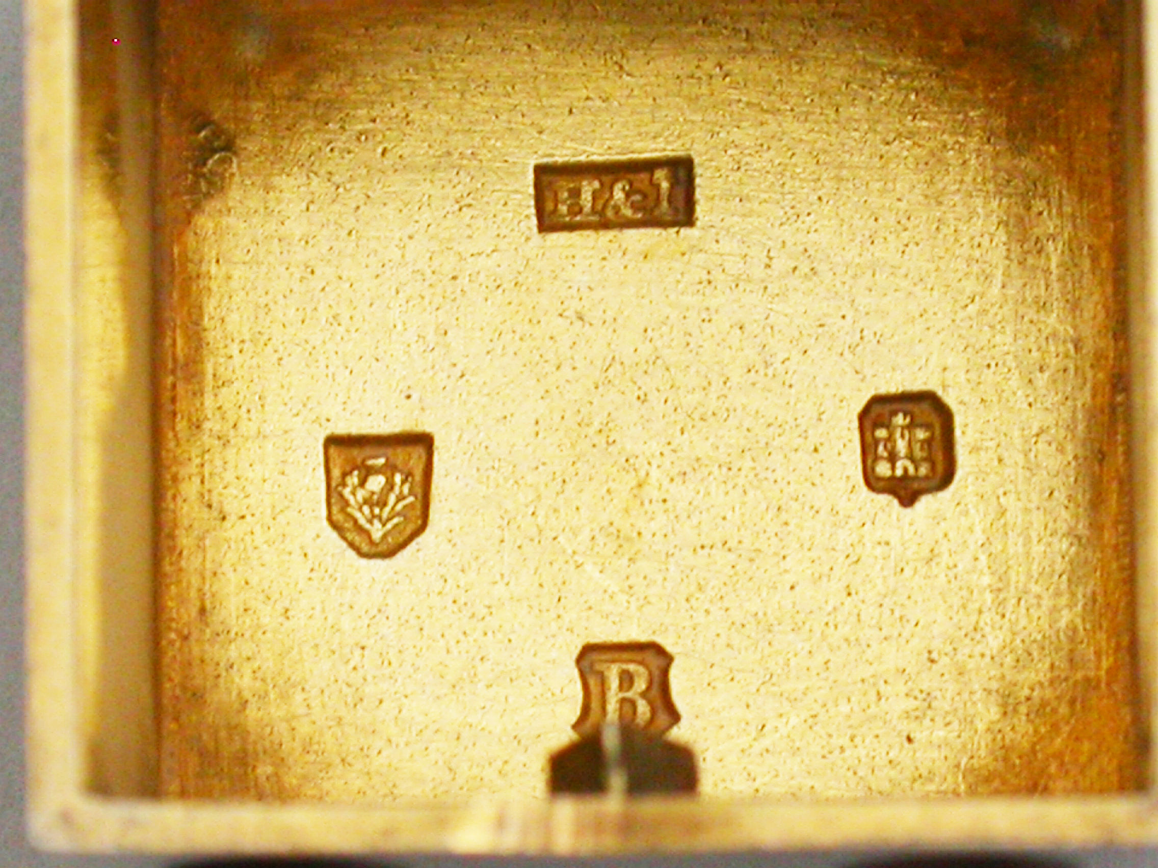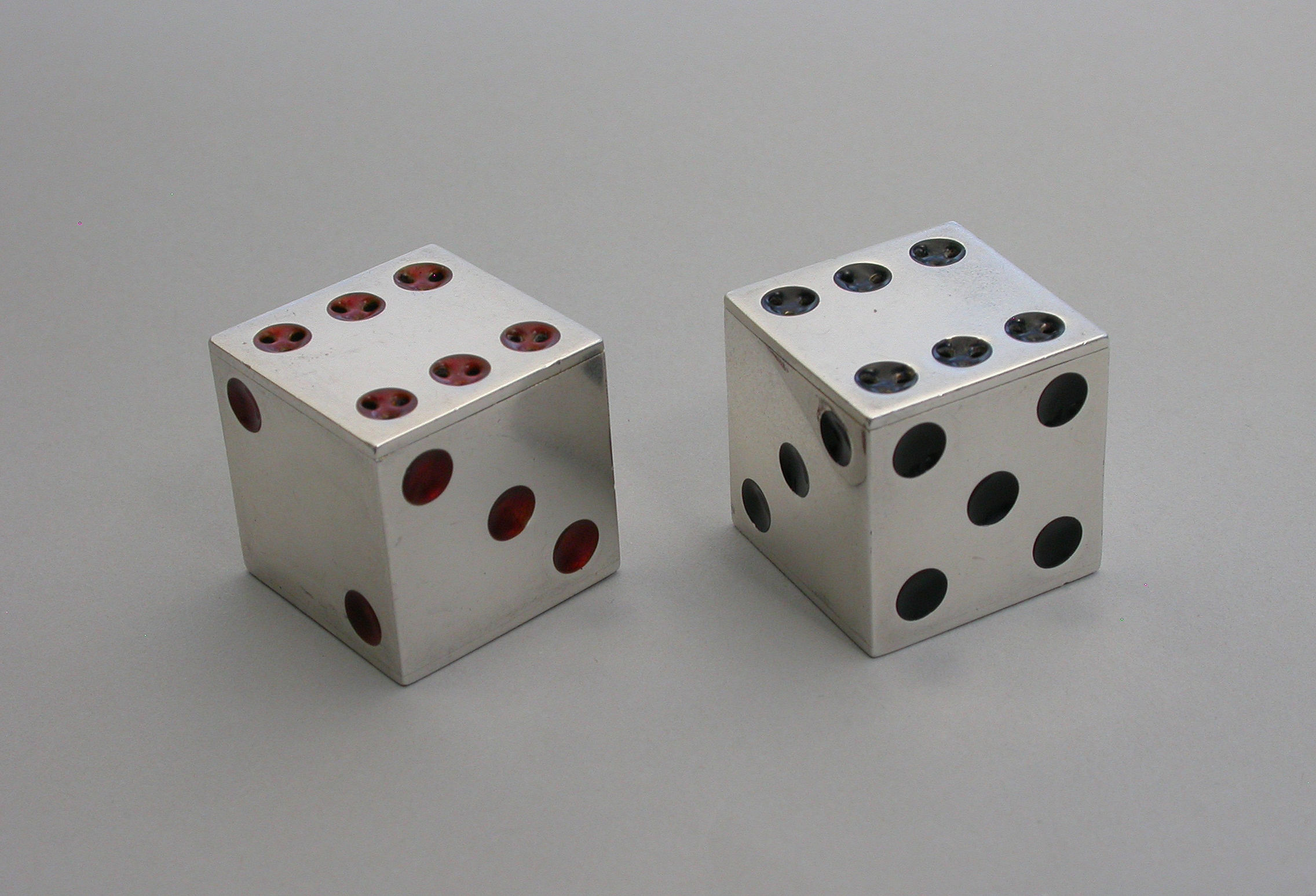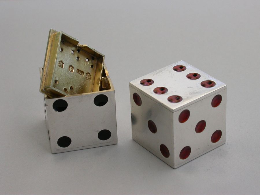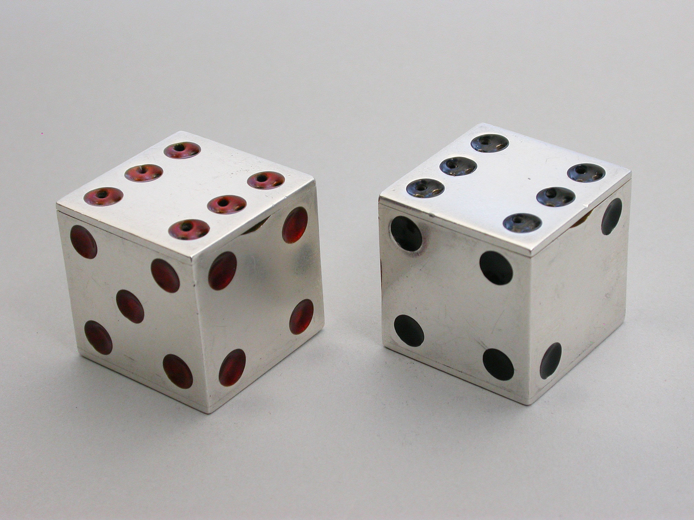 A rare pair of Victorian novelty Scottish silver and enamel Peppers made in the form of Dice, with black and red enamel numbers. Pull-off covers and silver gilt interiors.