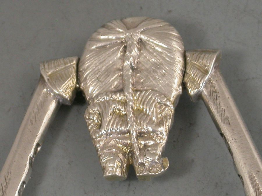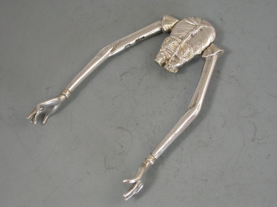 A pair of Victorian novelty silver Sugar Nips in the form of a Chinaman with short legs and long sprung arms, one red and one green glass eye.