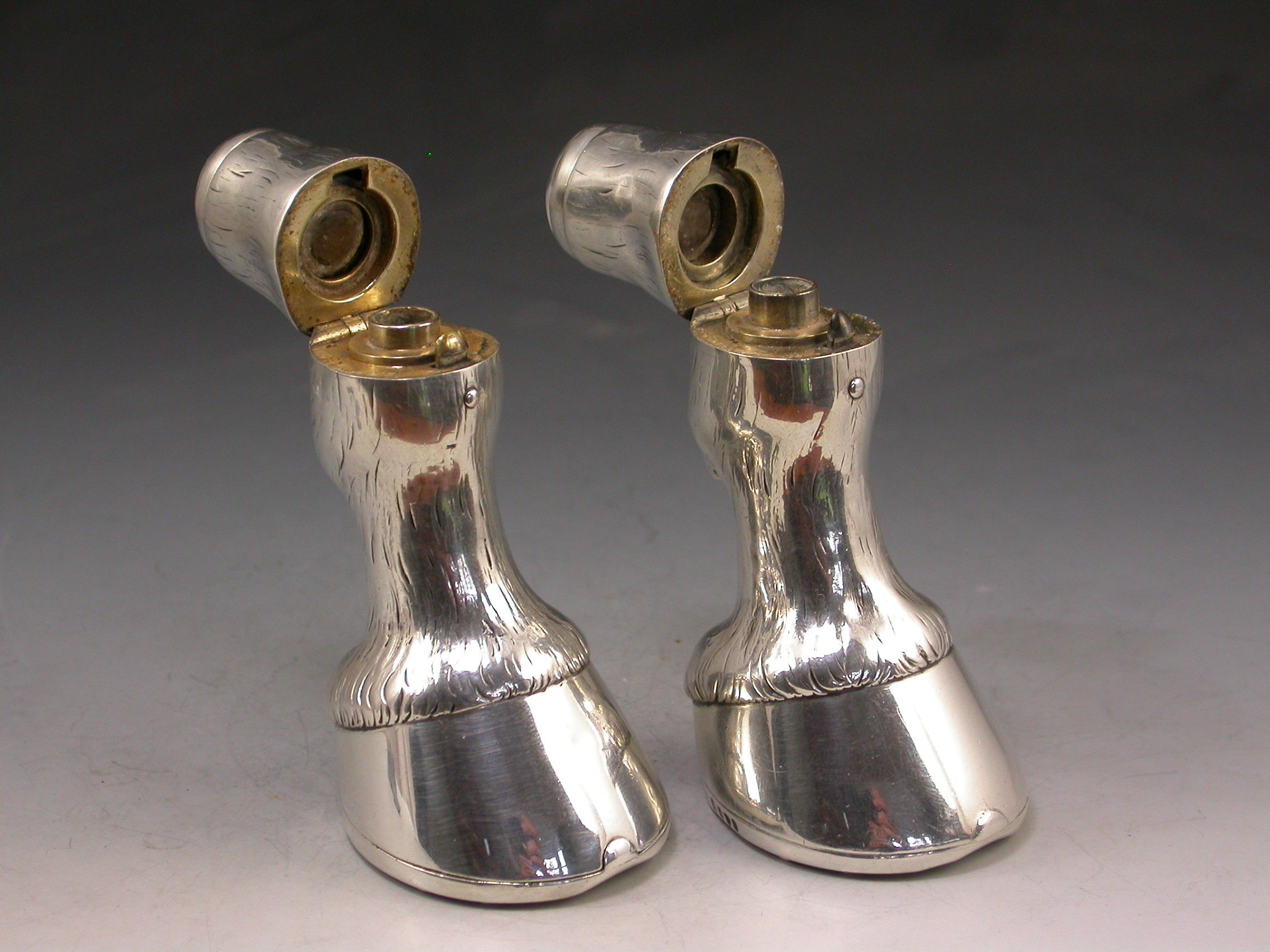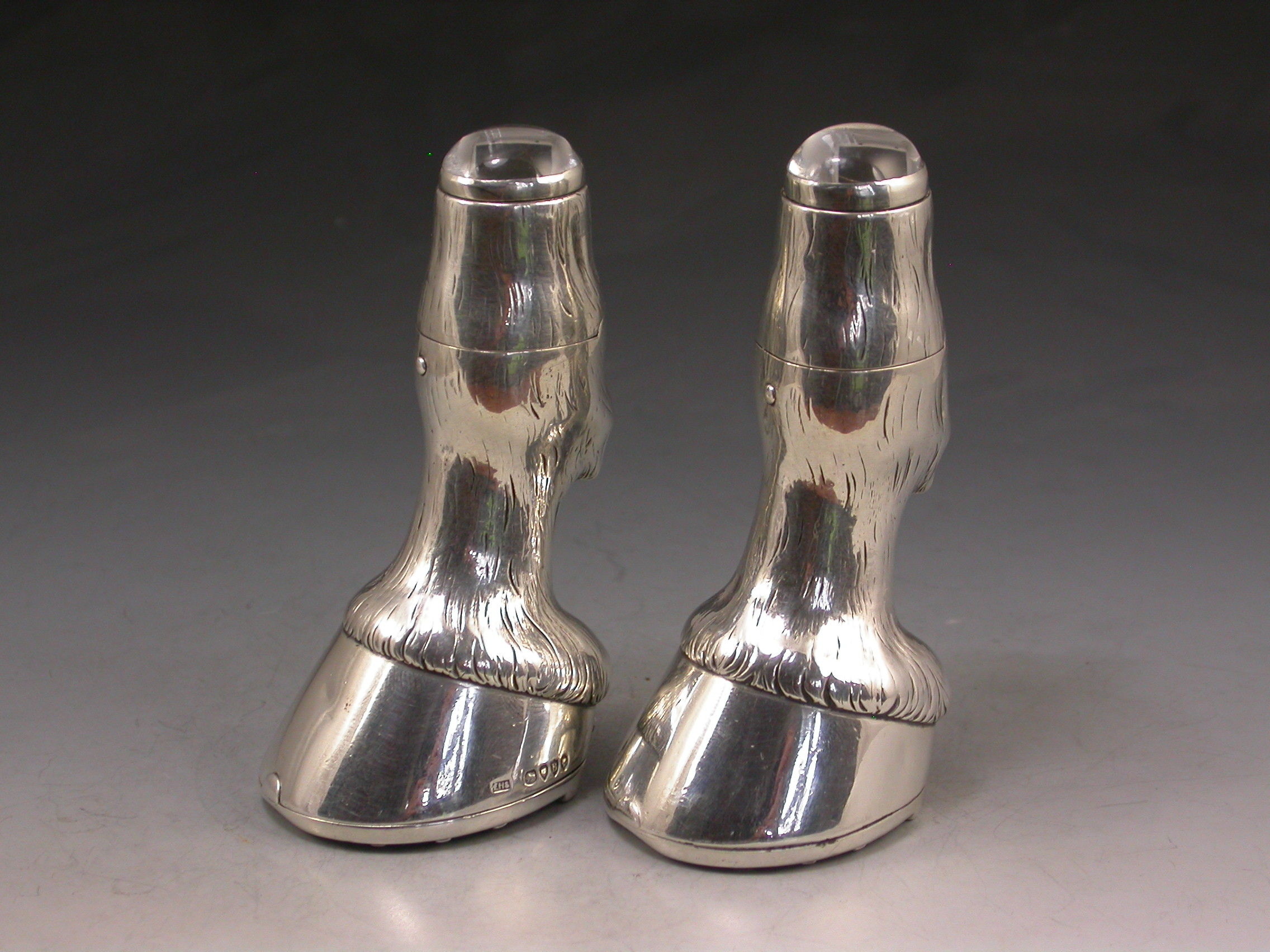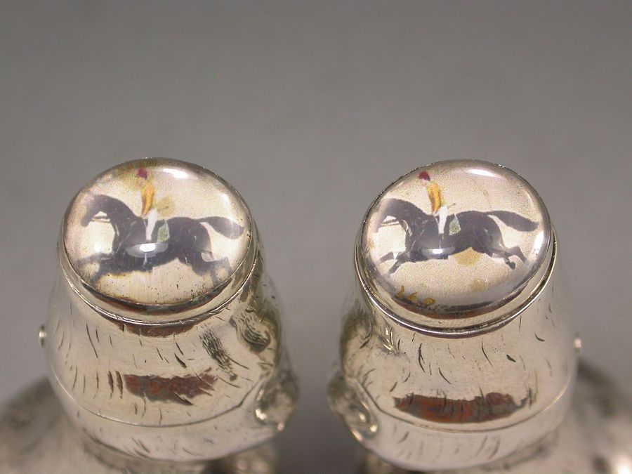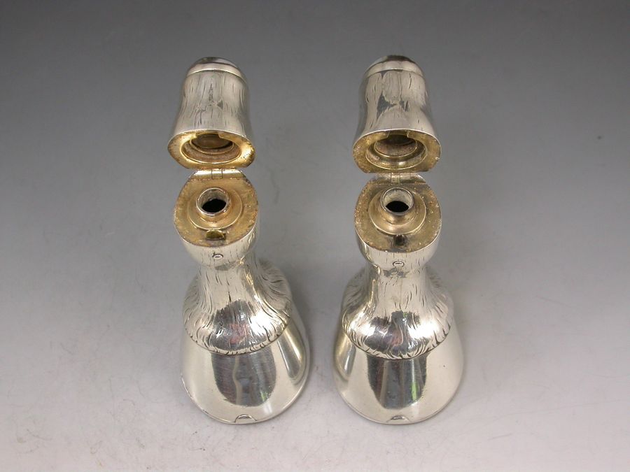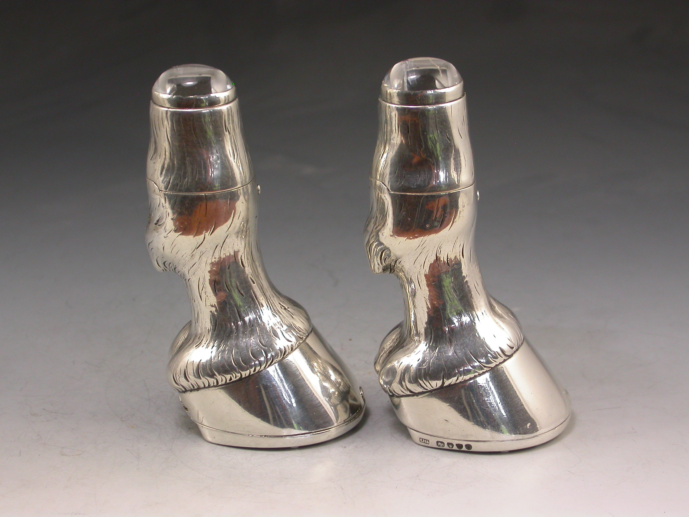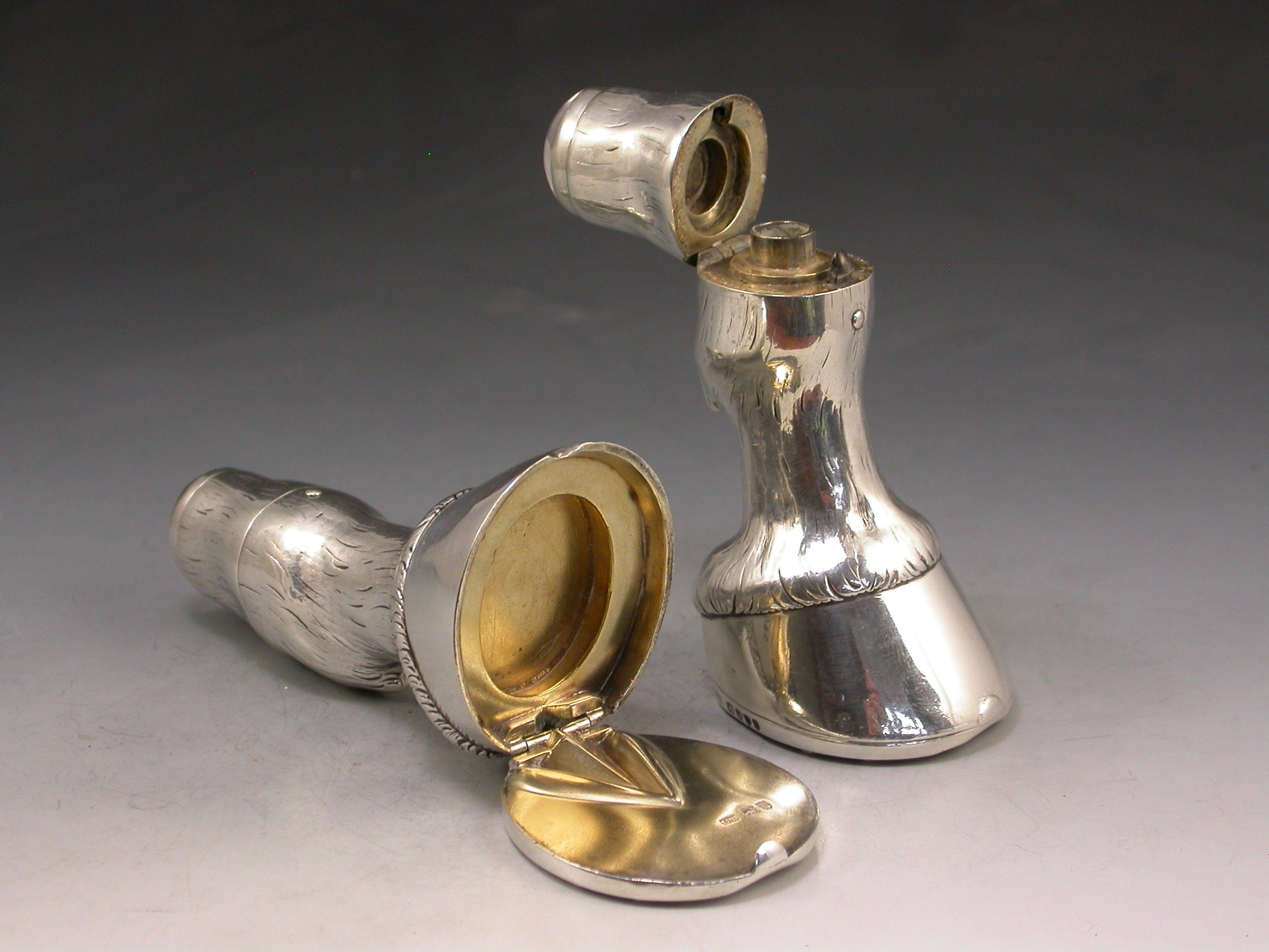 A rare and unusual pair of Victorian novelty silver Scent Bottles made in the form of horses hooves and fetlocks, the hinged lids mounted with domed crystal caps with watercolours of race horses beneath. One with a secondary hinged compartment to the base of the hoof possibly for a photograph or locket. Silver gilt interiors.
