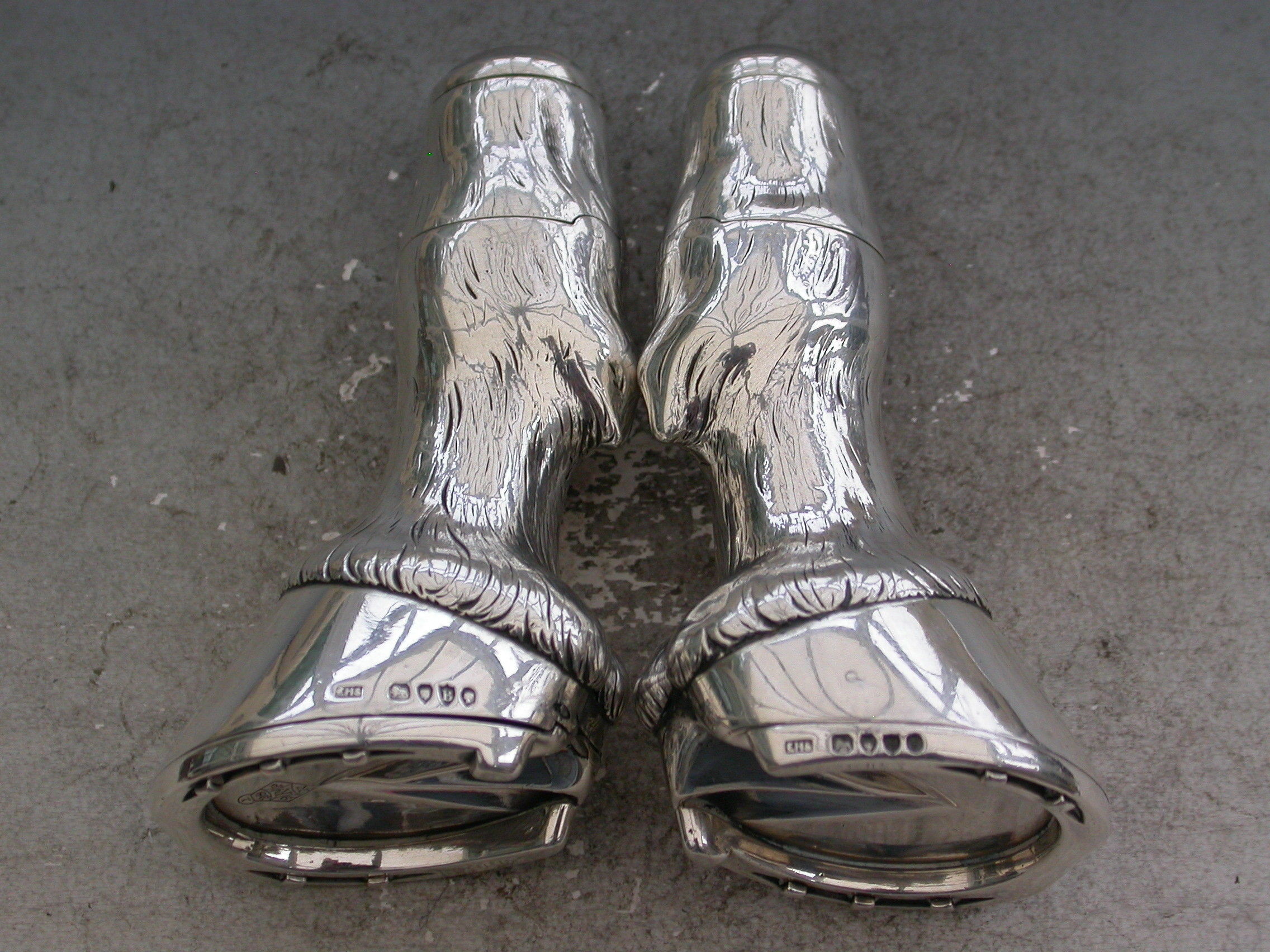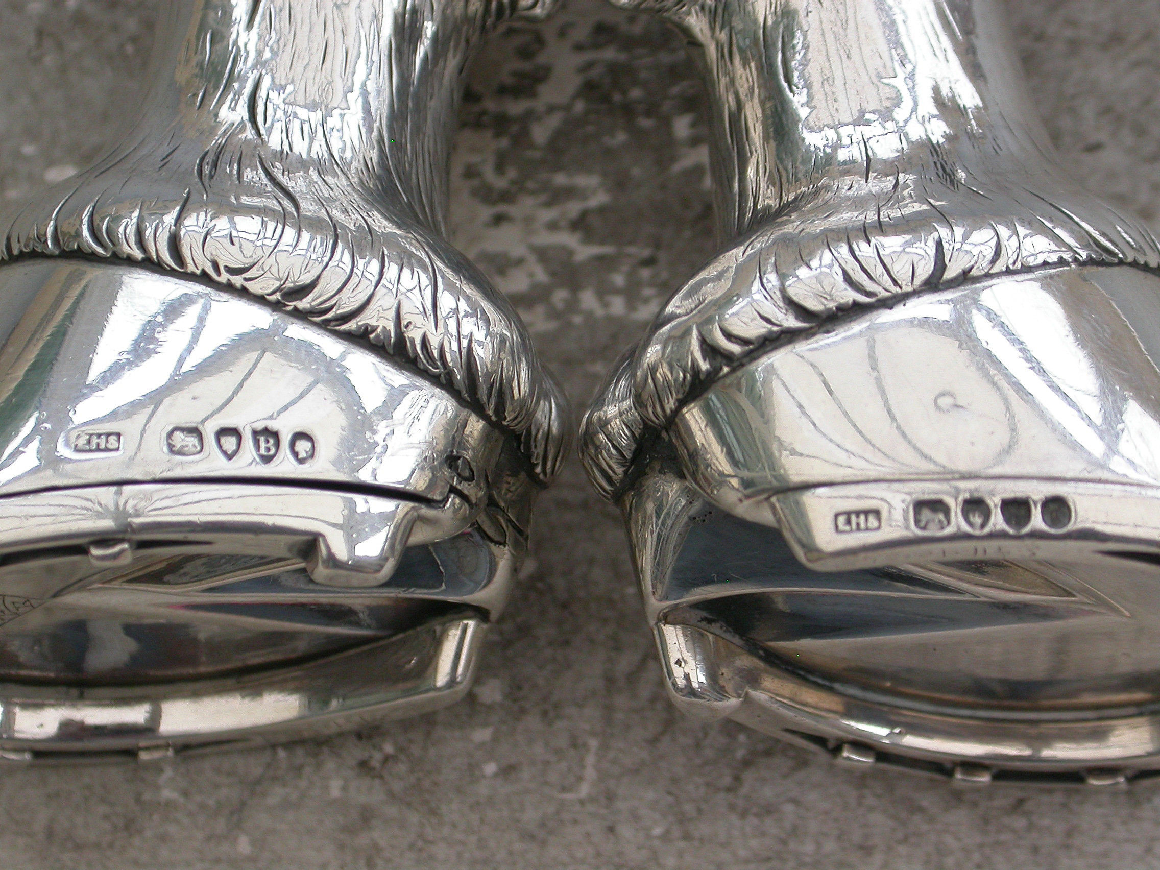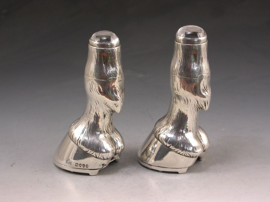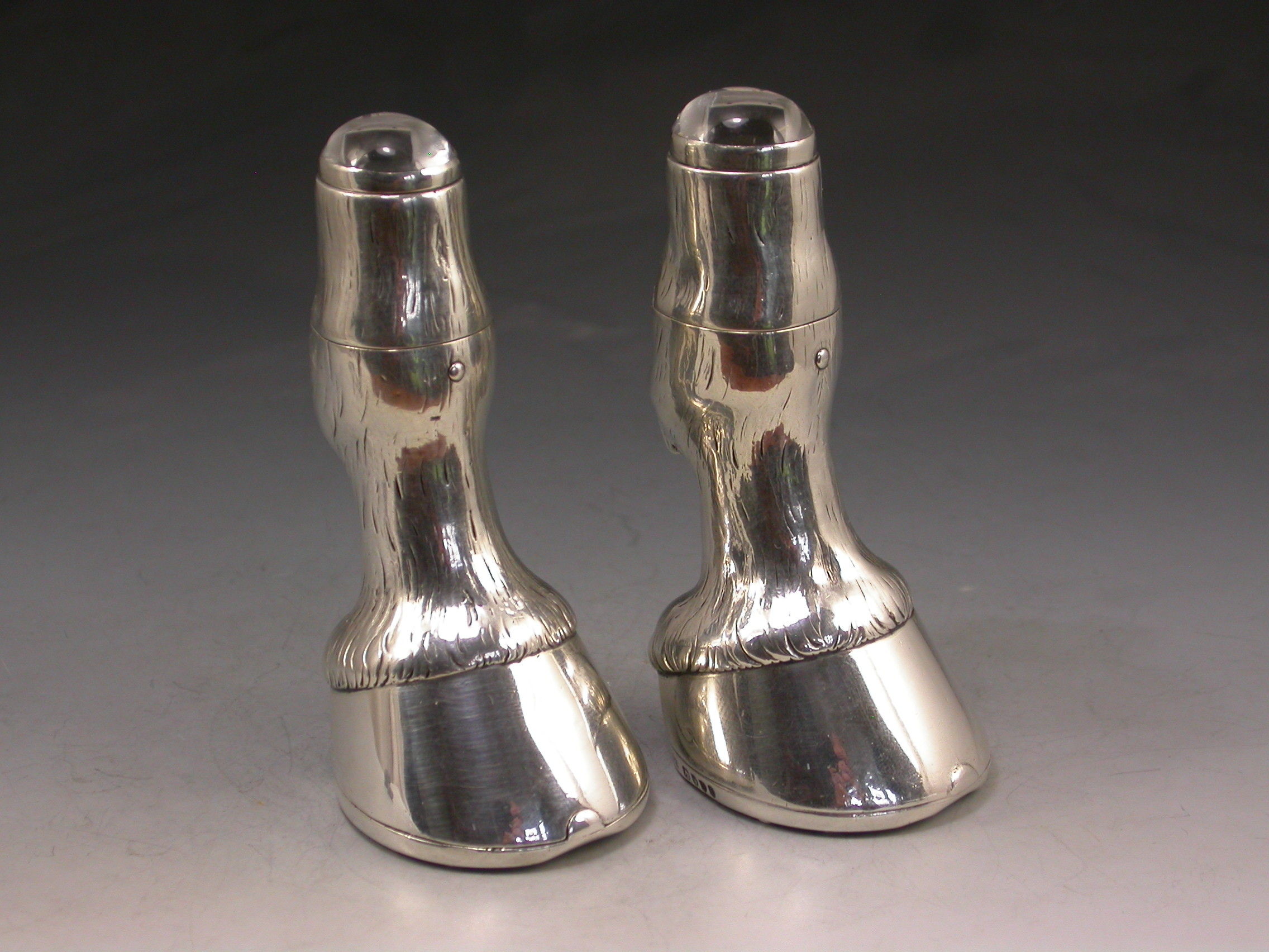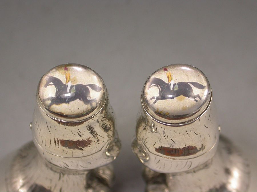 A rare and unusual pair of Victorian novelty silver Scent Bottles made in the form of horses hooves and fetlocks, the hinged lids mounted with domed crystal caps with watercolours of race horses beneath. One with a secondary hinged compartment to the base of the hoof possibly for a photograph or locket. Silver gilt interiors.
