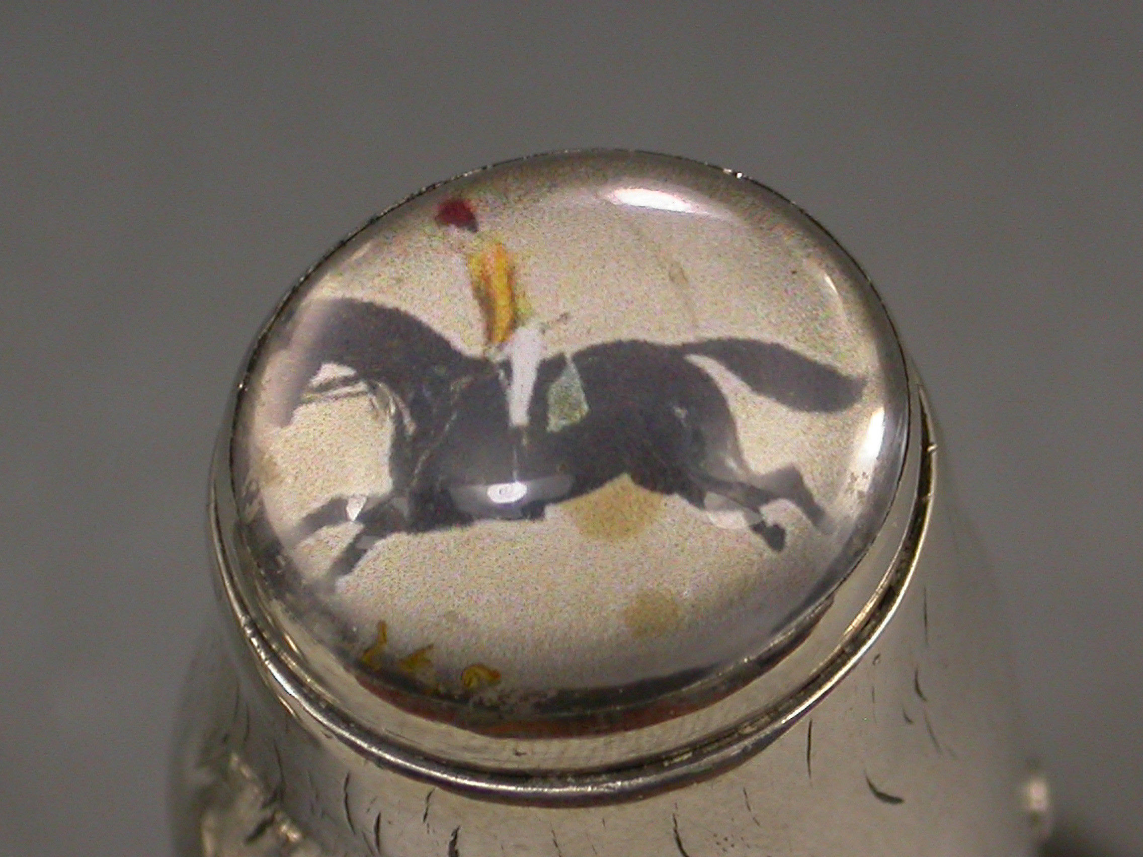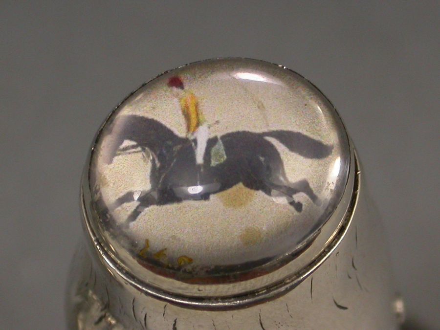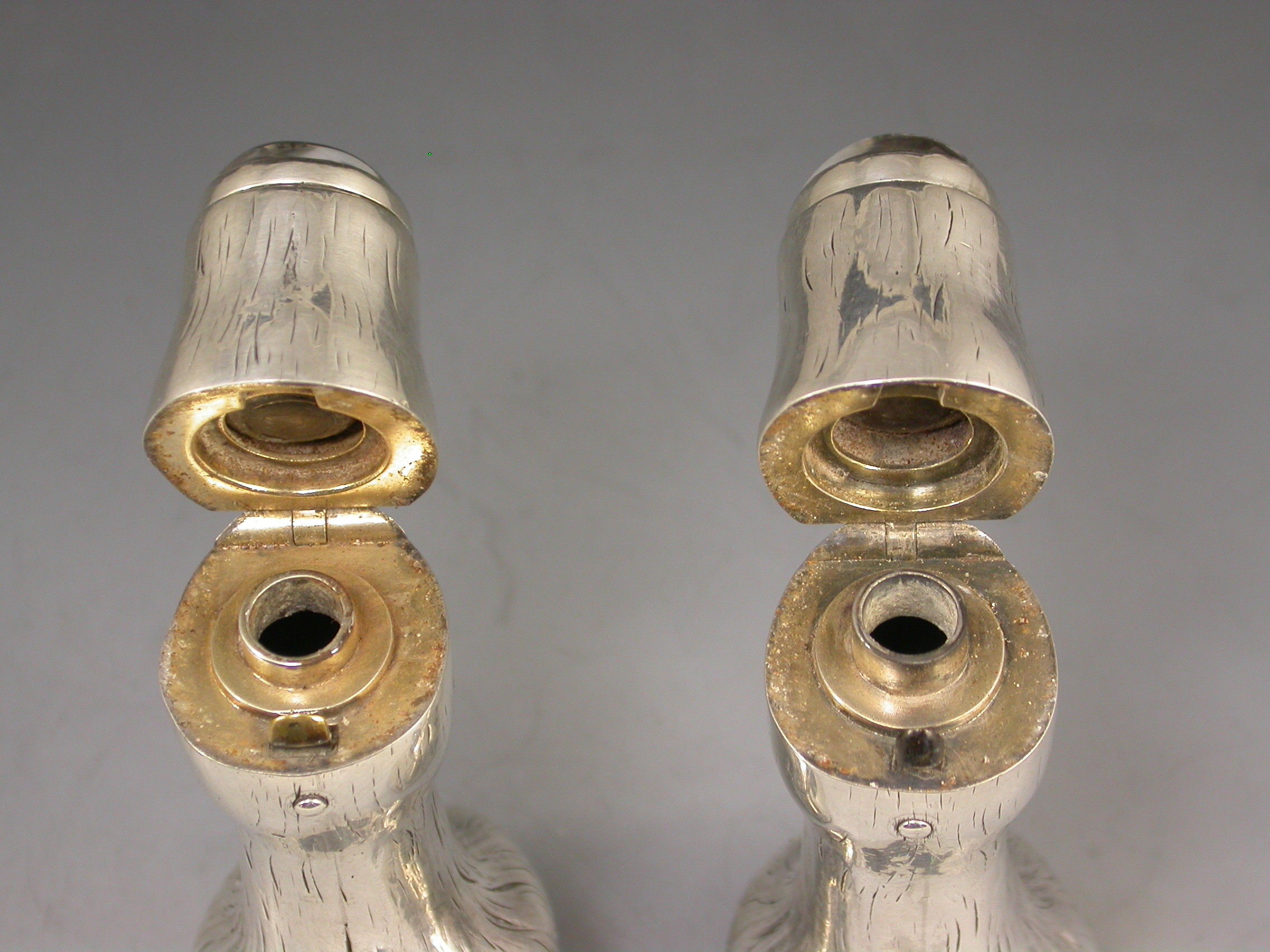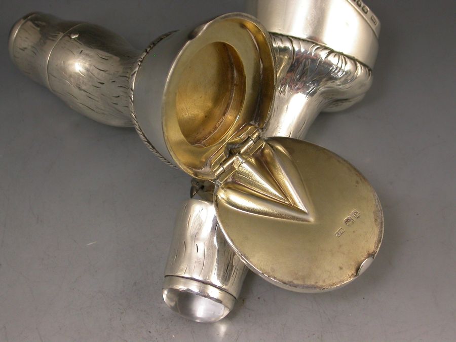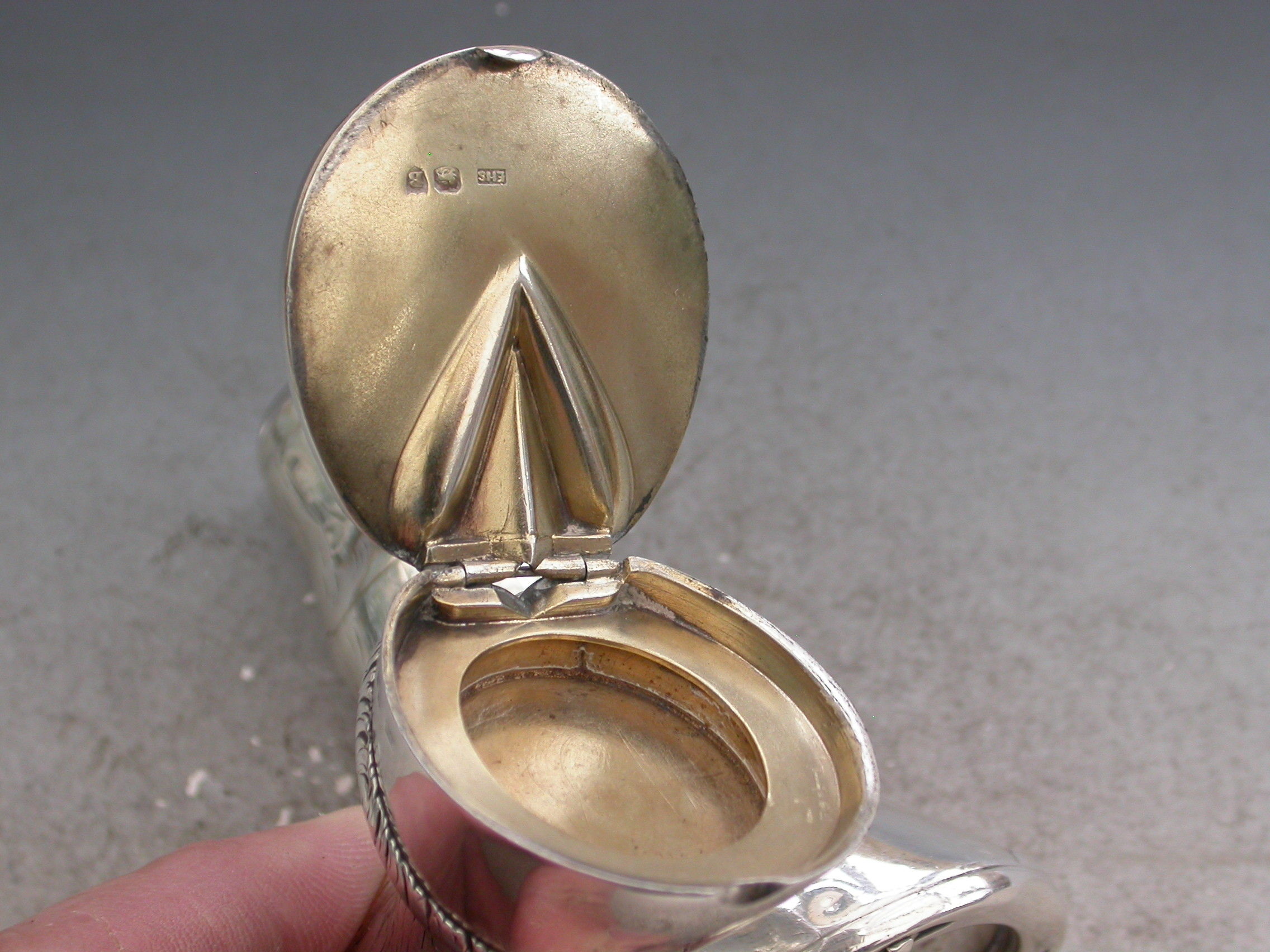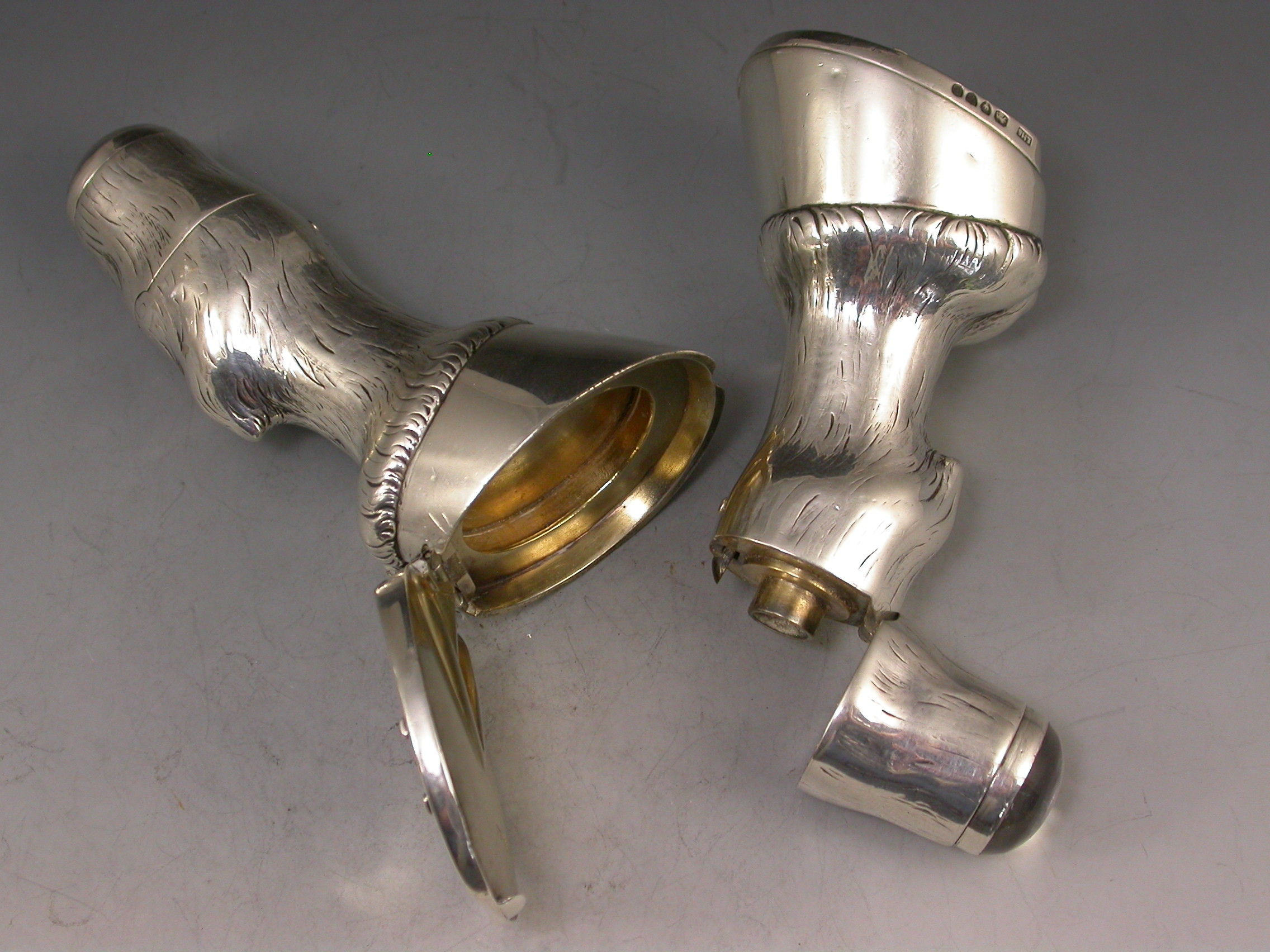 A rare and unusual pair of Victorian novelty silver Scent Bottles made in the form of horses hooves and fetlocks, the hinged lids mounted with domed crystal caps with watercolours of race horses beneath. One with a secondary hinged compartment to the base of the hoof possibly for a photograph or locket. Silver gilt interiors.