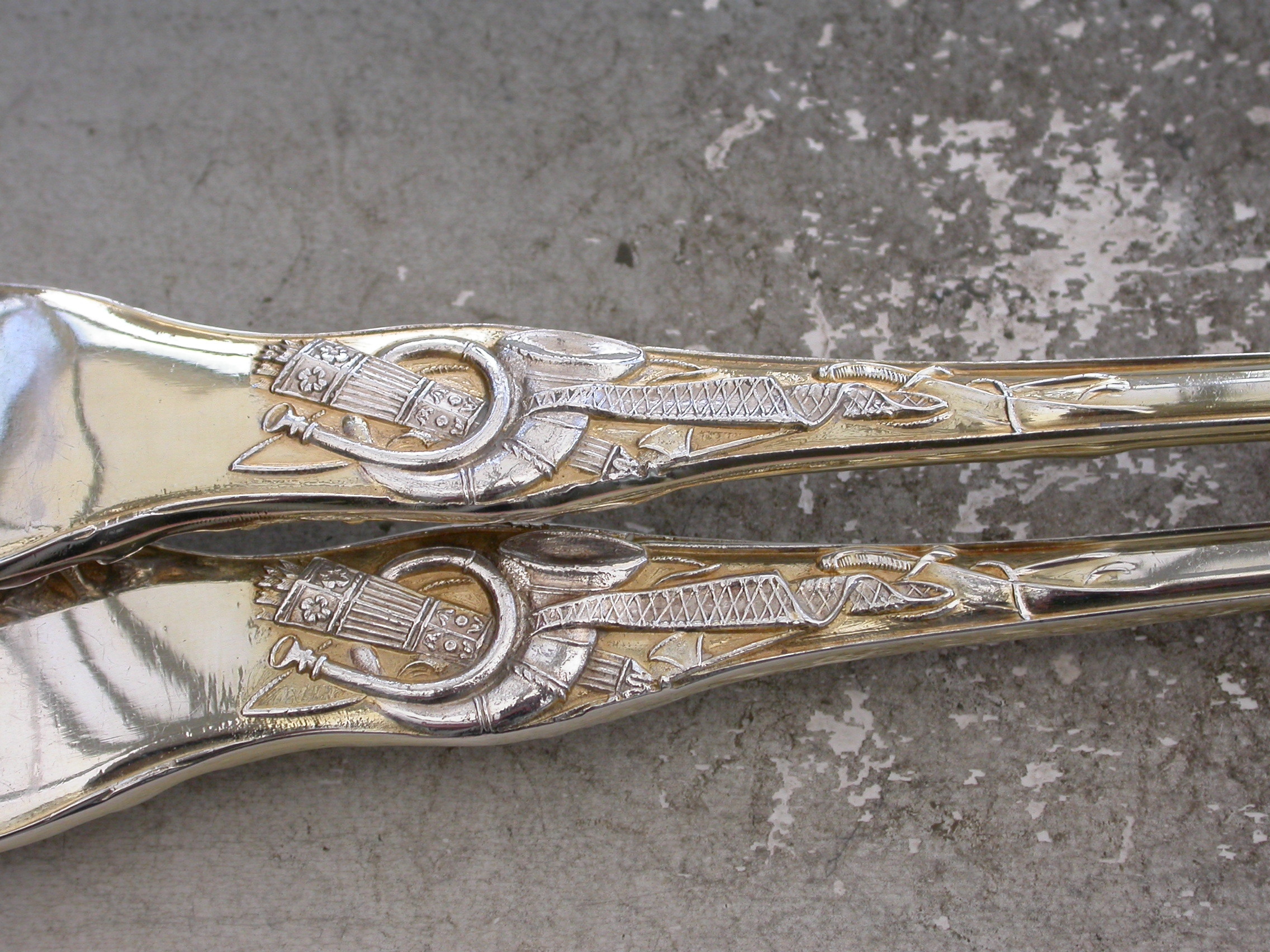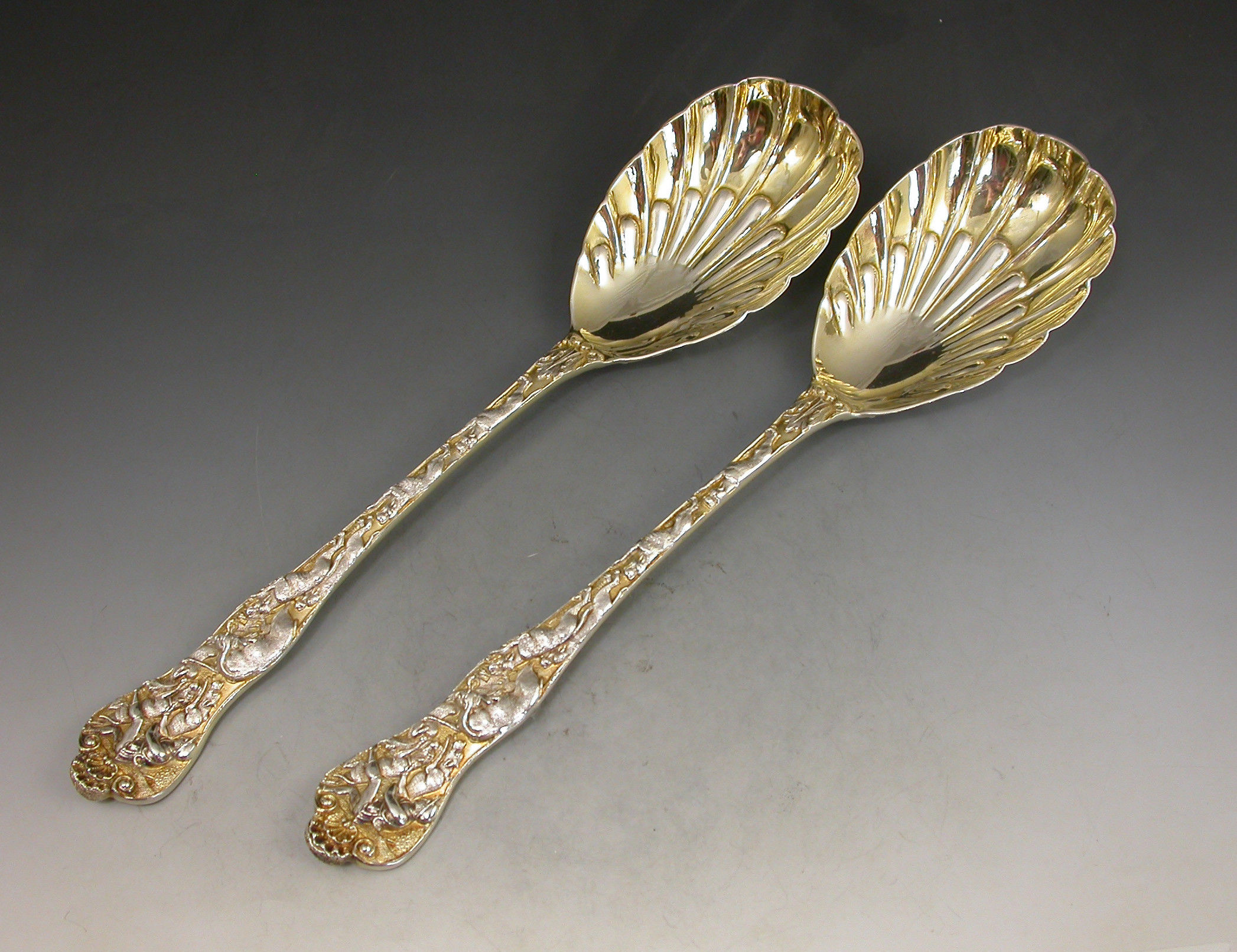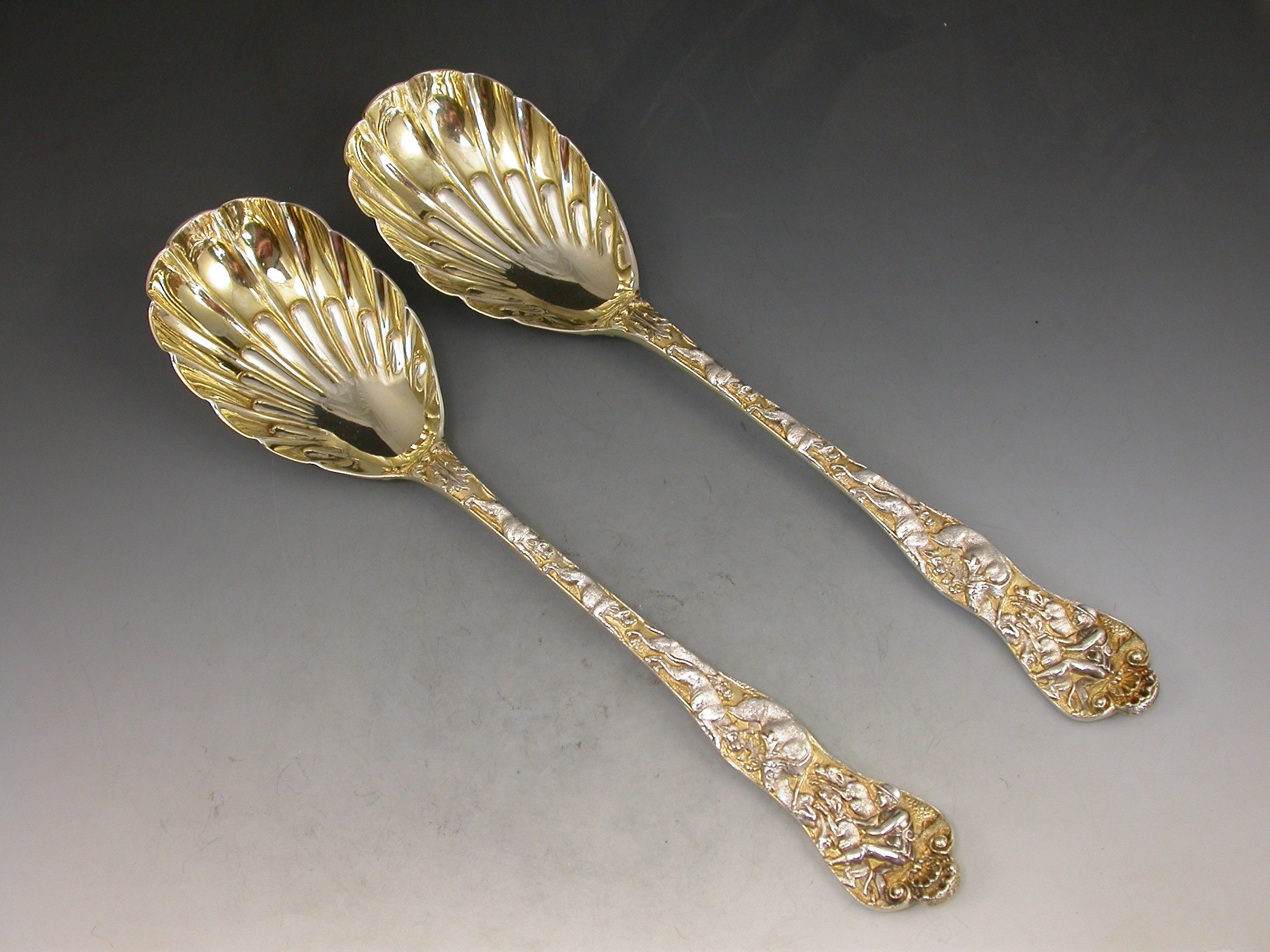 Pair Victorian Parcel Gilt 'Stag Hunt' Pattern Serving Spoons