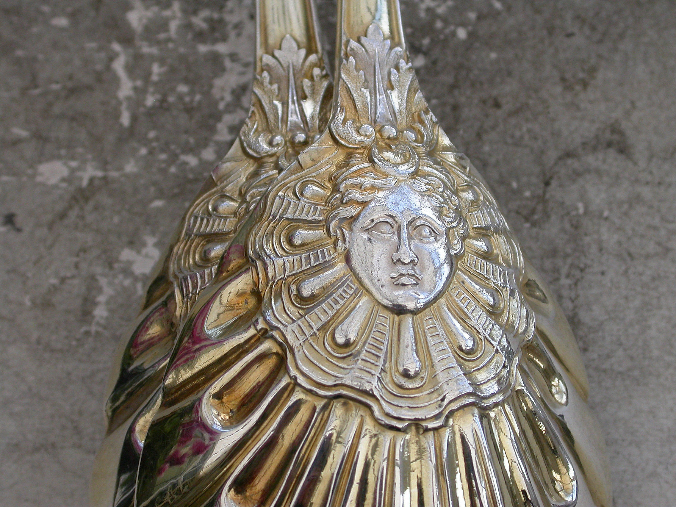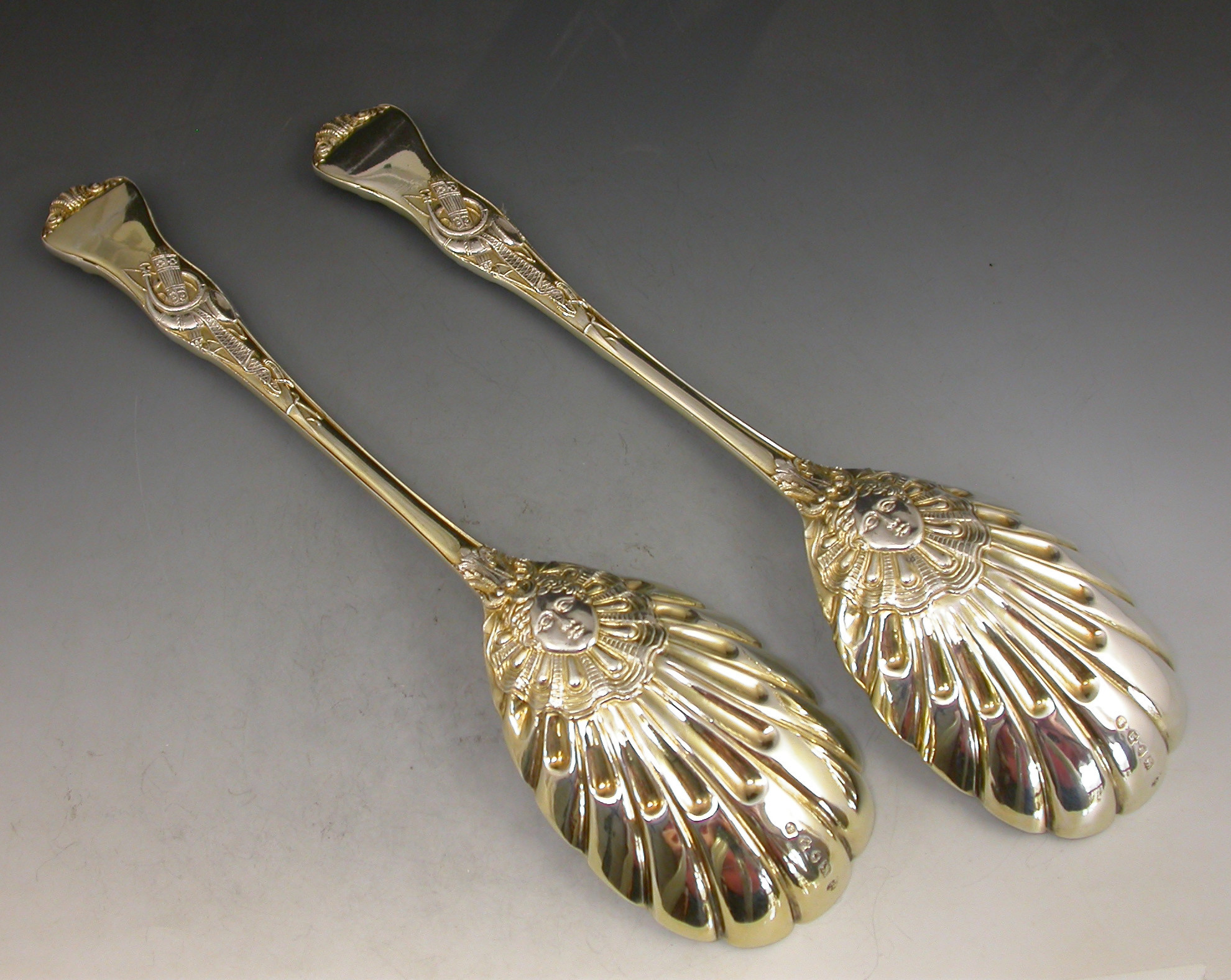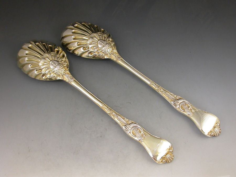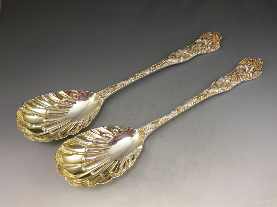 A fine quality pair of Victorian parcel gilt Serving Spoons in 'Stag Hunt' pattern with oval fluted bowls.