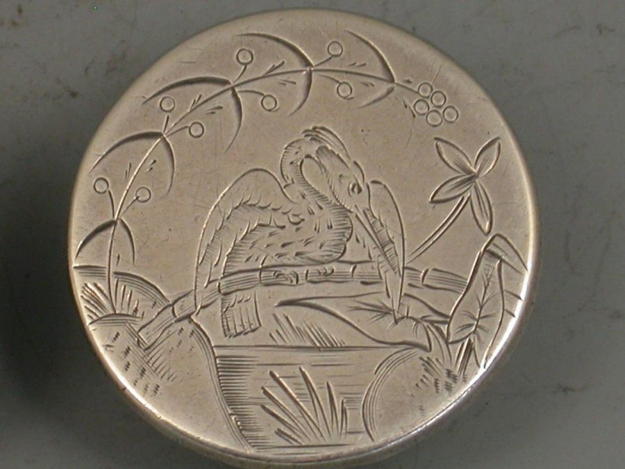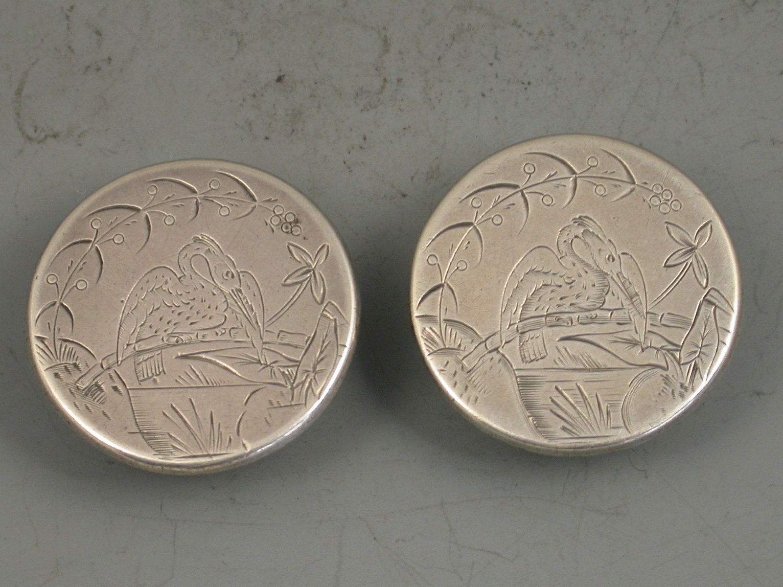 An interesting pair of 19th century silver Buttons / Studs engraved in the aesthetic style with Night Herons perched on a bamboo branch above a lake.