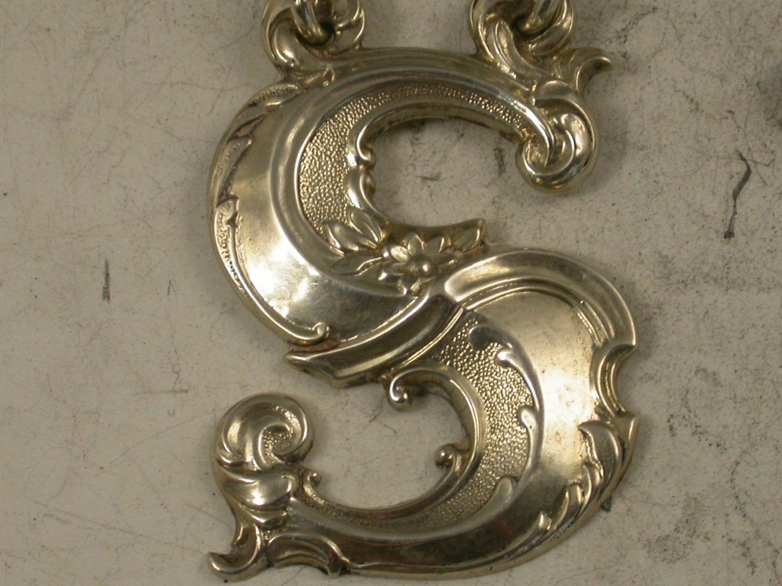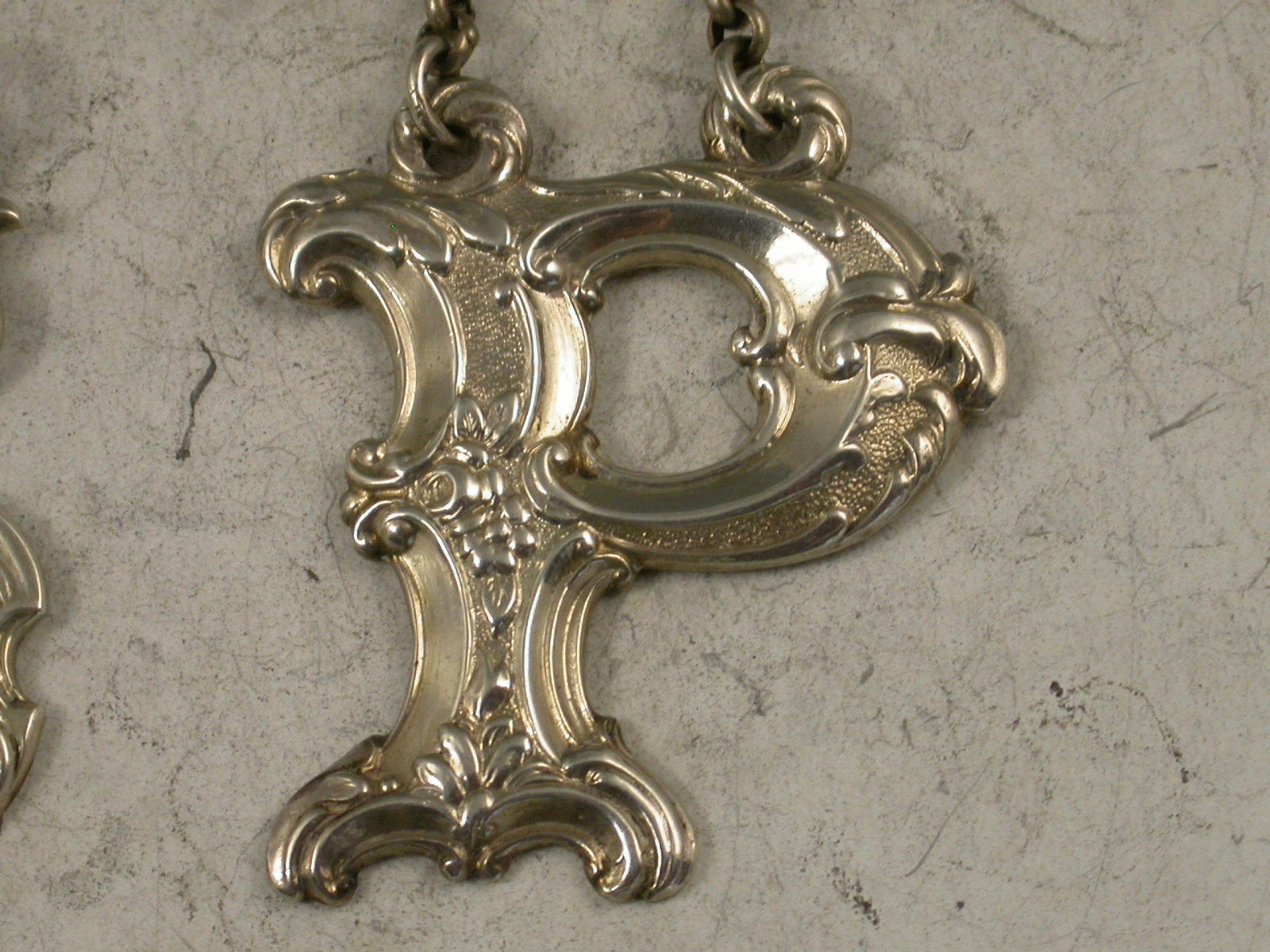 A good pair of Victorian Scottish silver initial letter Wine Labels for the capital letters 'S' & 'P' in a gothic style, moulded with flower heads, leaves and scrolls.