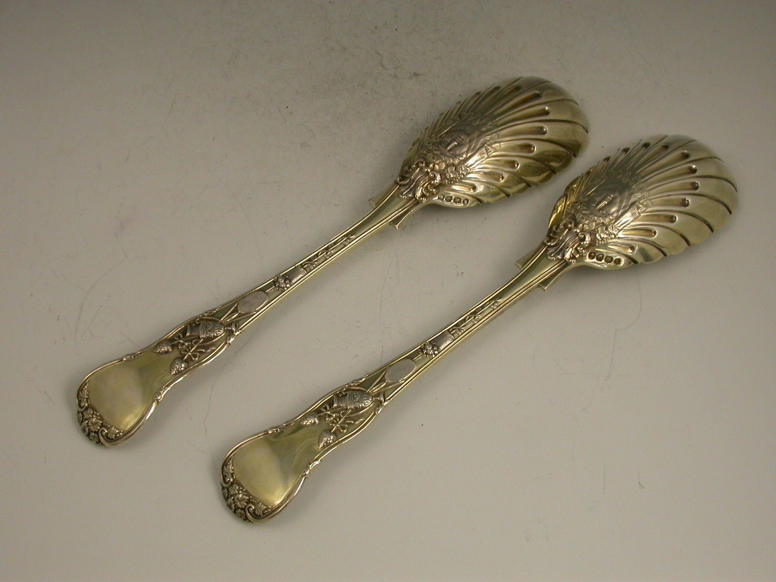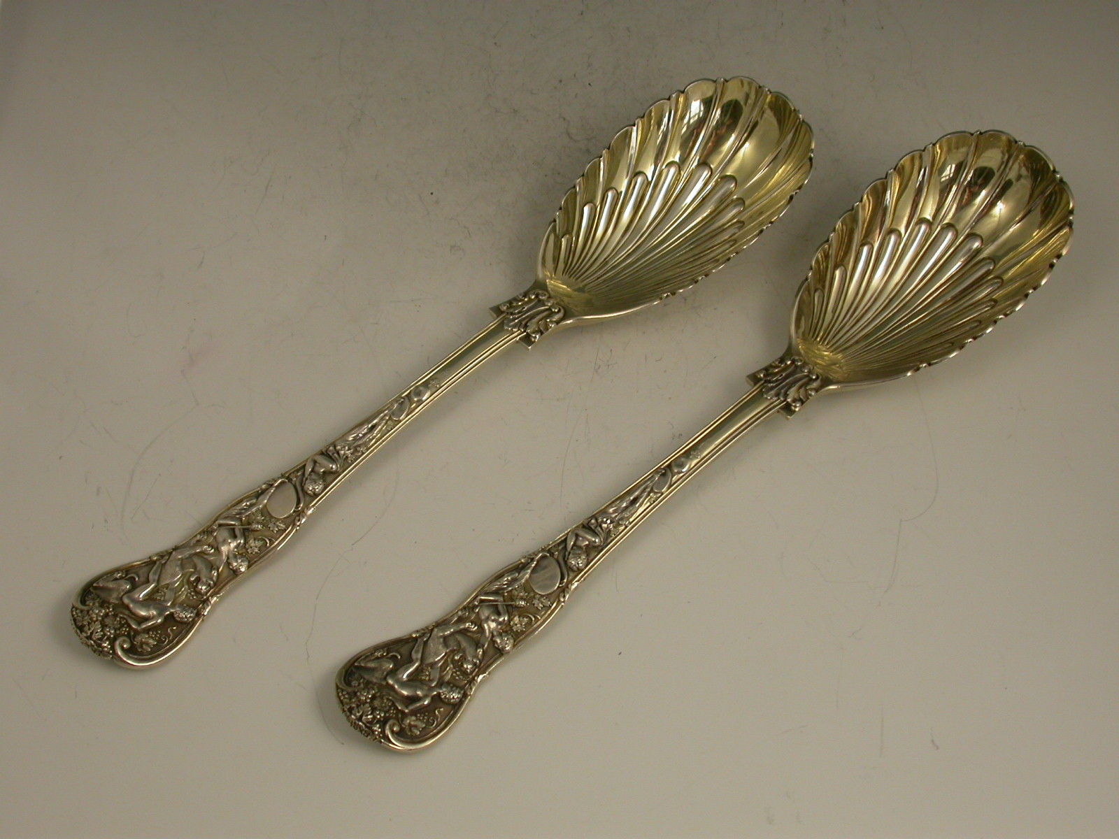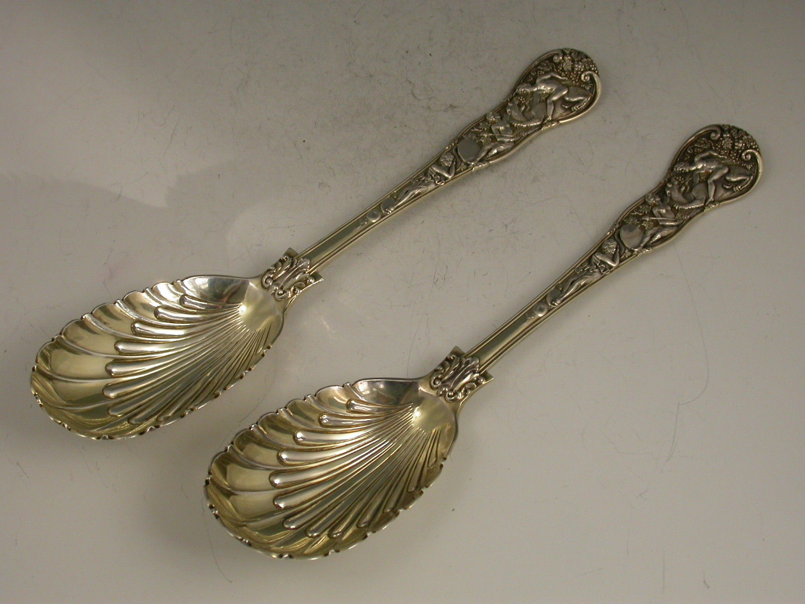 Pair Victorian Silver Gilt Bacchanalian Pattern Fruit Serving Spoons