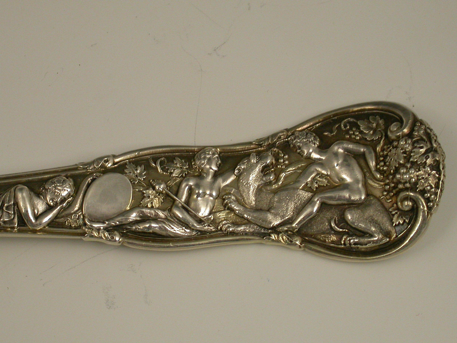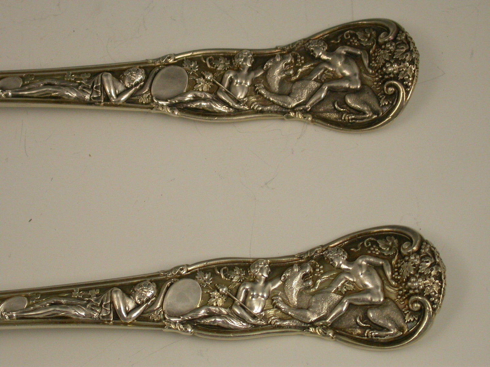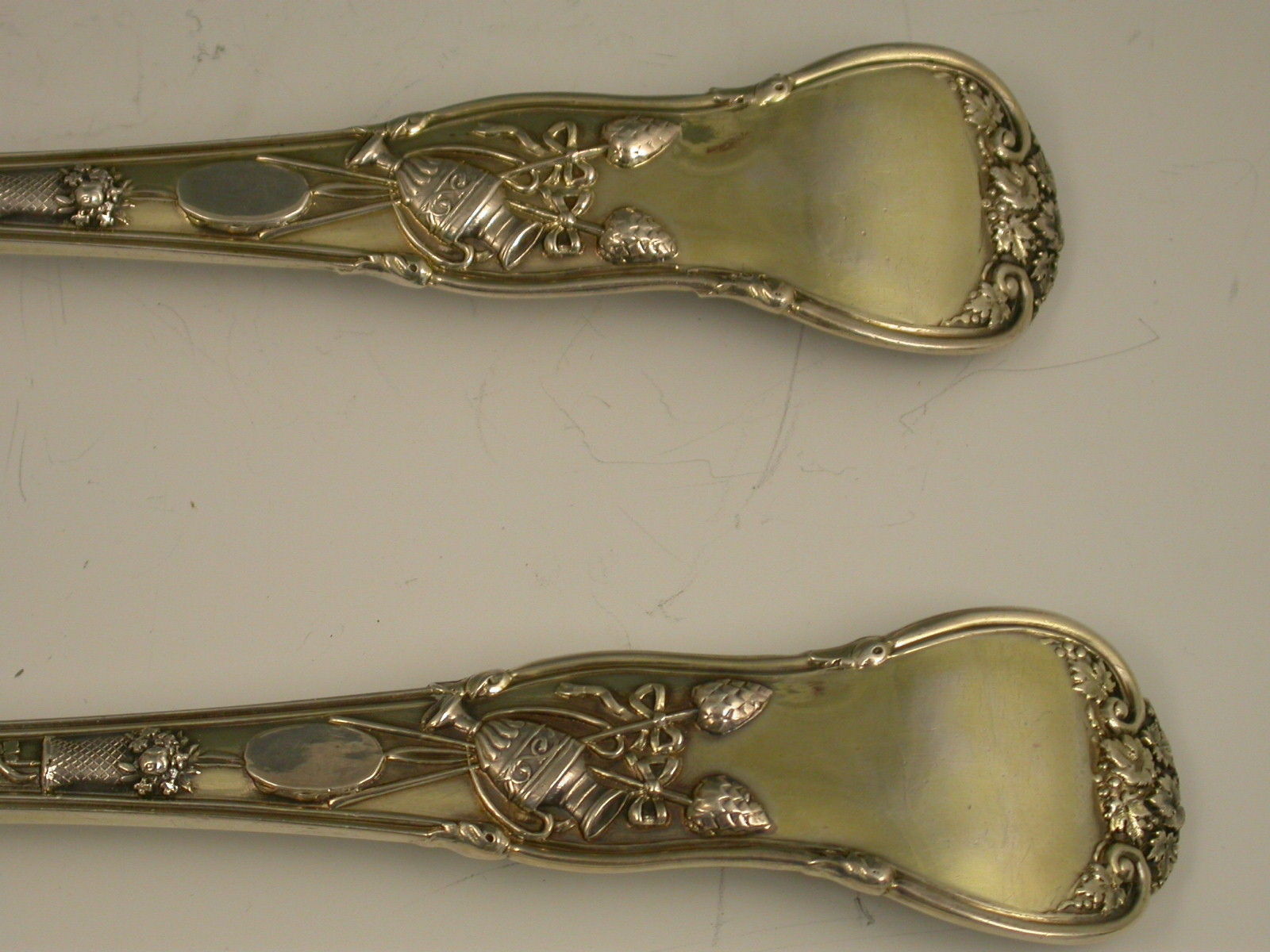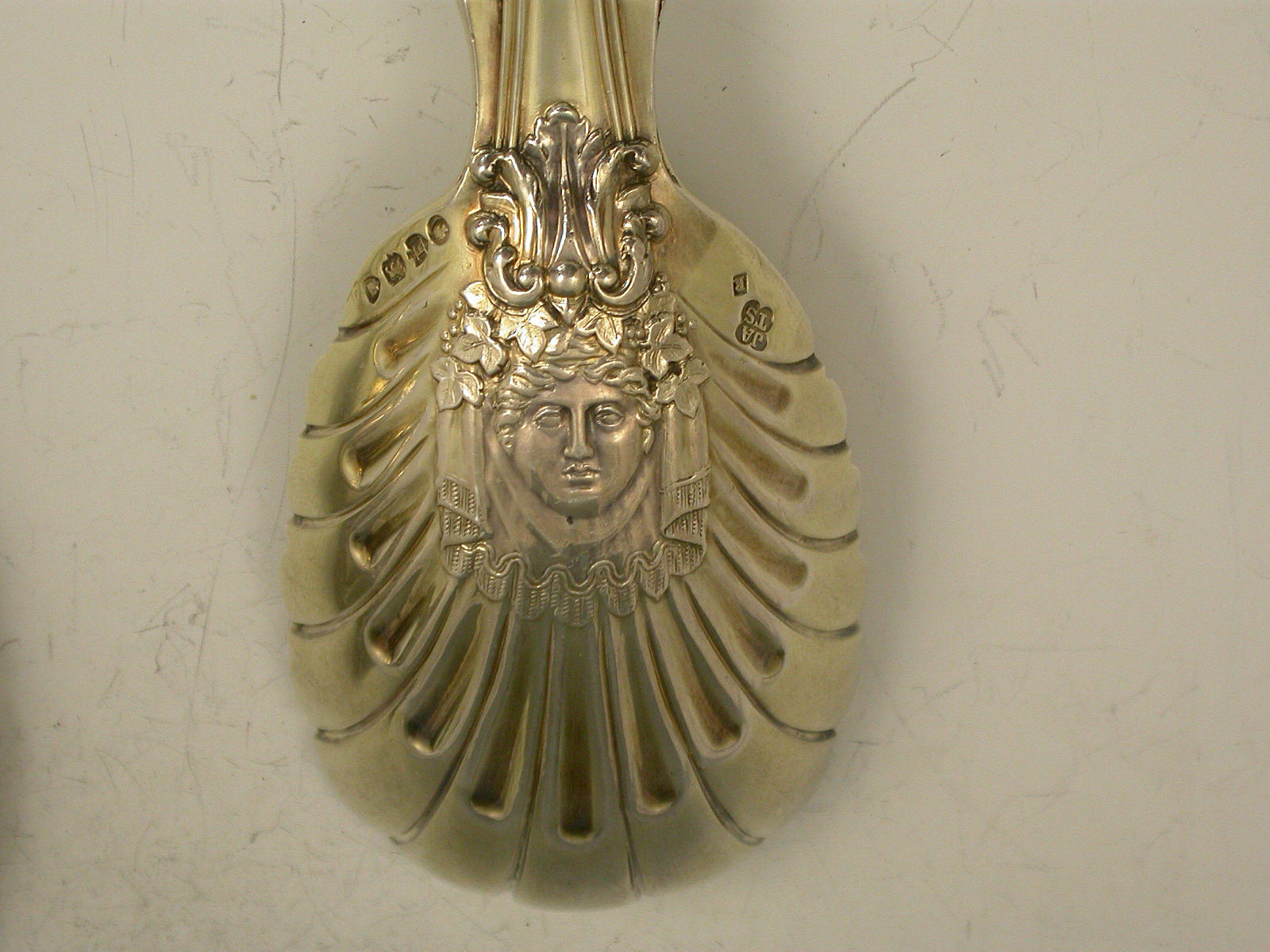 Pair Victorian Silver Gilt Bacchanalian Pattern Fruit Serving Spoons