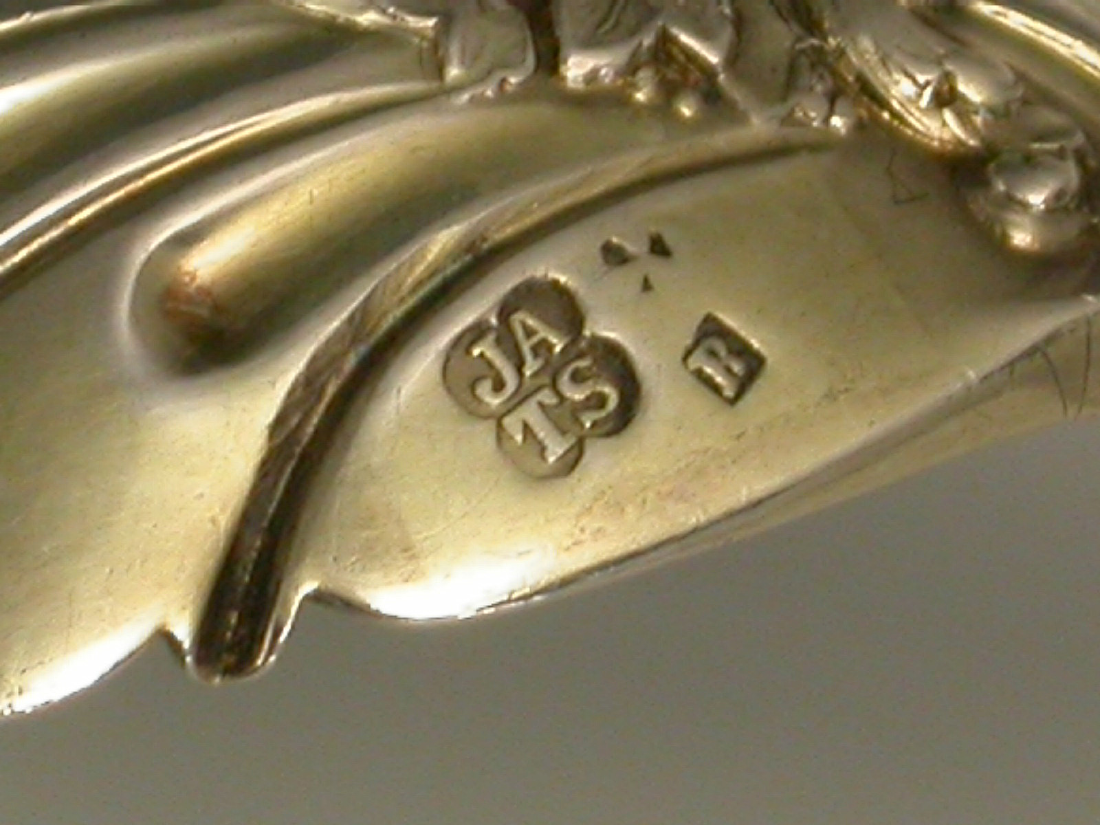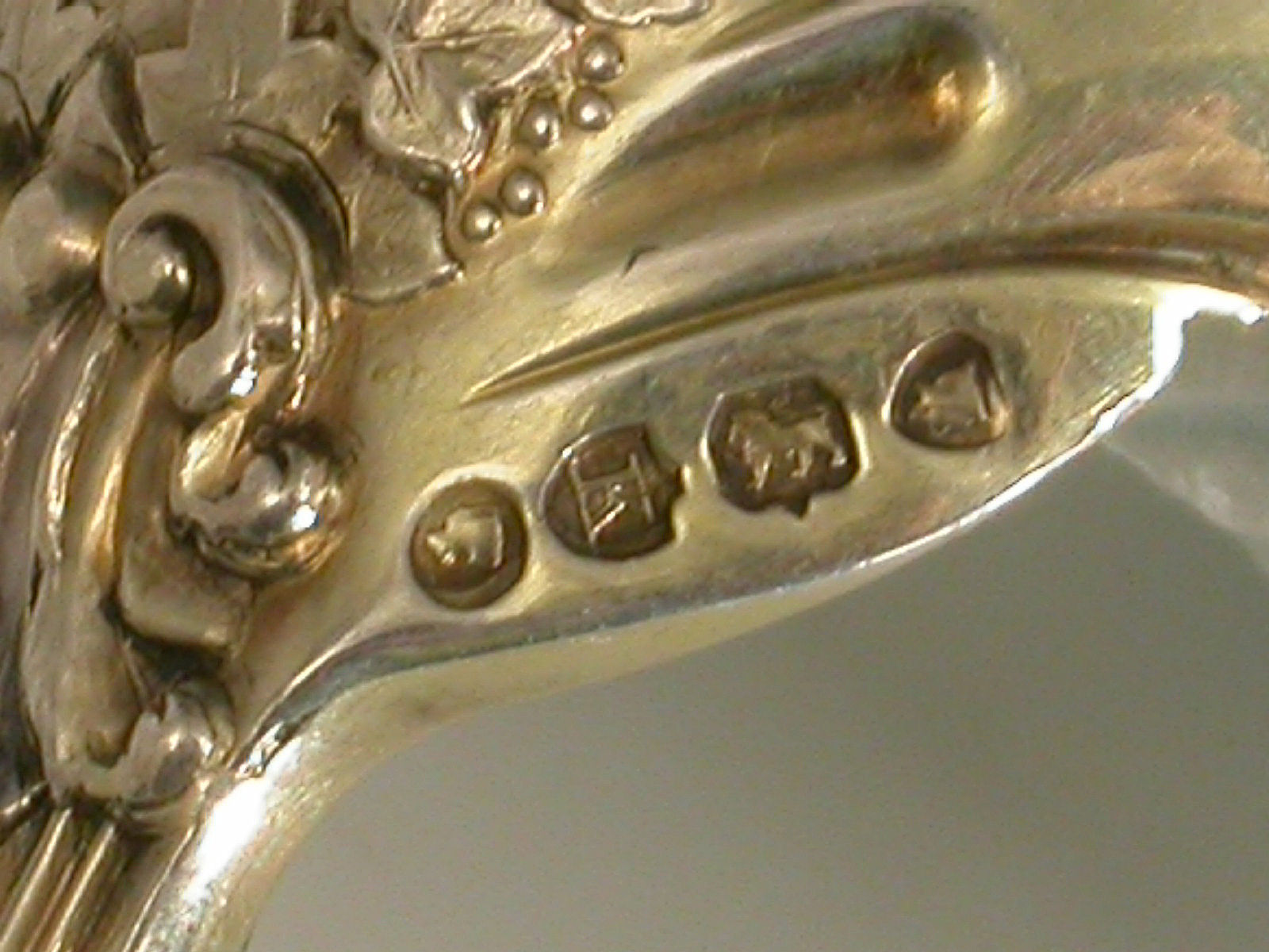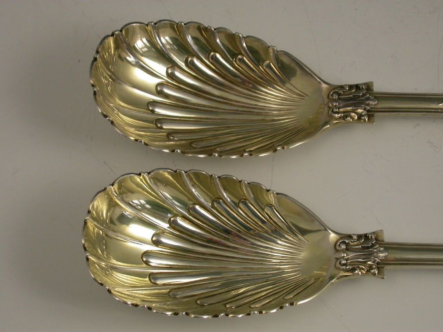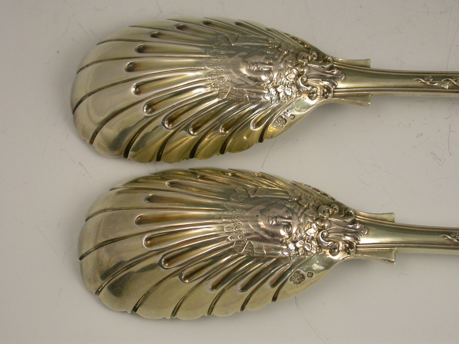 A fine quality and heavy pair Victorian cast silver gilt Bacchanalian pattern Fruit Serving Spoons with oval fluted bowls.