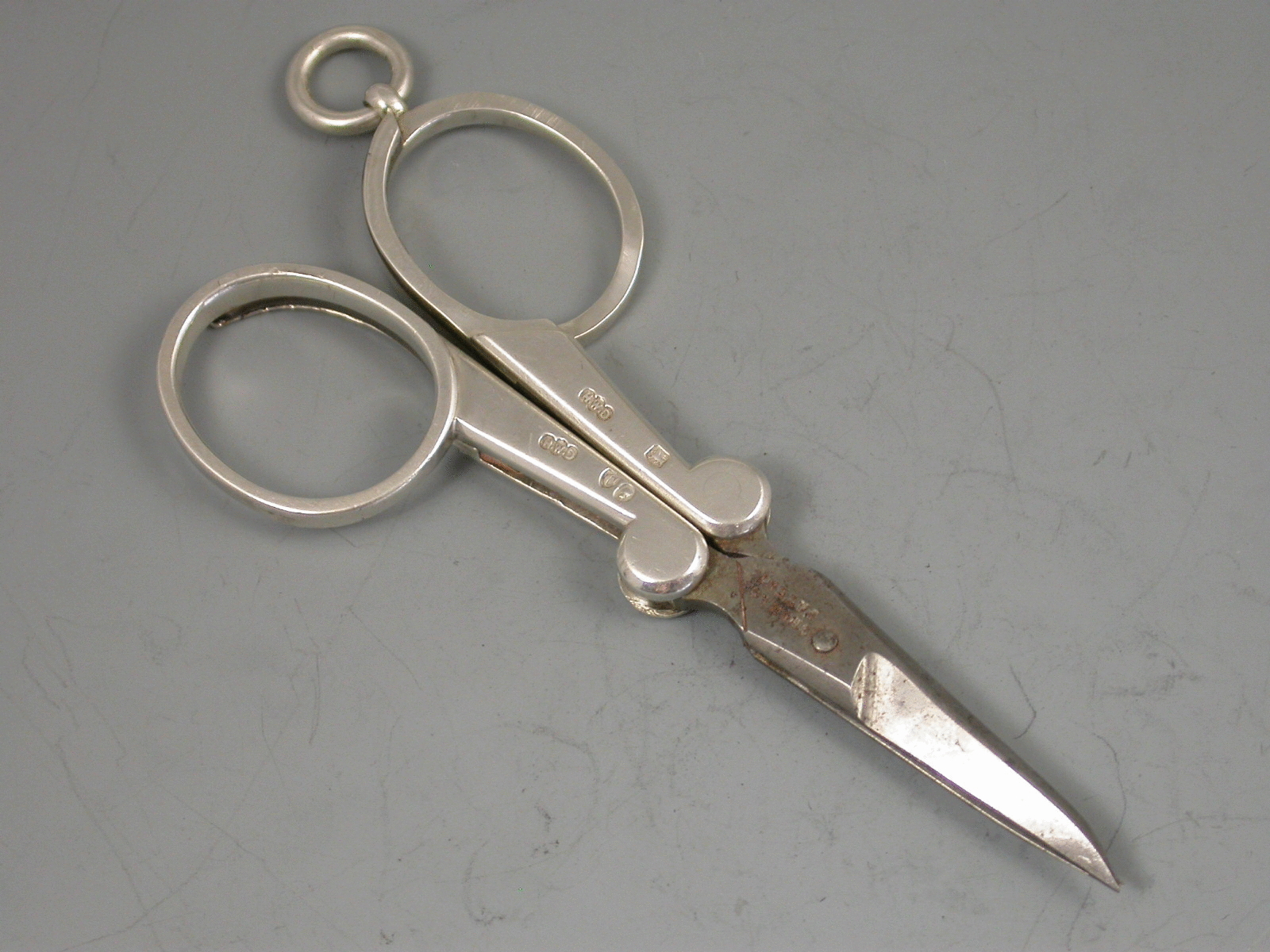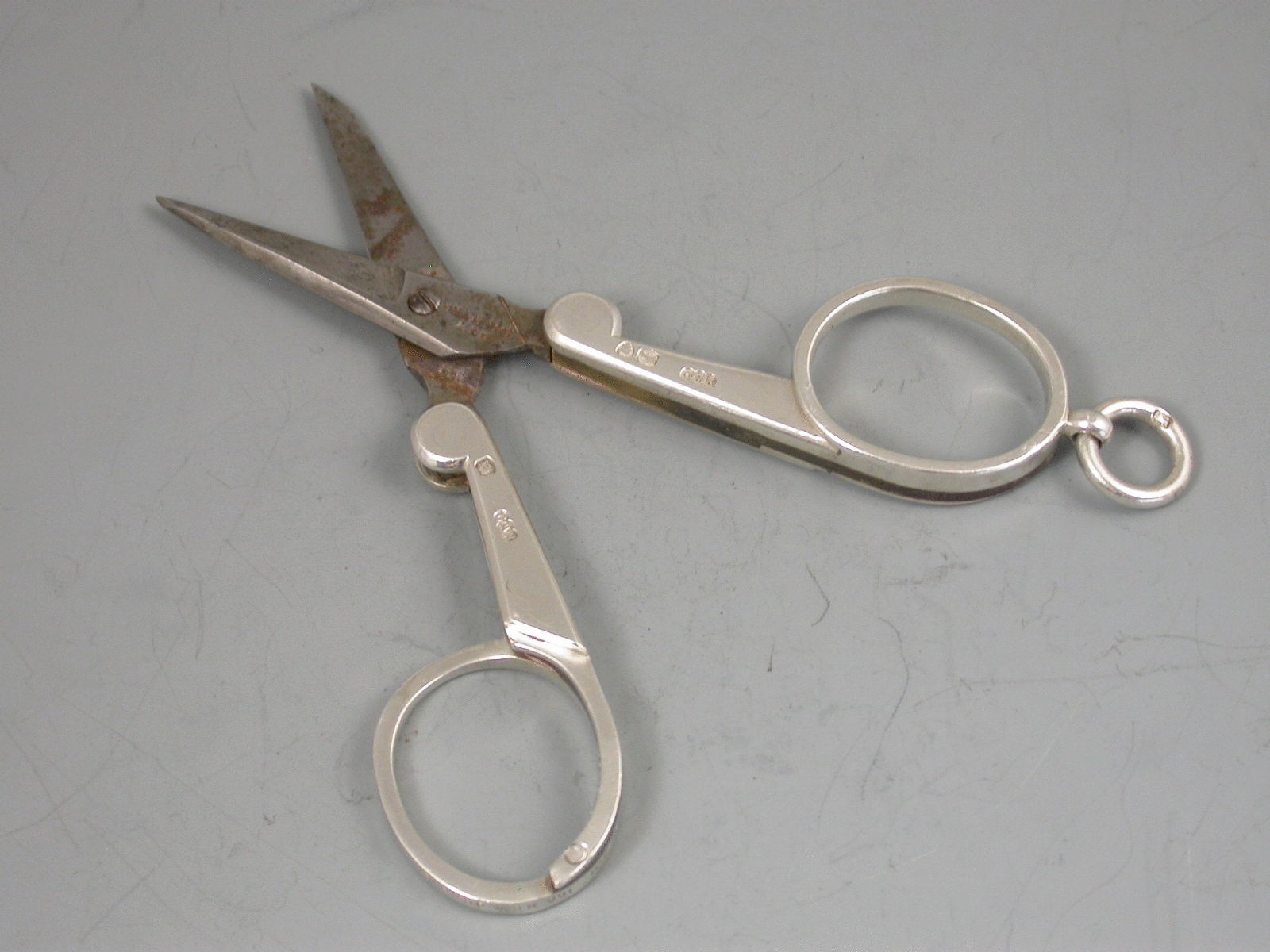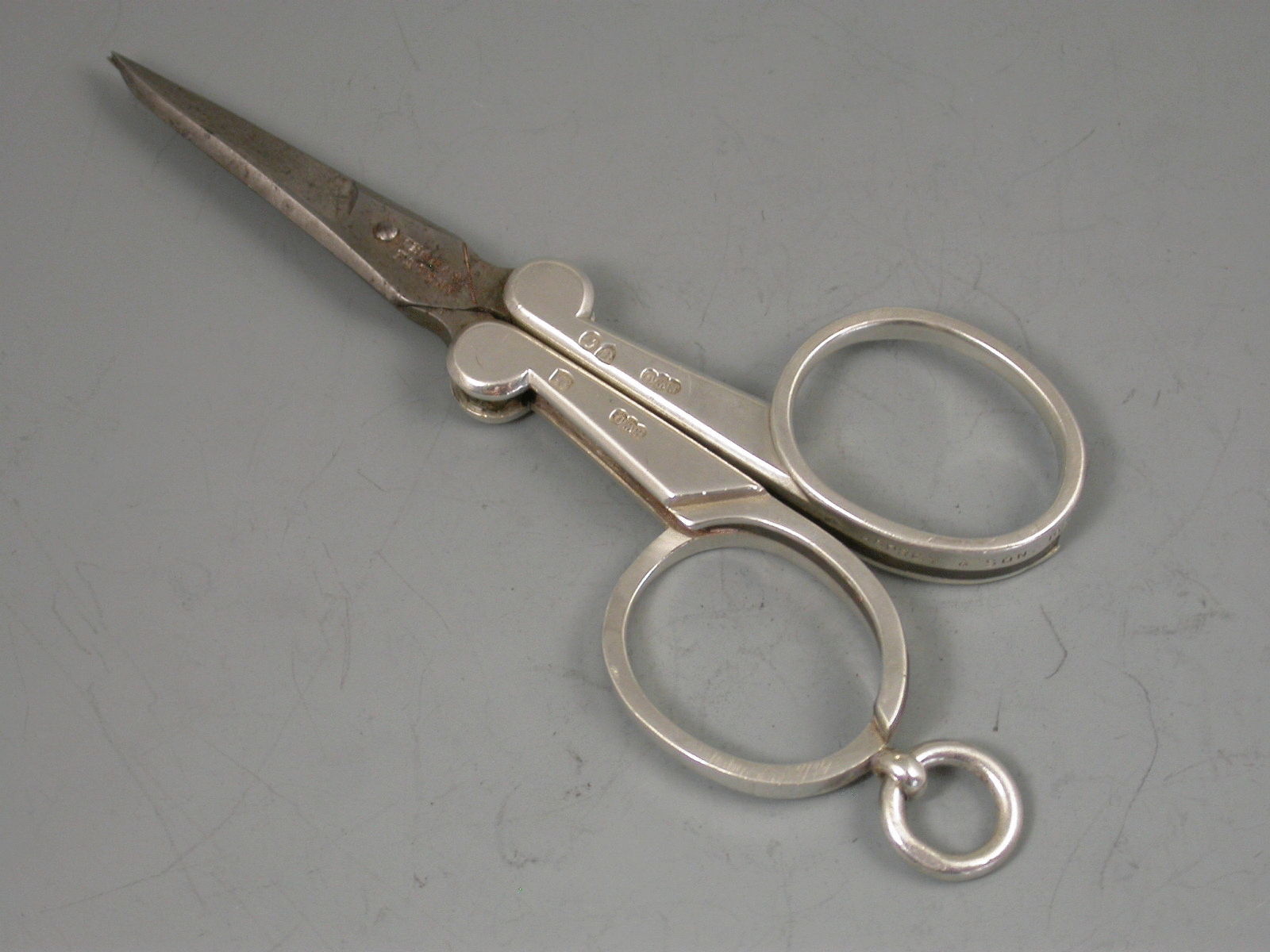 A good quality pair of Victorian silver mounted steel folding Scissors, with attached suspensory ring. The steel blades by Champion & Co.
