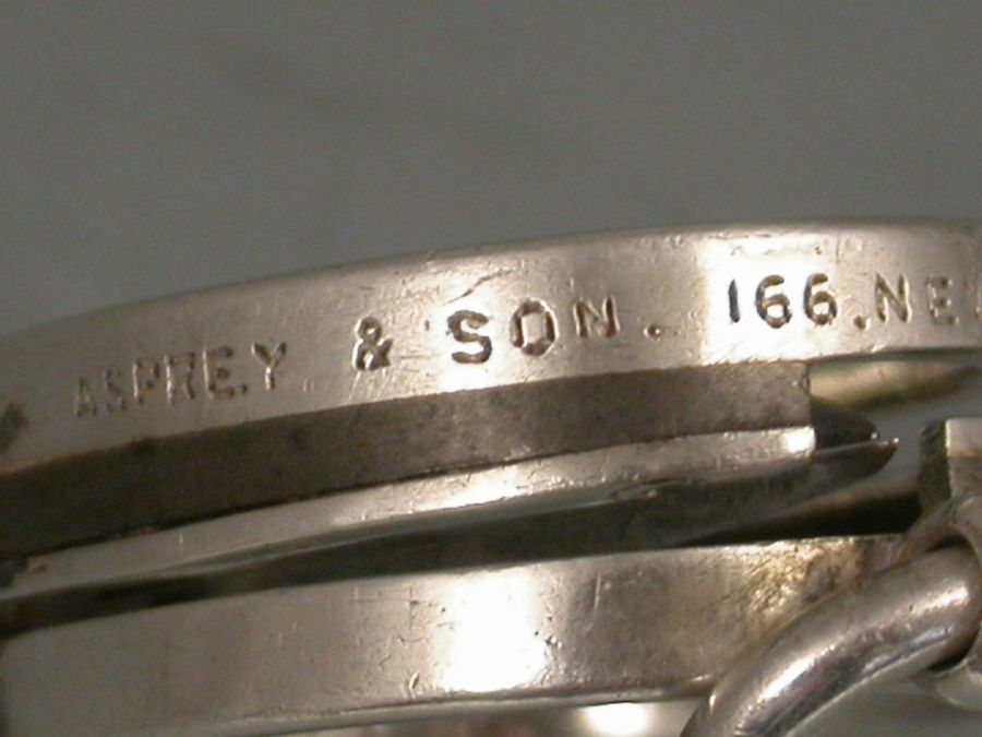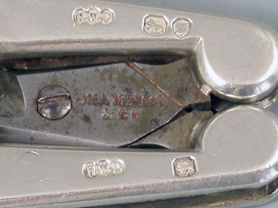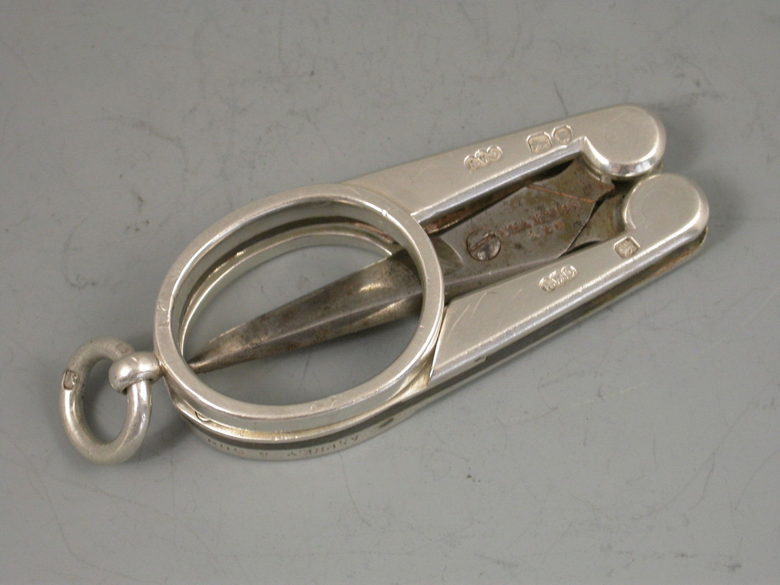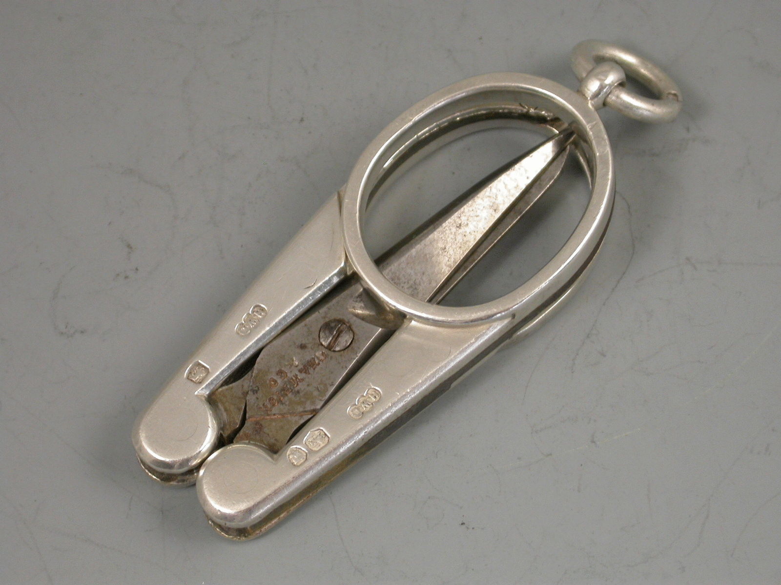 A good quality pair of Victorian silver mounted steel folding Scissors, with attached suspensory ring. The steel blades by Champion & Co.