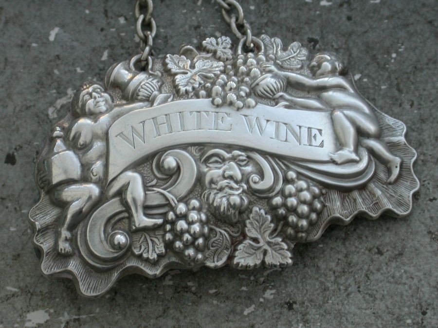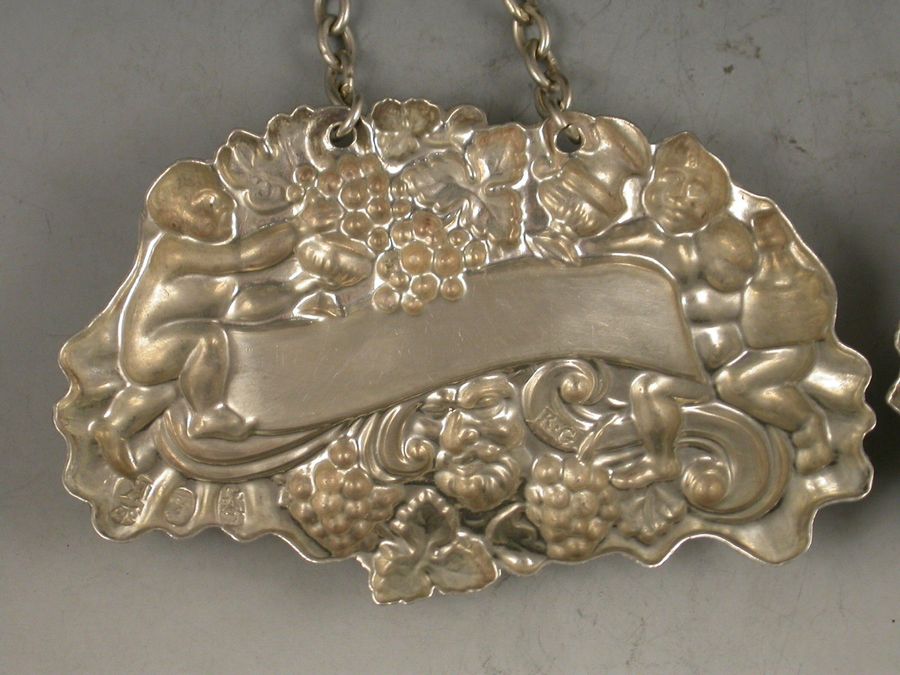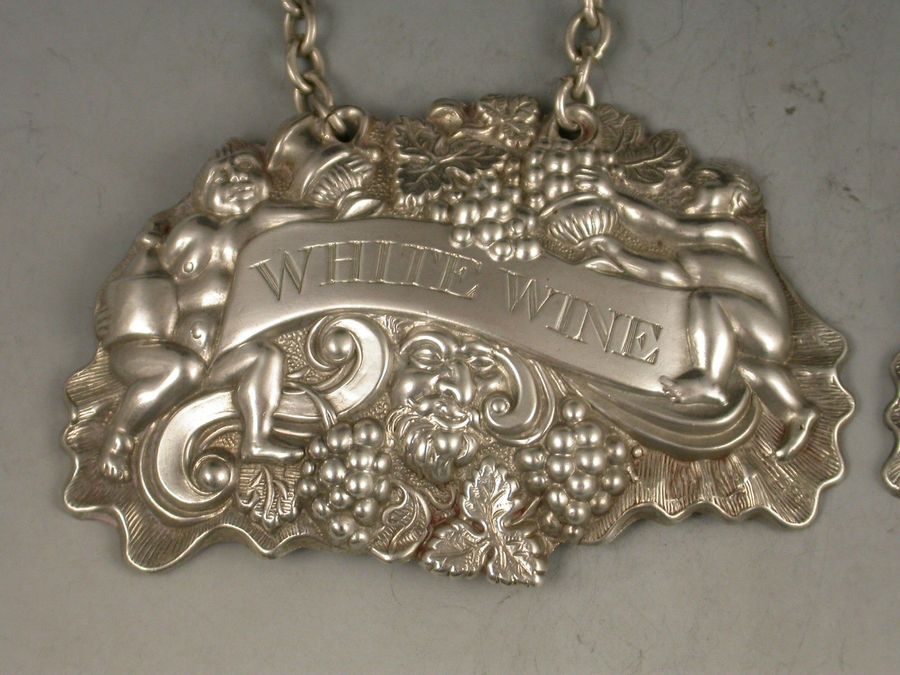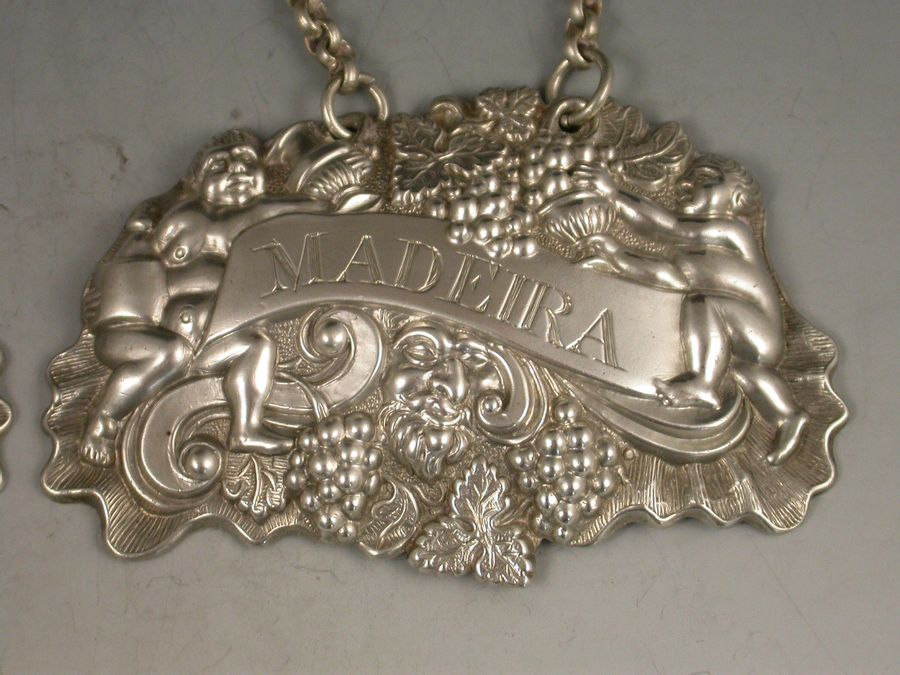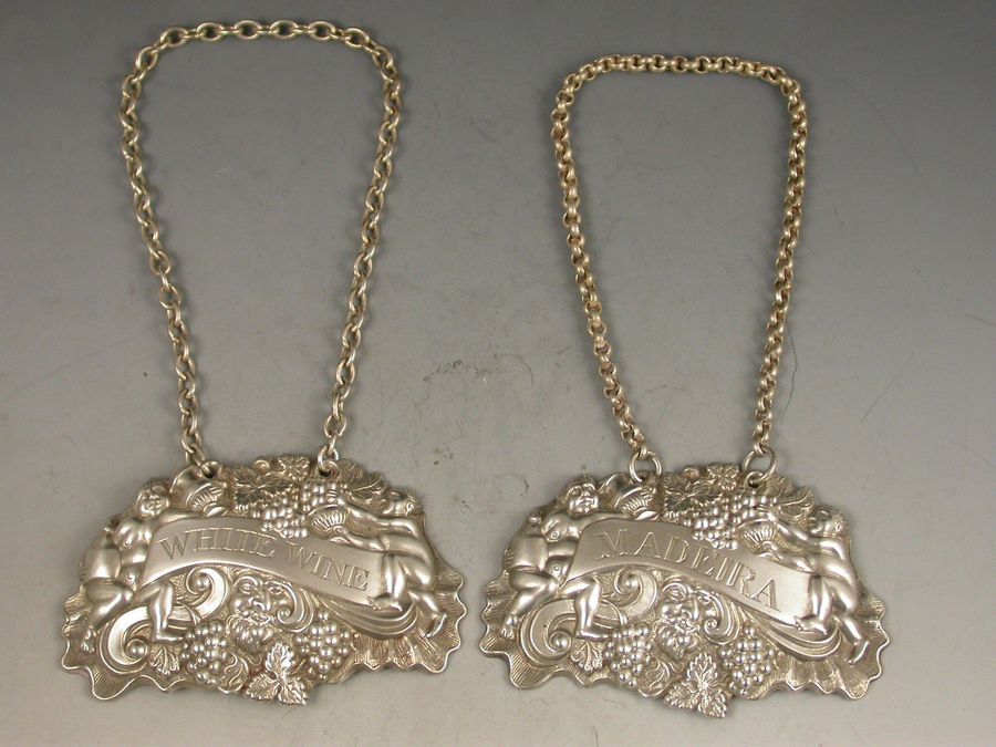 Pair William IV Provincial Silver Two Putti with Jug & Bottle Wine Labels 'Madeira & White Wine'